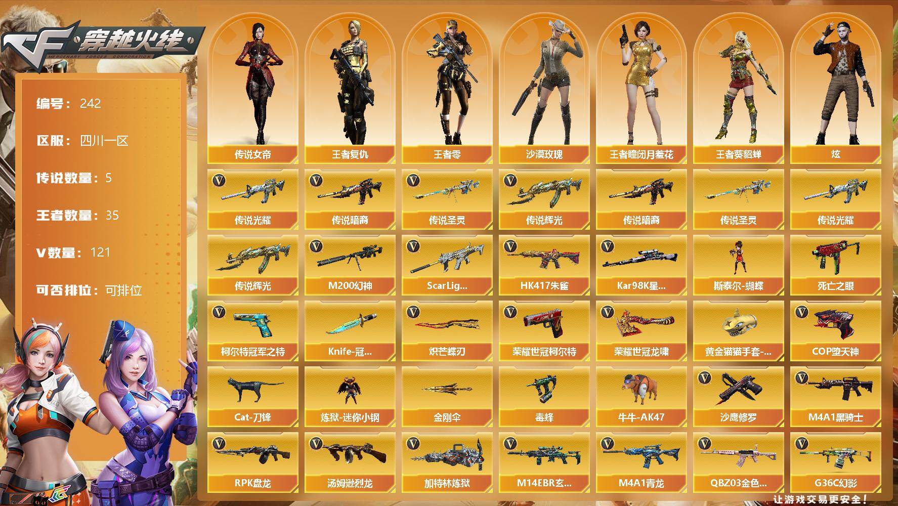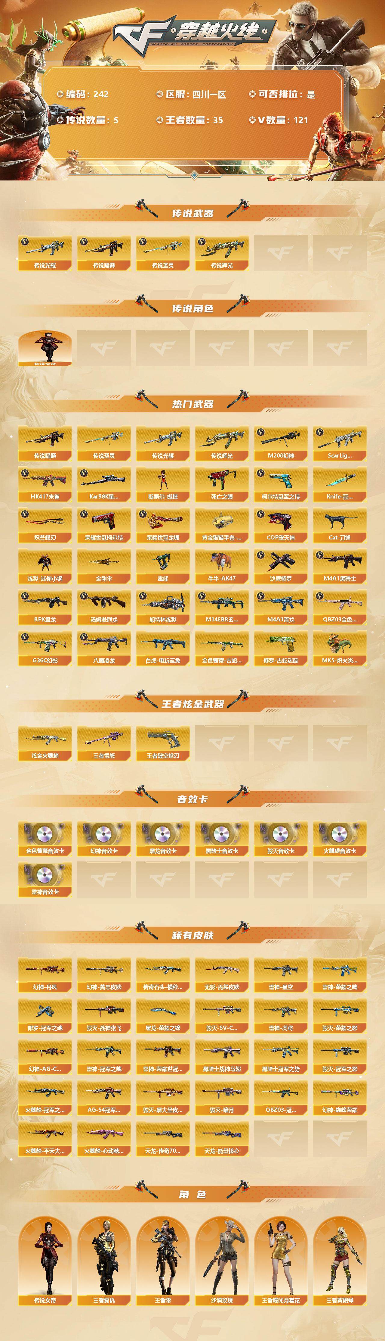 [12600079]【242】115V/102级/荣耀元首/5传说/35王者/1炫金/6英雄/传说光耀/传说暗裔/传说圣灵/传说辉光/传说女帝/G36C-幻影/QBZ03-金色蔷薇/M14EBR-玄武/Scar Light-白虎/HK417-朱雀/M4A1青龙/M200-幻神/金色蔷薇-古蛇迷踪/修罗-古蛇迷踪/八面凌龙/死亡之眼/白虎-电玩蓝兔/柯尔特-冠军之特/柯尔特-荣耀世冠/Kar98k-星神/Cat-刀锋/炼狱-迷你小钢/毒蜂/牛牛-AK47/M4A1-黑骑士/汤姆逊-烈龙/RPK-盘龙/加特林-炼狱/斯泰尔蝴蝶/MK5-炽火炎龙/COP-堕天神/沙鹰-修罗/Knife-冠军之刃/炽芒蝶刃/龙啸-荣耀世冠/黄金猫猫手套-白鲨/金刚伞/炫金火麒麟/王者雷怒/王者破空枪刃/M200-幻神音效卡/AK47-火麒麟音效卡/M4A1-雷神音效卡/M4A1-黑龙音效卡/M4A1-黑骑士音效卡/Barrett-毁灭音效卡/金色蔷薇音效卡/M200-幻神-黄忠/幻神-AG-CFPLS17冠军/幻神丹凤/幻神-巅峰荣耀/QBZ03冠军之薇/雷神荣耀之魄/雷神-星空/雷神-虎将/雷神冠军之魄/雷神-荣耀世冠AG/火麒麟-冠军之心/传奇石头-横秒之巅/火麒麟-平天大圣/火麒麟-心动糖果/黑骑士-冠军之势/黑骑士-战神马超/黑骑士-AG-S4冠军典藏/毁灭-暗月/毁灭-荣耀之怒/毁灭-冠军之怒/毁灭-CFPLS16皮肤/毁灭-战神张飞/毁灭-黑大圣皮肤/天龙-能量核心/AWM-天龙-传奇70KG/无影-霓裳皮肤/修罗-冠军之魂/屠龙-荣耀之锋/王者-瞳-闭月羞花/王者-葵-貂蝉/王者-零/王者复仇/王者-魅影/炫/沙漠玫瑰/幽/鹰/隼/雨墨/战地猎狐/蜀雪/铁骑荣耀/灵动武士/职业选手/M37-葵/迷你深渊冰龙/迷你超能女侍/迷你裂空之翼/黄金迷你裂空之翼/迷你波特博士/迷你曼提柯尔/迷你火种/迷你生化手雷/生化手雷-机甲核心/闪光弹-貂蝉/高爆手雷-大乔/超级对讲机/6盘龙/5烈龙/神圣爆裂者/机甲撕裂者/神圣爆裂者-末日/阐释者/试炼破坏者/VEPR-12-金魔/冰龙粉碎者-白马银枪/火狱乱世-超越/幻灵之锋/Barrett-电竞装甲/柯尔特-电竞装甲/尼泊尔-电竞装甲/M4A1-夜魔/破空枪刃-夜魔/马来剑夜魔/斩神刀-雷暴/荣耀世冠-柯尔特/荣耀世冠-龙啸/M4A1-雷神/M4A1-黑龙/