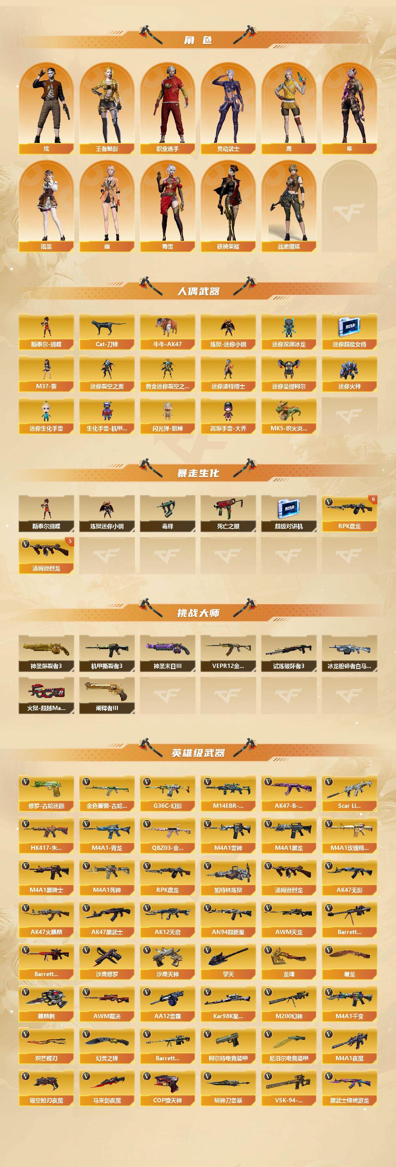 - [12060354]可二次 可修改实名 V9 17王者武器 199英雄武器 6英雄角色 364万化 大师 武器:王者之心,王者之影,王者之翼,王者之圣,王者之魄-冠军珍藏,王者之神,王者幻神,王者之狱,王者之烈,M4A1-星象,M4A1-武圣,AK47-奉先,81式-光明之神,KSG-孟获,王者之魂,王者之轮,王者之击,王者之锋,COP 357-雷霆,巴雷特-金色蔷薇,AK47-黑武士觉醒,AK47-火麒麟,AK47-无影,AK47-燎天净火,AK47-变色龙,M4A1-竞界荣光,M4A1-死神,M4A1-雷神,M4A1-黑龙,M4A1-黑骑士,M4A1-游骑兵,AK47-木兰,QBZ03-金色蔷薇,QBZ03-死神,AWM-游骑兵,QBZ95-天使,9A91-死神,AUG-机械纪元,QBB95-极光,MK5-机械纪元,双持斯泰尔-天使,亡命之徒-幻兽,巴雷特-冬灭觉醒,AK47-沙漠领主,AK47-冰魂,AK47-角斗士,AK47-耀金伯爵,AK47-Rush-星速,AK47-猩红传说,AK47-樱斗士-超觉,AK47-雷麒麟,M4A1-夏清觉醒,M4A1-赛博雷神,M4A1-运输船,M4A1-海骑士,M4A1-枪娘,M4A1-龙血,M4A1-玫瑰精灵,M4A1-君威GS,AK47-黑鲨,AK47-血武士,M200-心动次元觉醒,09式狙-天神,98K-血月,AK12-天启,QBZ03-湮灭,AWM-天龙,剑齿虎-炫彩,9A91-天神,汤姆逊-烈龙,QCW05-变形金刚·大黄蜂,斯泰尔-蝴蝶,寒霜烈龙,CBJ-MS-毒蜂,PP19野牛-造纸术,CZS2-心动次元觉醒,CZS2-血月,打击者-天神,QBZ03-玉面羞花,G3A3-五色琉璃觉醒,M1216-血月,加特林-蟒蛇,SCAR-印刷术,地狱火,AA12-火药,地狱烈炎,KSG-火力竞放觉醒,嗜血金鲨,KSG-极光,AK47-神兵无影,AK47-破空冰刃,HK416-极光,M4A1-太白诗仙,AN94-赳赳秦师,GLOCK18-武圣,沙鹰-修罗,USP-机械迷城,沙鹰-火麒麟,双管猎枪-黑骑士,QSZ92-天使,QSZ92-华夏传说,擎天觉醒,斩神刀-雷暴,尼泊尔-火麒麟,手斧-机械迷城,战斧-无影,USP-太白诗仙,QBB95-再战涿鹿,马来剑-毁灭,斩魔剑-天使,尼泊尔-竞界荣光,MK47-塔罗牌觉醒,王者之影烟雾弹