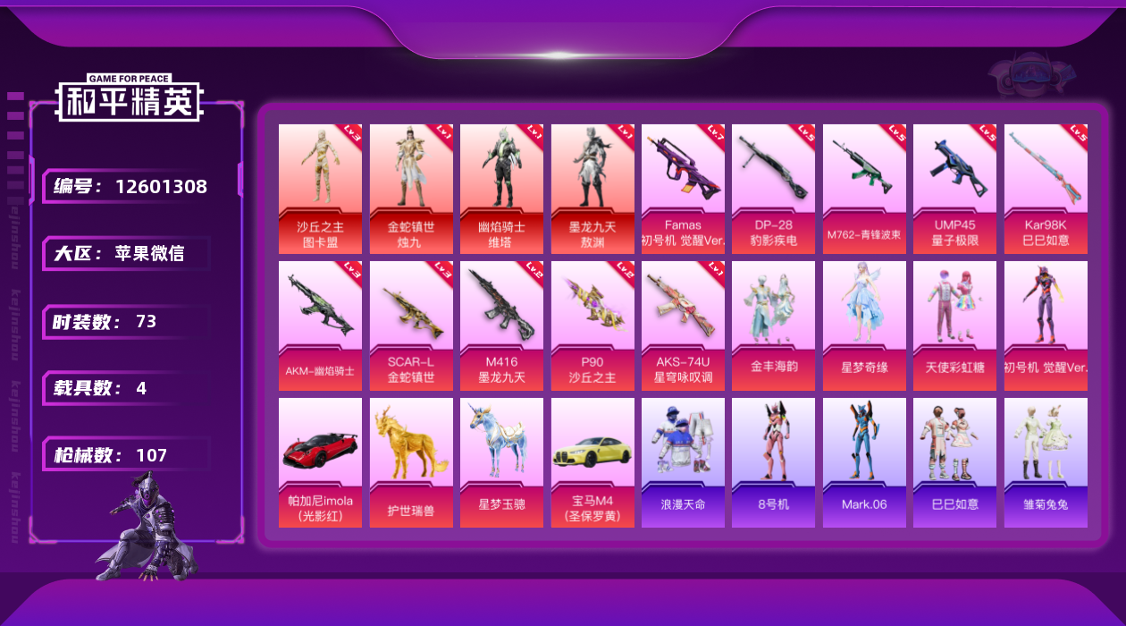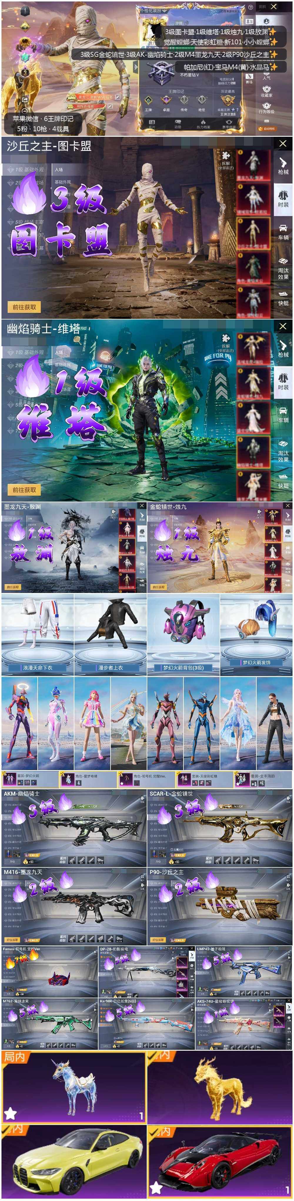 - [11883152]6粉装 2特效枪 1载具 可二次 可修改实名 优质装备:玛莎拉蒂Ghibli(金),M416五爪金龙,奇异狩猎者,蝶舞迷情,幻影战神,宝贝奶油派,银河战甲,木曜青龙,金曜白虎 热门装扮:奇迹天团,胖达团团,狮王雄心,迅捷狂鲨,深海小丑鱼,好奇恐龙,绯红秘境 稀有枪皮:DP-28-豹影疾电 六级特效枪:六级M416-五爪金龙 四级特效枪:四级DP-28-豹影疾电 紫色装扮:SS5特训,伏击者,冷焰舞者,凛冬战士,北国孤狼,SS15特训,SS16特训,银白舞王,SS13特训,SS14特训,SS17特训,SS18特训,酷萌兔限定,金鼠迎春,长空猛禽,雪山征服者,雪山精英,霓虹街区,荣耀,跃动心情,骑行爱好者,魅力单车,黄色伏地魔,黄色名流,黑色伏地魔,格斗先锋,沙漠兵团,圣诞大吉,怒火燎原,战地督导,战地菁英,湖蓝色名流,疯狂小兔子,白色伏地魔,甜蜜告白,福星高照,竞技勇士朋克,潮流先锋,灰色格斗者,熔岩使者,燃烧卡路里,牛气满满,特战装甲,特殊使命,特训学院,镭射皇者,竞技名士,精神漫游,炽焰拳师,格斗专家,SS6特训,核芯基因,拳皇97八神庵,SS7特训,火舞潮人,淡雅花蕊,裁决冥王,浴火魔神,摩艾涂鸦,奇趣章鱼,时之沙漏,SS8特训,粉甜马卡龙,原初圣火,逆风勇士,SS12特训,SS9特训,SS11特训,绯格组合,蓝调潮人,冷酷挑战者,摇滚战魂,绯红秘境,无烬之地,冰原奔狼,忍者信条,WiFi精灵,丛林猎人,传奇侦探,奇趣企鹅,爆竹金鼠 优质战备:幻影战神降落伞,甜心宝贝降落伞,凝视深渊降落伞,至尊龙雀飞行服,至尊龙雀降落伞,银河战甲降落伞,春暖花开降落伞,深海曼妙降落伞,洛神天依降落伞