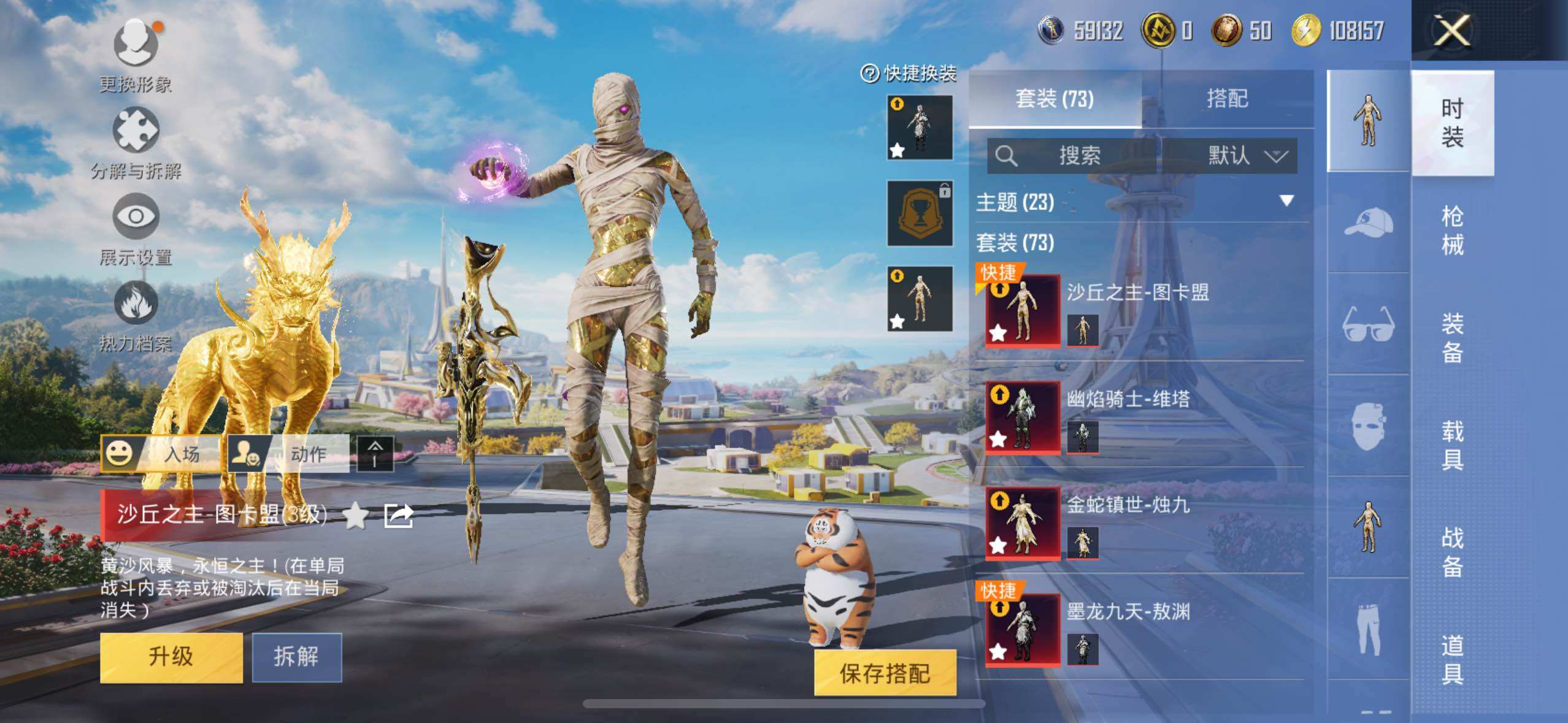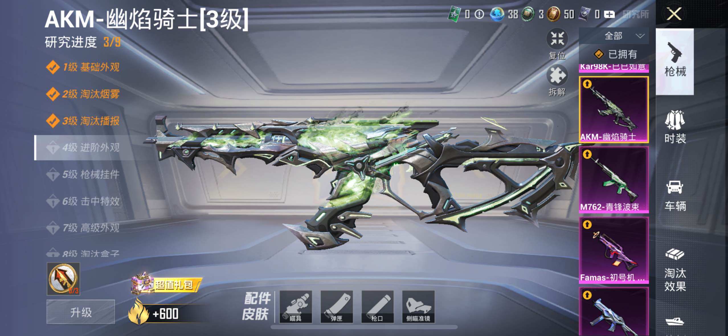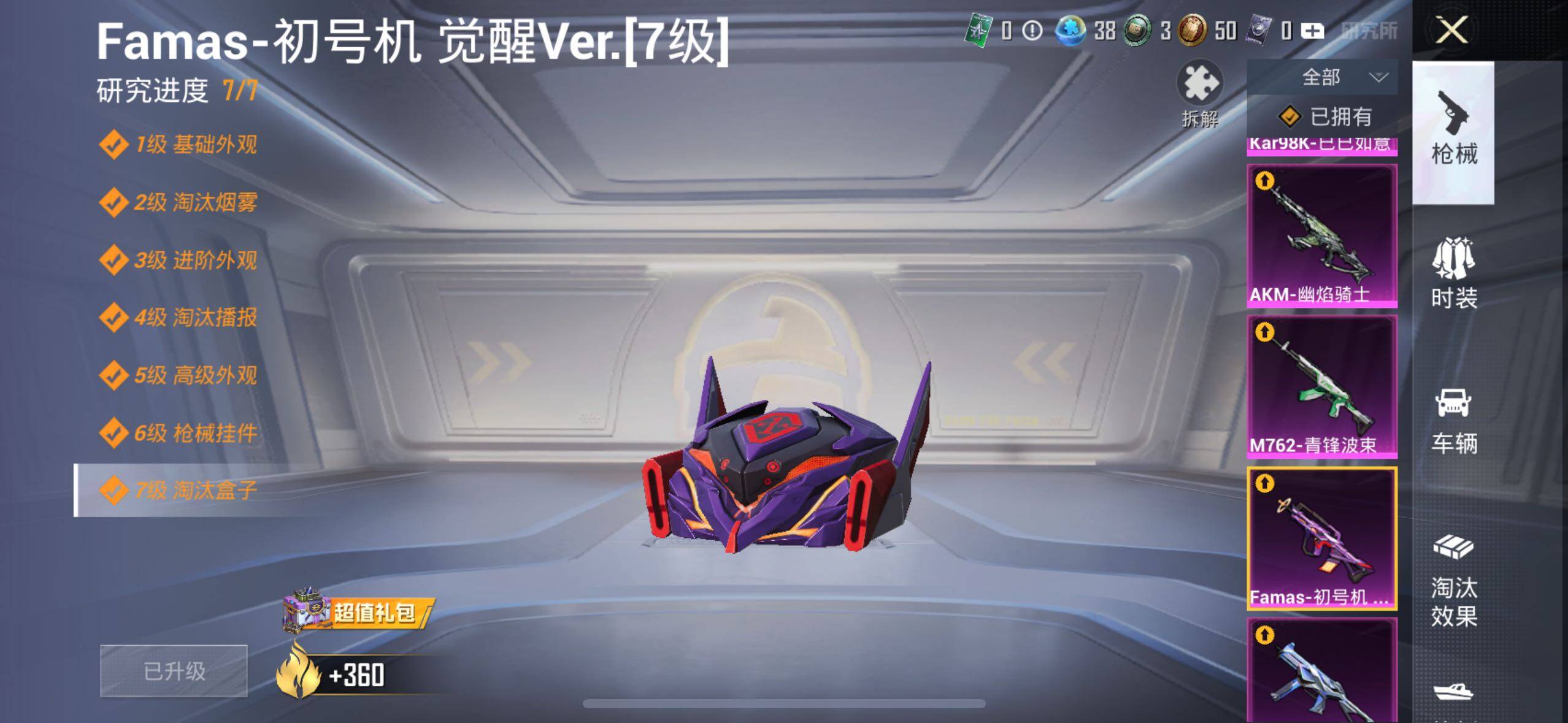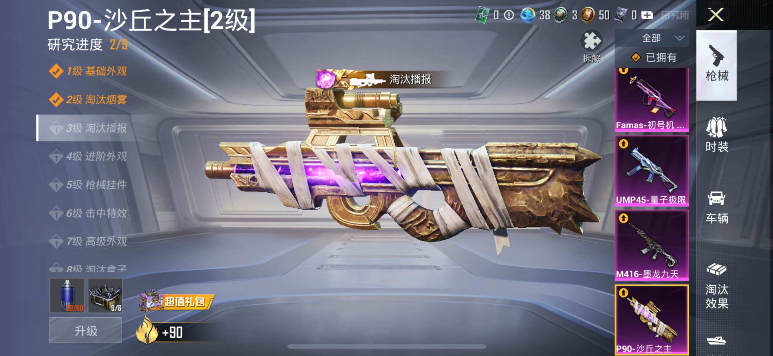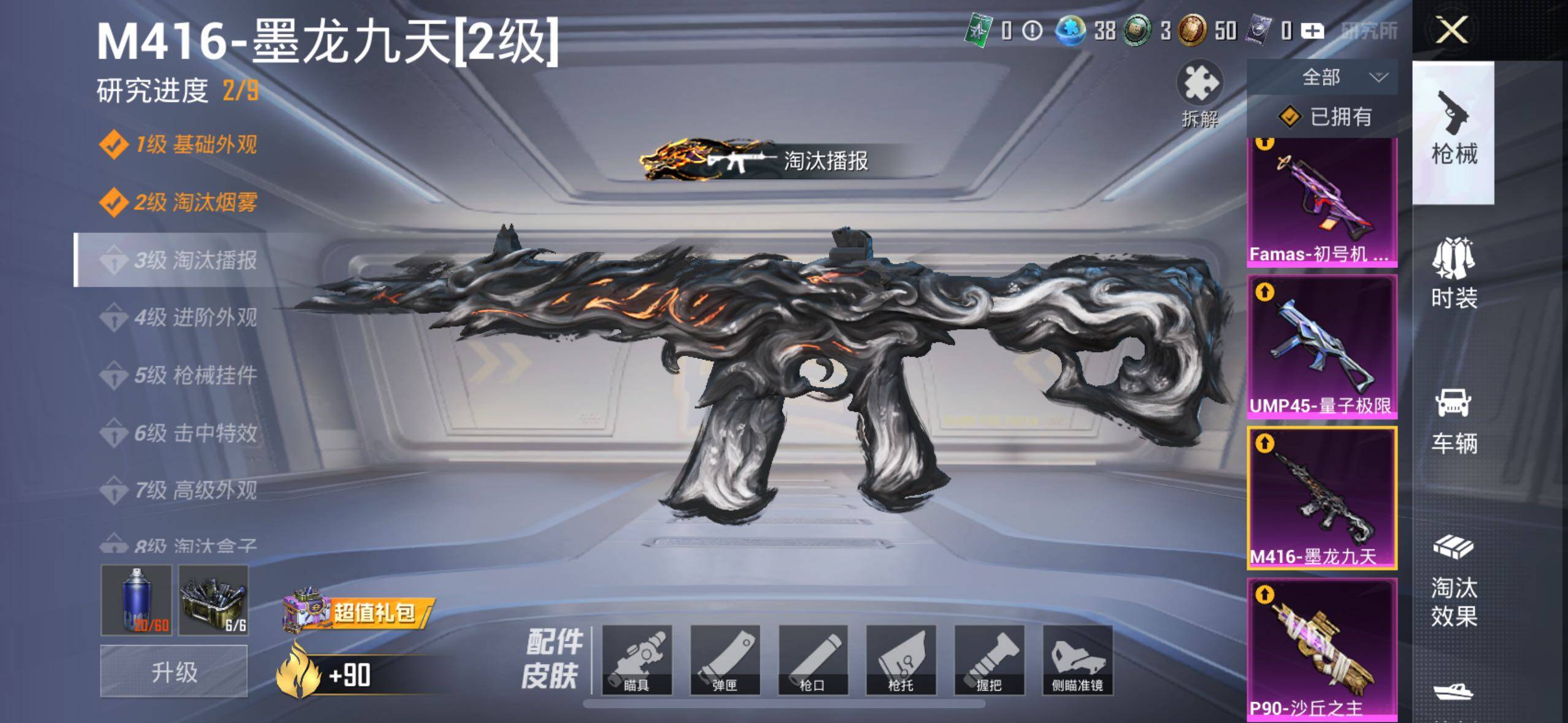 AKM-幽焰骑士,SCAR-L-金蛇镇世,M416-墨龙九天,M762-青锋波束,Famas-觉醒初号机,UMP45-量子极限,P90-沙丘之主,Kar98K-巳巳如意