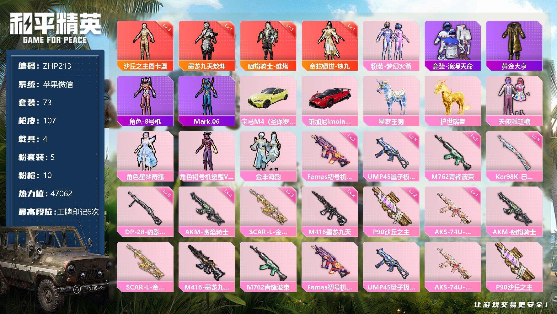 [12601308]特价急出-永久社交限制不影响游戏-介意勿拍-不能直接充值可好友代付-双字ID汐捞-4神装-5粉装-10特效枪-4载具-6粉色飞行器-47062热力值-6王牌印记-73套装-107枪皮 【红色神装等级】:金蛇镇世-烛九(一级),幽焰骑士-维塔(一级),墨龙九天-敖渊(一级),沙丘之主-图卡盟(三级) 【红色角色神装】:金蛇镇世-烛九,幽焰骑士-维塔,墨龙九天-敖渊,沙丘之主-图卡盟 【热门品类】:粉装-梦幻火箭,套装-浪漫天命,套装-黄金大亨,角色-8号机,角色-Mark.06 【粉色载具】:宝马M4(圣保罗黄),帕加尼imola(光影红),星梦玉骢,护世瑞兽 【粉色套装】:粉装-天使彩虹糖,粉装-梦幻火箭,角色-星梦奇缘,角色-初号机 觉醒Ver.,粉装-金丰海韵 【粉色枪皮等级】:AKM-幽焰骑士(三级),SCAR-L-金蛇镇世(三级),M416-墨龙九天(二级),M762-青锋波束(五级),Famas-初号机 觉醒Ver.(七级),UMP45-量子极限(五级),AKS-74U-星穹咏叹调(一级),P90-沙丘之主(二级),Kar98K-巳巳如意(五级),DP-28-豹影疾电(五级) 【粉色枪皮】:AKM-幽焰骑士,SCAR-L-金蛇镇世,M416-墨龙九天,M762-青锋波束,Famas-初号机 觉醒Ver.,UMP45-量子极限,AKS-74U-星穹咏叹调,P90-沙丘之主,Kar98K-巳巳如意,DP-28-豹影疾电 【粉色飞行器】:梦幻火箭飞行器,镜域双华-灵镜之阶,深渊漩涡飞行器,幽焰列车飞行器,万象金身飞行器 【粉色降落伞】:梦幻火箭降落伞,星梦奇缘降落伞,初号机 觉醒Ver.降落伞,金丰海韵降落伞,宇宙意志降落伞,未来领航者降落伞,幽焰骑士降落伞,临安公主降落伞,金蛇镇世降落伞,幻彩电音降落伞 【稀有套装】:套装-巳巳如意,套装-雏菊兔兔,套装-萝兰蝴蝶,套装-小熊娃娃,角色-米开朗基罗,套装-火种守卫者,套装-糖糖葫芦,套装-青团波波,套装-棉花软糖,角色-临安公主,套装-燕燕于飞,套装-鱼渊荷华,玩偶服-小狗蛇点点,套装-闪电轻猫,套装-粉恋花,套装-紫幽梦,套装-蓝冰羽 【稀有枪皮】:SCAR-L-小狗蛇点点,AUG-天降萌叽,AUG-金蛇镇世,Mk47-洛神天依,G36C-星穹咏叹调,蜜獾-天降萌叽,Famas-镜域双华,UZI-天降萌叽,