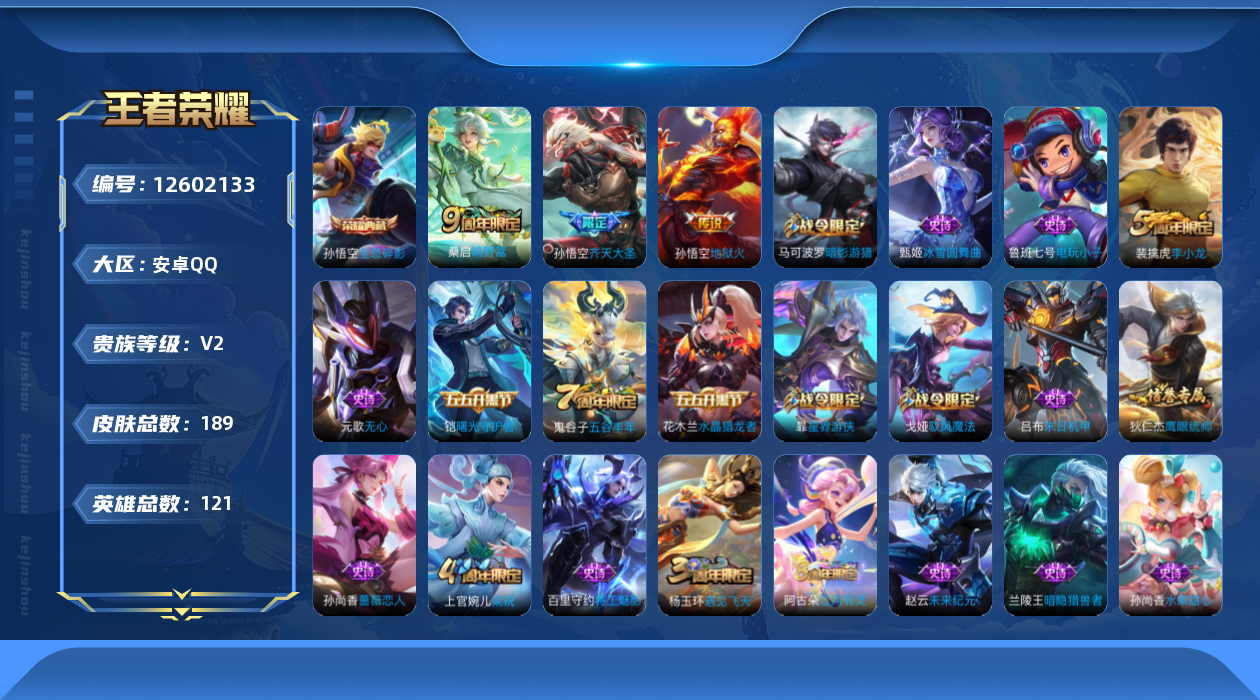 [12602133]安卓Q-V2-永恒钻石IV段位-121英雄-189皮肤-1典藏-0珍品无双-0无双-0珍品传说-3传说-34史诗