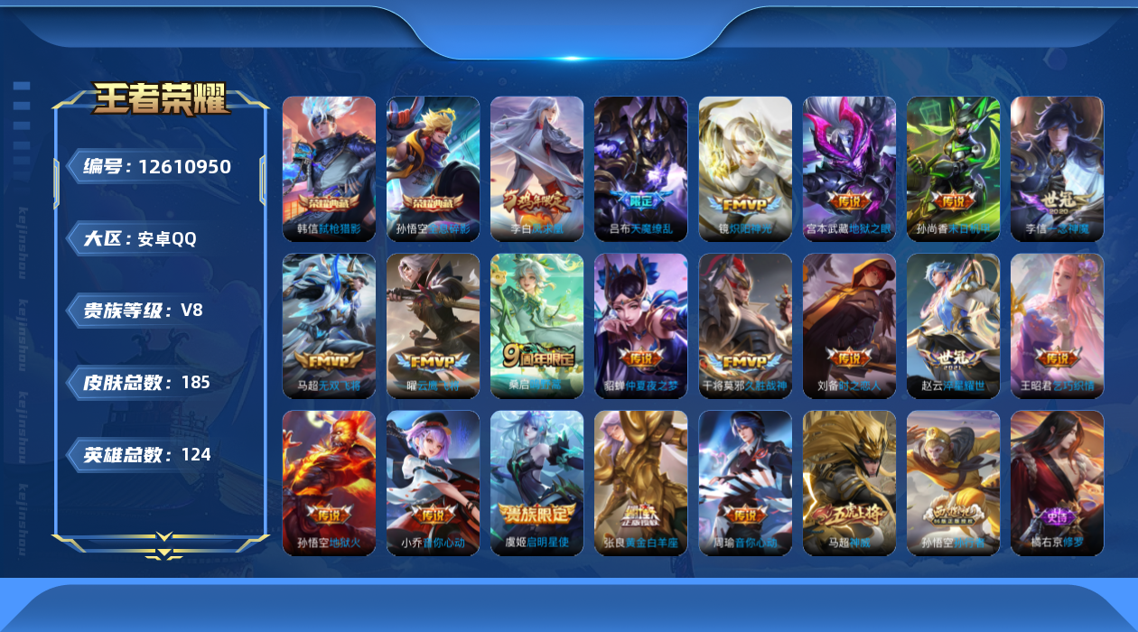 [12610950]安卓Q-V8-永恒钻石I段位-124英雄-185皮肤-2典藏-0珍品无双-0无双-0珍品传说-19传说-42史诗