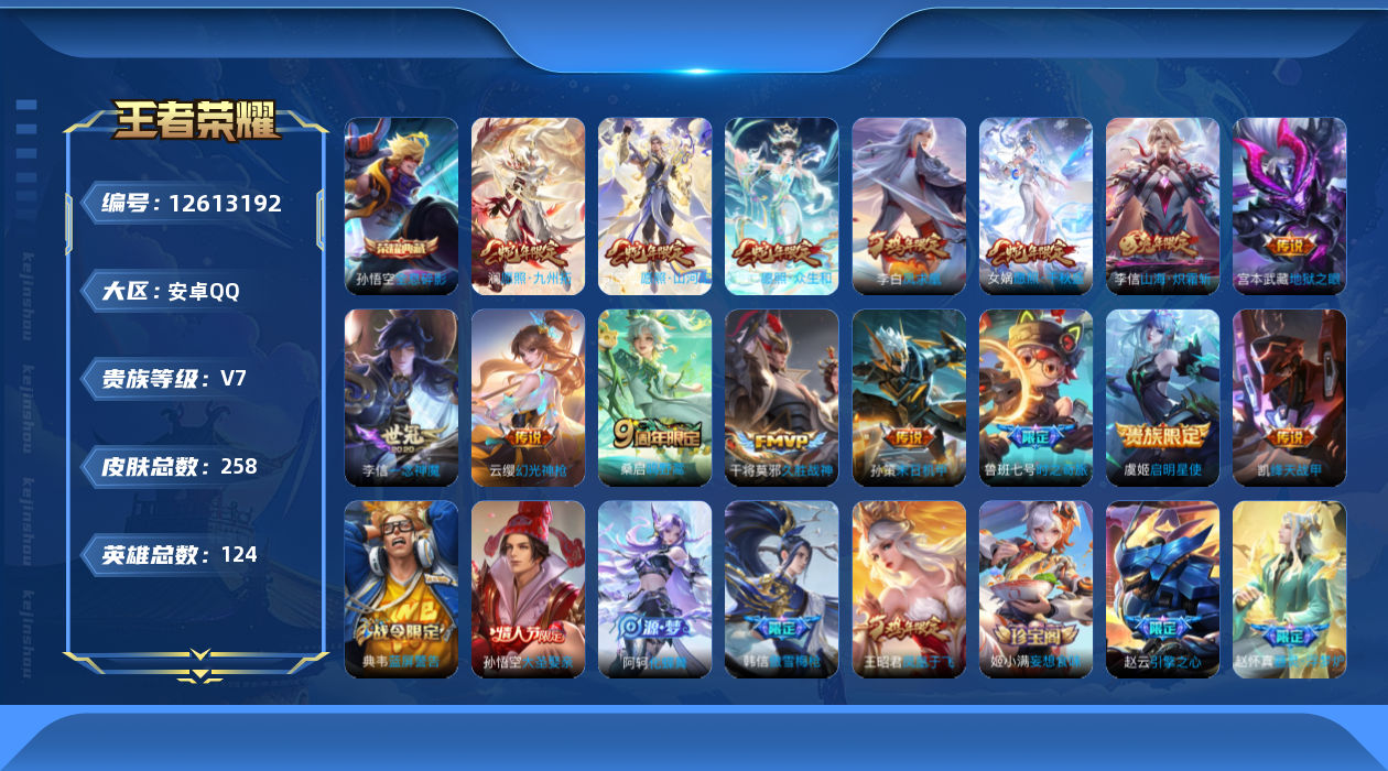 [12613192]安卓Q-V6-至尊星耀II段位-124英雄-258皮肤-1典藏-0珍品无双-0无双-0珍品传说-15传说-62史诗
