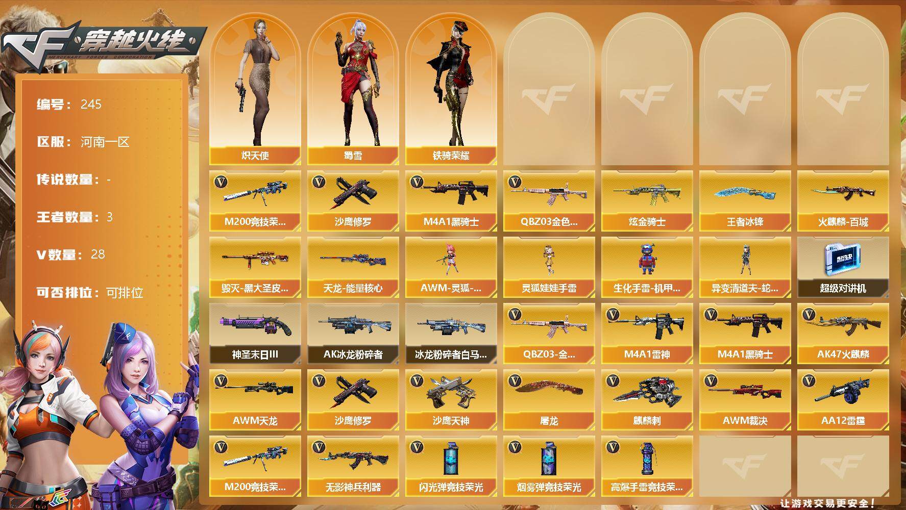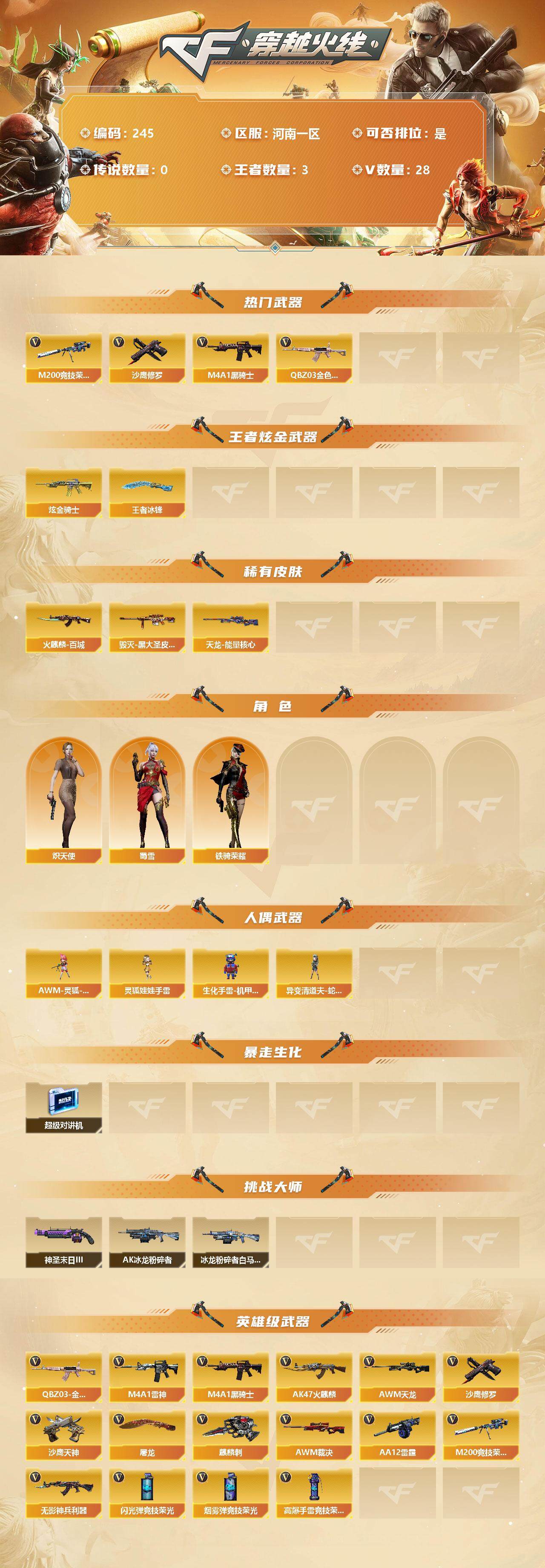 [12613552]【245】28V/102级/荣耀元首/3王者/1炫金/QBZ03-金色蔷薇/M200-竞技荣光/M4A1-黑骑士/沙鹰-修罗/炫金黑骑士/王者冰锋/火麒麟-百城/毁灭-黑大圣皮肤/天龙-能量核心/蜀雪/炽天使/铁骑荣耀/AWM-灵狐-15周年嘉年华/异变清道夫-蛇影双骄/灵狐娃娃手雷/生化手雷-机甲核心/超级对讲机/神圣爆裂者-末日/AK47-冰龙粉碎者/冰龙粉碎者-白马银枪/高爆手雷-竞技荣光/烟雾弹-竞技荣光/闪光弹-竞技荣光/无影-神兵利器/M4A1-雷神/AK47-火麒麟/AWM-天龙/AWM-裁决/AA-12-雷霆/沙鹰-天神/麒麟刺/屠龙