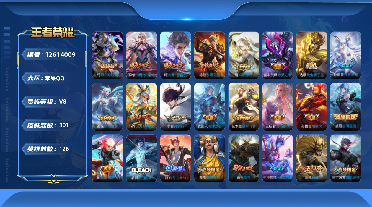 [12614009]苹果Q-V8-永恒钻石I段位-126英雄-301皮肤-1典藏-0珍品无双-0无双-0珍品传说-16传说-86史诗