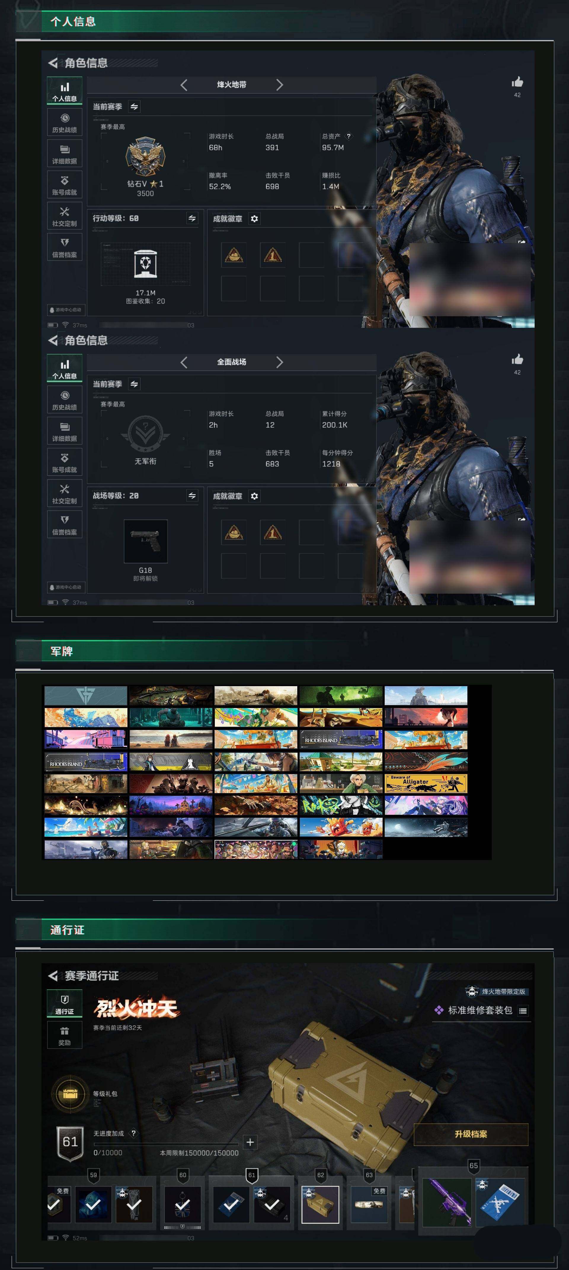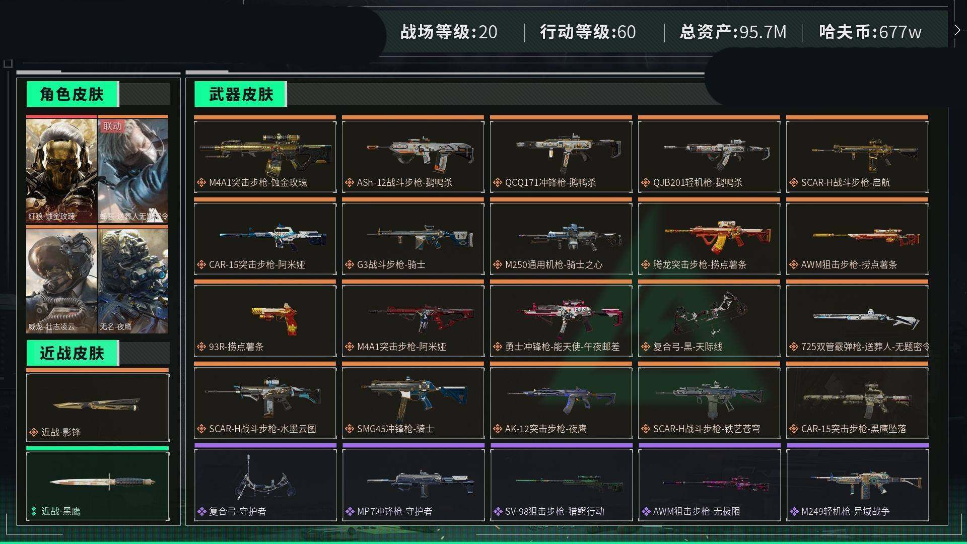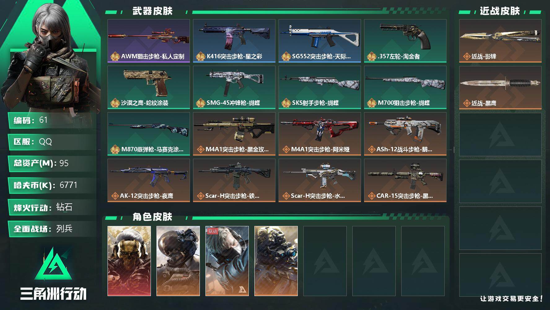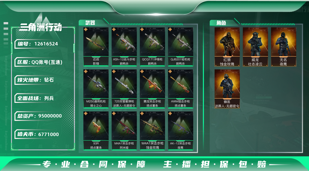 [12616524]6771k哈伏币-47m流动资产-60烽火等级-钻石-20战场等级-列兵 【干员外观】:红狼-蚀金玫瑰,威龙-壮志凌云,蜂医-送葬人·无题密令,无名-夜鹰 【近战皮肤】:近战-影锋,近战-黑鹰 【典藏外观】:AWM狙击步枪-私人定制,K416突击步枪-星之彩,SG552突击步枪-天际线,.357左轮-淘金者,沙漠之鹰-蛇纹涂装,SMG-45冲锋枪-蝴蝶,SKS射手步枪-蝴蝶,M700狙击步枪-蝴蝶,M870霰弹枪-马赛克涂装 【传说级普通外观】:M4A1突击步枪-蚀金玫瑰,M4A1突击步枪-阿米娅,ASh-12战斗步枪-鹅鸭杀,AK-12突击步枪-夜鹰,SCAR-H战斗步枪-铁艺苍穹,SCAR-H战斗步枪-水墨云图,CAR-15突击步枪-黑鹰坠落,CAR-15突击步枪-阿米娅,腾龙突击步枪-捞点薯条,SMG-45冲锋枪-骑士,QCQ171冲锋枪-鹅鸭杀,725双管霰弹枪-送葬人-无题密令,M250通用机枪-骑士之心,QJB201轻机枪-鹅鸭杀,AWM狙击步枪-捞点薯条,93R-捞点薯条,复合弓-黑·天际线 【史诗级普通外观】:M4A1突击步枪-特勤执行,AKM突击步枪-林中猎手,QBZ95-1突击步枪-曙光,QBZ95-1突击步枪-ACE,ASh-12战斗步枪-守夜人,M16A4突击步枪-竞赛选手,AUG突击步枪-战术迷彩,AUG突击步枪-蝮蛇,AUG突击步枪-特勤执行,SG552突击步枪-尖端治疗,SCAR-H战斗步枪-囚徒,G3战斗步枪-战场英杰,PTR-32突击步枪-ACE,AS Val突击步枪-尖端治疗,AS Val突击步枪-典狱官,腾龙突击步枪-无垢,MP5冲锋枪-深海恐惧,Vector冲锋枪-阿萨拉文明,Vector冲锋枪-红色彗星,SR-3M紧凑突击步枪-纷争,SR-3M紧凑突击步枪-荒野求生,MP7冲锋枪-无垢,M1014霰弹枪-林中猎手,PKM通用机枪-蝮蛇,PKM通用机枪-守夜人,PKM通用机枪-荒野求生,M250通用机枪-囚徒,SVD狙击步枪-暗夜猎手,SVD狙击步枪-荒野求生,M14射手步枪-黑鹰坠落,SKS射手步枪-ACE,SR-25射手步枪-尖端治疗,PSG-1射手步枪-无垢,SV-98狙击步枪-林中猎手,SV-98狙击步枪-囚徒,M700狙击步枪-竞技风,M700狙击步枪-蝮蛇,M700狙击步枪-守夜人,沙漠之鹰-曙光 【稀有级普通外