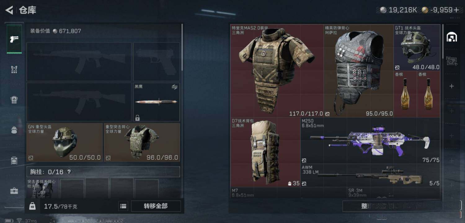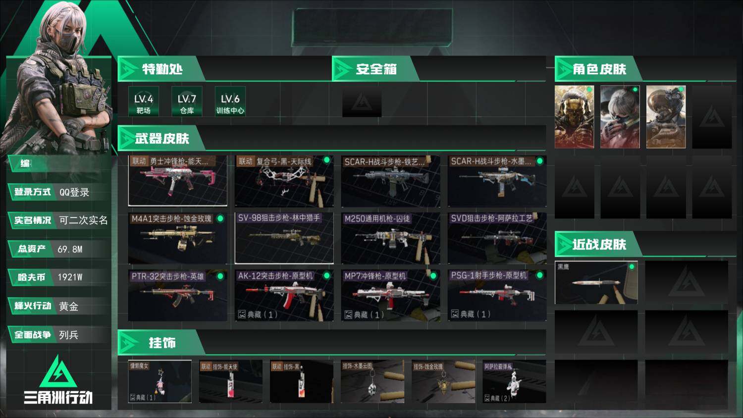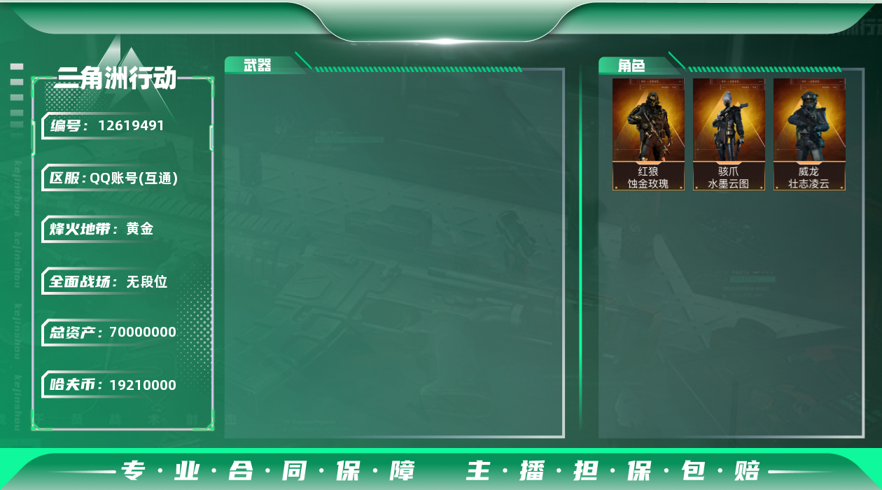 [12619491]泽3922总资产:69.8M,哈夫币:1921W,武器皮肤117,烽火60级:黄金,战场12级:列兵,通行证6级:通行证免费版 【安全箱】基础安全箱;【特勤处等级】仓库LV.7,指挥中心LV.4,训练中心LV.6,靶场LV.4,潜水中心LV.0,收藏室LV.0;【干员皮肤3】:红狼蚀金玫瑰,骇爪水墨云图,威龙壮志凌云;【已有捆绑包1】:蚀金玫瑰捆绑包;【近战皮肤】:近战武器-黑鹰;【步枪皮肤】:SCAR-H战斗步枪-铁艺苍穹,SCAR-H战斗步枪-水墨云图,M4A1突击步枪-蚀金玫瑰,PTR-32突击步枪-英雄,AK-12突击步枪-原型机,QBZ95-1突击步枪-曙光,AKM突击步枪-林中猎手,AUG突击步枪-蛇,M4A1突击步枪-特勤执行,PTR-32突击步枪-ACE,QBZ95-1突击步枪-ACE,AUG突击步枪-特勤执行,G3战斗步枪-战场英杰,SCAR-H战斗步枪-荣耀列队,G3战斗步枪-幻影结构,PTR-32突击步枪-天网,SCAR-H战斗步枪-童趣,ASh-12战斗步枪-哈夫克科技,PTR-32突击步枪-黑潮,K416突击步枪-街头涂鸦,K416突击步枪-星之彩,M16A4突击步枪-山林猎,M4A1突击步枪-海色,AUG突击步枪-常青藤,AK-12突击步枪-落花,SCAR-H战斗步枪-红色彗星,QBZ95-1突击步枪-海色,AKS-74U突击步枪-马,CAR-15突击步枪-几何解构,M4A1突击步枪-几何解构,K416突击步枪-几何解构,AUG突击步枪-浅蓝涂装,M4A1突击步枪-高雅黑,G3战斗步枪-高雅黑,SG552突击步枪-浅蓝涂装,SG552突击步枪-精钢,AKS-74U突击步枪-蛇纹,ASVal突击步枪-蝴蝶,M4A1突击步枪-蛛网,AK-12突击步枪-冰川,K416突击步枪-高雅黑,QBZ95-1突击步枪-高雅黑,SG552突击步枪-海浪,SCAR-H战斗步枪-数码,M4A1突击步枪-粉色涂装,QBZ95-1突击步枪-海浪,M7战斗步枪-红色彗星;【冲锋枪皮肤】:勇士冲锋枪-能天使-午夜邮差,MP7冲锋枪-原型机,Vector冲锋枪-红色彗星;【射手步枪皮肤】:SVD狙击步枪-阿萨拉工艺,PSG-1射手步枪-原型机,SVD狙击步枪-暗夜猎手,SKS射手步枪-ACE,M14射手步枪-黑鹰坠落;【狙击步枪皮肤】:SV-98狙击步枪-林中猎手,M
