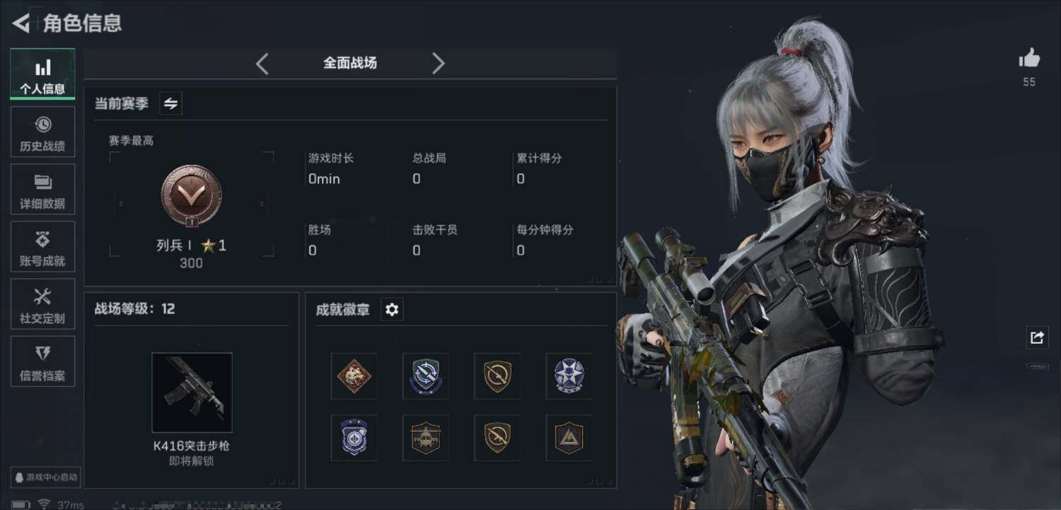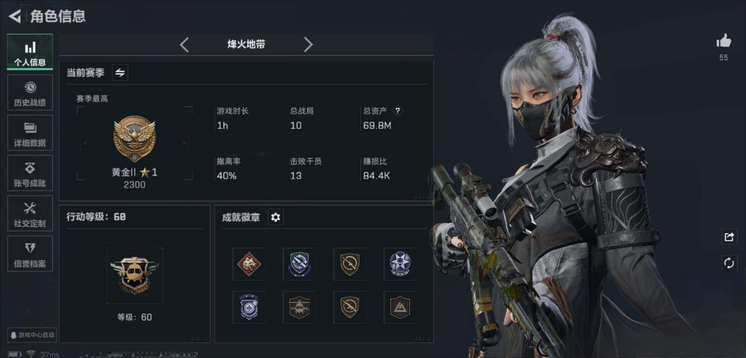 - [11680835]总资产:293.7M 1干员外观 1传说枪械 哈夫币:30.246K 可二次 可修改实名 优质装备:顶级安全箱(3x3) 烽火地带段位:钻石 全面战场段位:无段位 传说武器皮肤:M4A1突击步枪-阿米娅 干员外观:露娜-黑·天际线