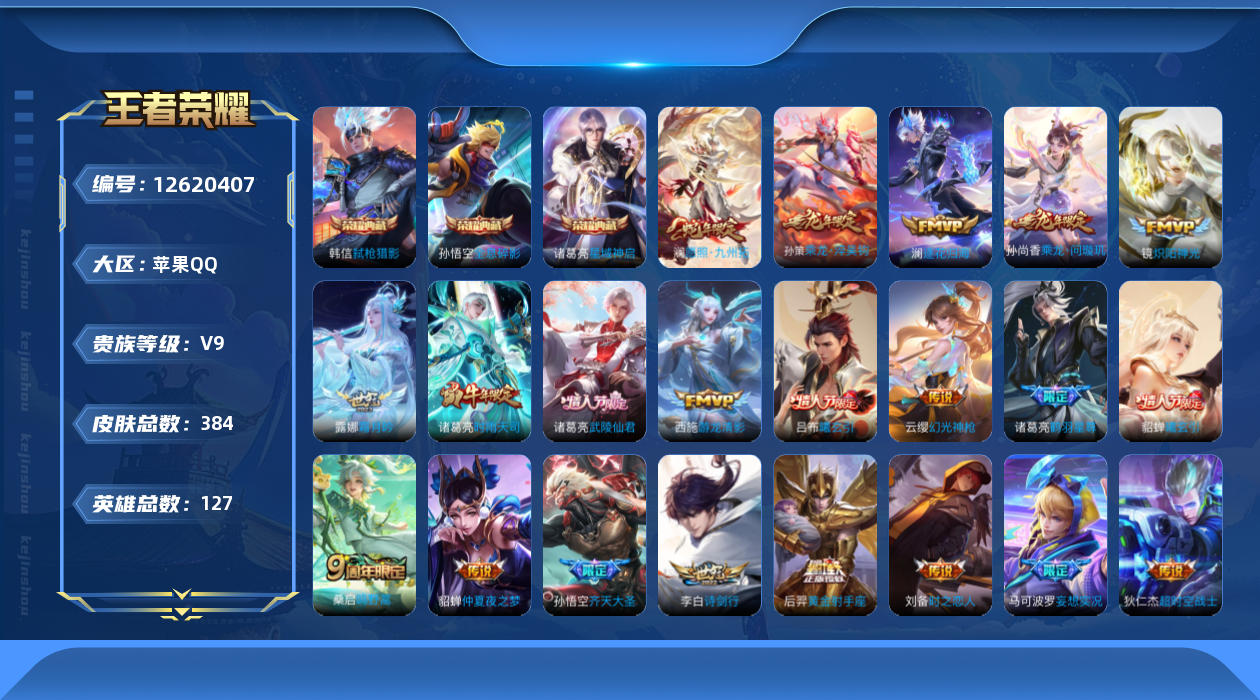 [12620407]苹果Q-V9-永恒钻石V段位-127英雄-384皮肤-3典藏-0珍品无双-0无双-0珍品传说-28传说-106史诗