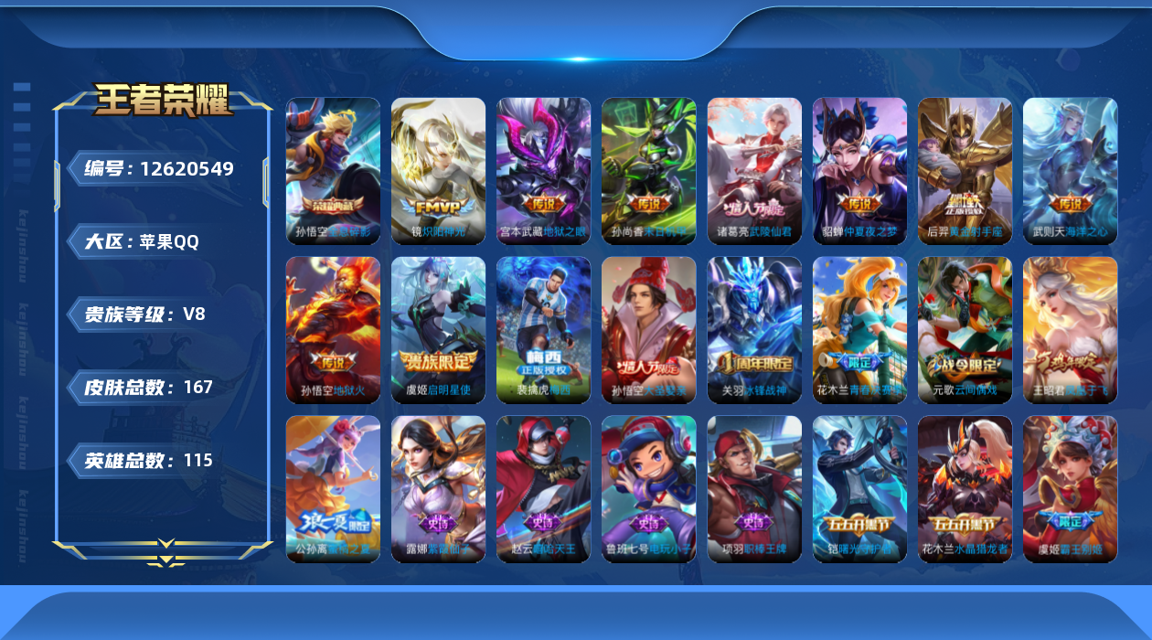 [12620549]苹果Q-V0-秩序白银III段位-113英雄-167皮肤-1典藏-0珍品无双-0无双-0珍品传说-9传说-37史诗 【荣耀典藏】:武则天英雄,孙悟空全息碎影 【传说皮肤】:镜炽阳神光,虞姬启明星使,后羿黄金射手座,诸葛亮武陵仙君,貂蝉仲夏夜之梦,孙尚香末日机甲,宫本武藏地狱之眼,孙悟空地狱火,武则天海洋之心 【限定皮肤】:白起狰,狄仁杰阴阳师,虞姬凯尔特女王,赵云皇家上将,庄周云端筑梦师,高渐离死亡摇滚,扁鹊炼金王,芈月重明,元歌云间偶戏,夏侯惇朔风刀,曹操烛龙,典韦穷奇,狄仁杰魔术师,狄仁杰万华元夜,达摩沙漠行僧,项羽海滩派对,老夫子醍醐杖,关羽冰锋战神,程咬金演武夺筹,韩信逐梦之影,王昭君凤凰于飞,兰陵王金庭之子,花木兰青春决赛季,亚瑟潮玩骑士王,孙悟空大圣娶亲,牛魔御旌,虞姬霸王别姬,虞姬启明星使,杨玉环遇见飞天,哪吒逐梦之翼,太乙真人饕餮,太乙真人华丽摇滚,鬼谷子原初探秘者,诸葛亮武陵仙君,百里玄策原初追逐者,弈星混沌棋,公孙离蜜橘之夏,明世隐疑决卦,狂铁御狮,米莱狄御霄,盾山御銮,上官婉儿梁祝,裴擒虎梅西 【年限皮肤】:王昭君凤凰于飞 【赛季限定】:扁鹊炼金王,白起狰,芈月重明,夏侯惇朔风刀,曹操烛龙,典韦穷奇,狄仁杰万华元夜,达摩沙漠行僧,老夫子醍醐杖,程咬金演武夺筹,兰陵王金庭之子,牛魔御旌,虞姬凯尔特女王,太乙真人饕餮,鬼谷子原初探秘者,百里玄策原初追逐者,弈星混沌棋,明世隐疑决卦,狂铁御狮,米莱狄御霄,盾山御銮 【战令限定】:元歌云间偶戏,亚瑟潮玩骑士王 【史诗皮肤】:鲁班七号电玩小子,项羽职棒王牌,露娜紫霞仙子,赵云嘻哈天王,赵云皇家上将,貂蝉圣诞恋歌,王昭君偶像歌手,狄仁杰魔术师,嬴政暗夜贵公子,妲己女仆咖啡,吕布圣诞狂欢,李白千年之狐,吕布末日机甲,虞姬霸王别姬,关羽冰锋战神,王昭君凤凰于飞,花木兰水晶猎龙者,刘邦德古拉伯爵,韩信逐梦之影,夏侯惇乘风破浪,小乔缤纷独角兽,诸葛亮黄金分割率,雅典娜冰冠公主,安琪拉心灵骇客,庄周云端筑梦师,花木兰青春决赛季,铠曙光守护者,裴擒虎梅西,哪吒逐梦之翼,刘禅天才门将,公孙离蜜橘之夏,杨玉环遇见飞天,孙悟空大圣娶亲,狄仁杰鹰眼统帅,上官婉儿梁祝,百里玄策原初追逐者,元歌云间偶戏 【其他皮肤】:项羽海滩派对,韩信教廷特使,韩信街头霸王,露娜哥特玫瑰,阿轲致命风华,阿轲爱心护理,达摩大发明家,程咬金星际陆战