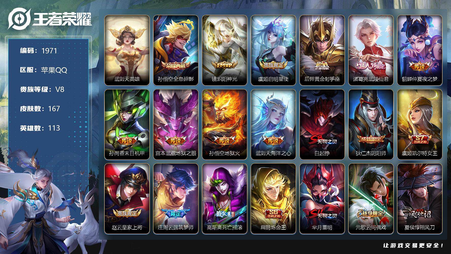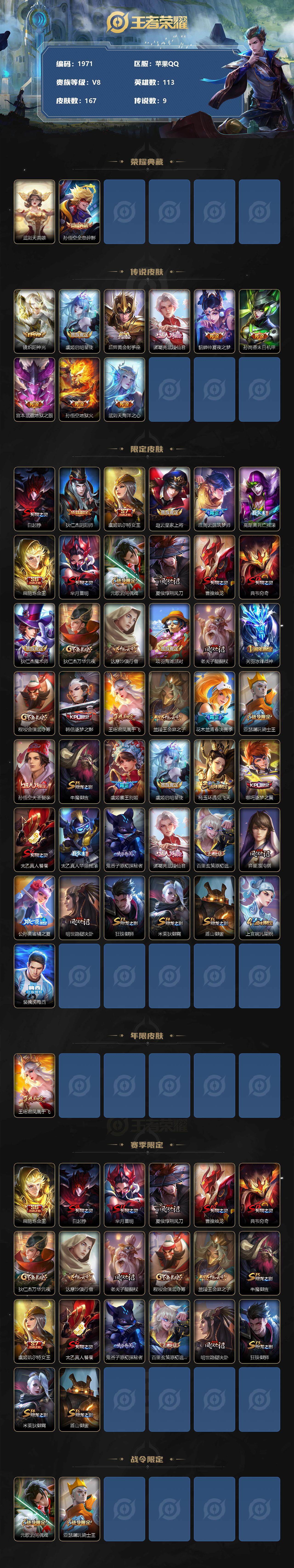 [12620549]苹果Q-V0-秩序白银III段位-113英雄-167皮肤-1典藏-0珍品无双-0无双-0珍品传说-9传说-37史诗