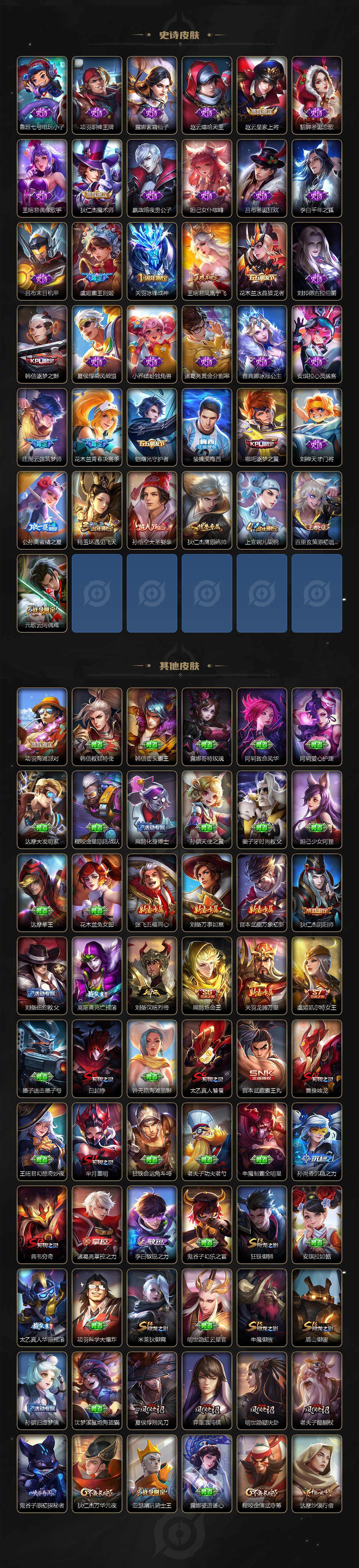 【史诗皮肤】:鲁班七号电玩小子,项羽职棒王牌,露娜紫霞仙子,赵云嘻哈天王,赵云皇家上将,貂蝉圣诞恋歌,王昭君偶像歌手,狄仁杰魔术师,嬴政暗夜贵公子,妲己女仆咖啡,吕布圣诞狂欢,李白千年之狐,吕布末日机甲,虞姬霸王别姬,关羽冰锋战神,王昭君凤凰于飞,花木兰水晶猎龙者,刘邦德古拉伯爵,韩信逐梦之影,夏侯惇乘风破浪,小乔缤纷独角兽,诸葛亮黄金分割率,雅典娜冰冠公主,安琪拉心灵骇客,庄周云端筑梦师,花木兰青春决赛季,铠曙光守护者,裴擒虎梅西,哪吒逐梦之翼,刘禅天才门将,公孙离蜜橘之夏,杨玉环遇见飞天,孙悟空大圣娶亲,狄仁杰鹰眼统帅,上官婉儿梁祝,百里玄策原初追逐者,元歌云间偶戏