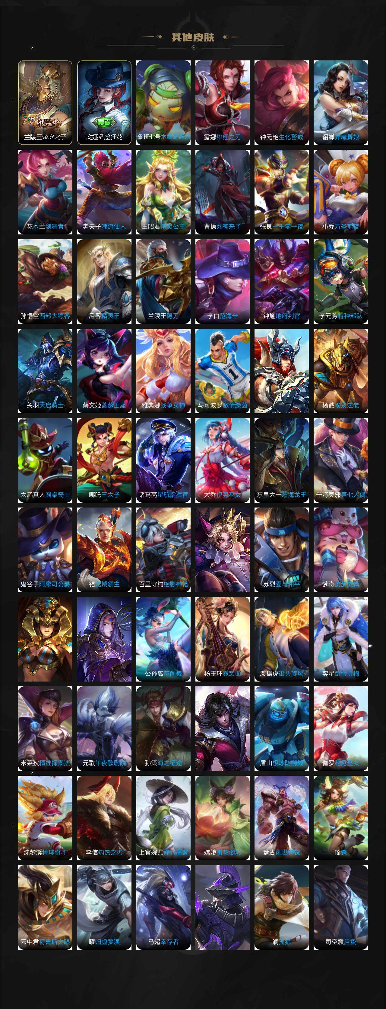 【限定皮肤】:白起狰,狄仁杰阴阳师,虞姬凯尔特女王,赵云皇家上将,庄周云端筑梦师,高渐离死亡摇滚,扁鹊炼金王,芈月重明,元歌云间偶戏,夏侯惇朔风刀,曹操烛龙,典韦穷奇,狄仁杰魔术师,狄仁杰万华元夜,达摩沙漠行僧,项羽海滩派对,老夫子醍醐杖,关羽冰锋战神,程咬金演武夺筹,韩信逐梦之影,王昭君凤凰于飞,兰陵王金庭之子,花木兰青春决赛季,亚瑟潮玩骑士王,孙悟空大圣娶亲,牛魔御旌,虞姬霸王别姬,虞姬启明星使,杨玉环遇见飞天,哪吒逐梦之翼,太乙真人饕餮,太乙真人华丽摇滚,鬼谷子原初探秘者,诸葛亮武陵仙君,百里玄策原初追逐者,弈星混沌棋,公孙离蜜橘之夏,明世隐疑决卦,狂铁御狮,米莱狄御霄,盾山御銮,上官婉儿梁祝,裴擒虎梅西