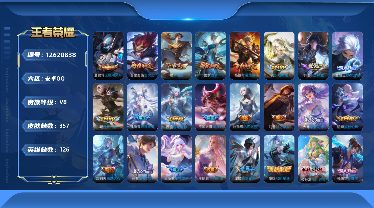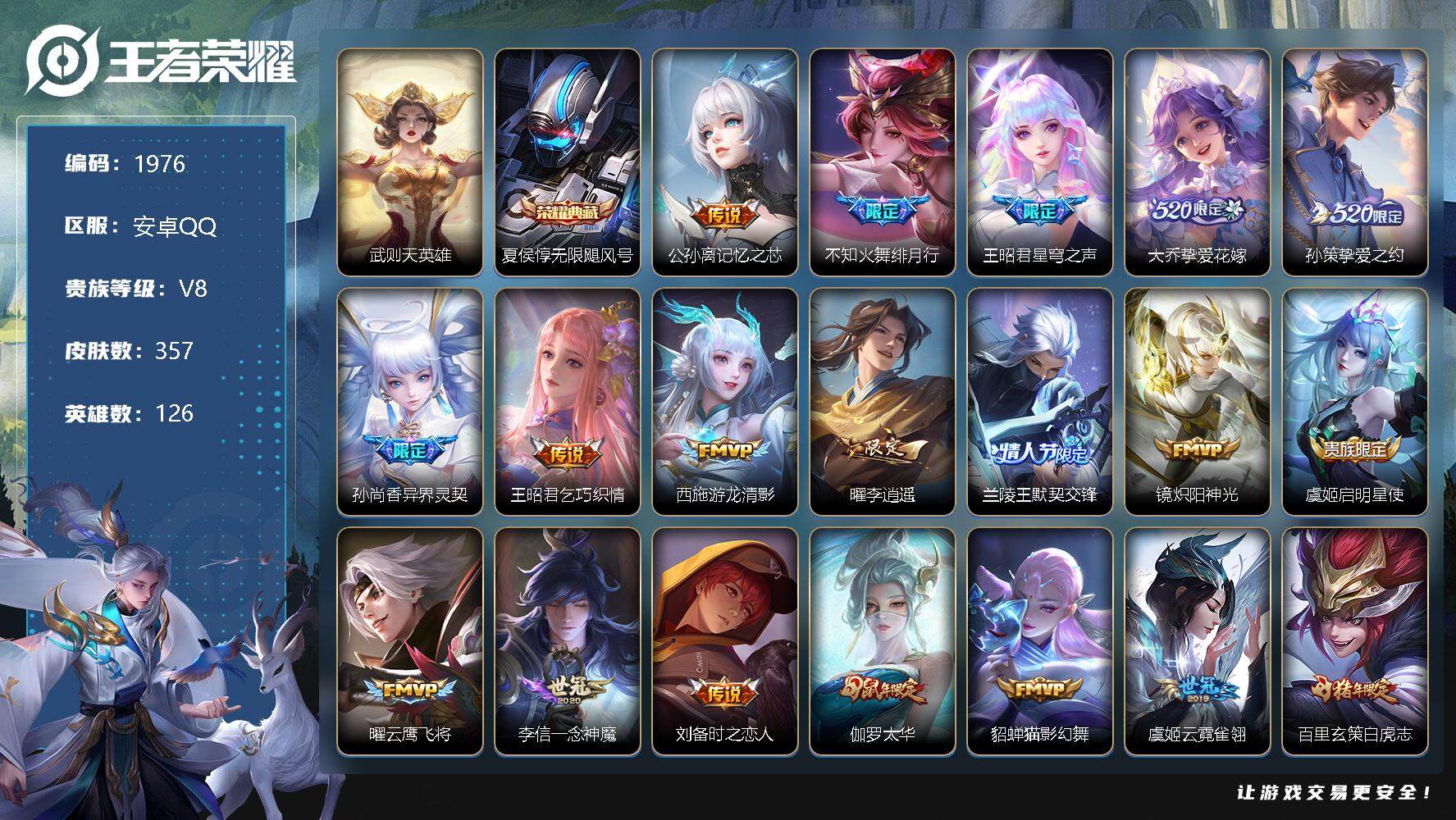 [12620838]安卓Q-V8-至尊星耀II段位-126英雄-357皮肤-1典藏-0珍品无双-0无双-0珍品传说-21传说-110史诗