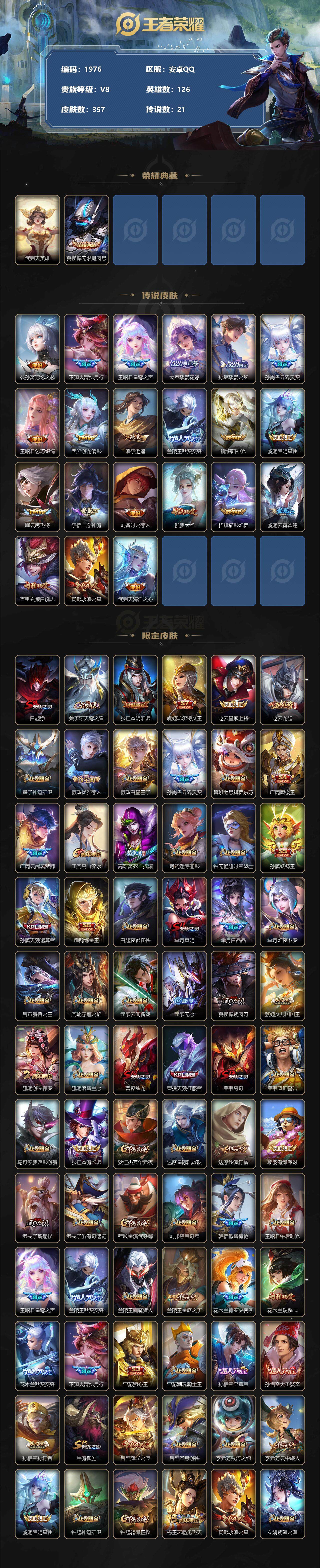 - [12084802]V8 2典藏 1珍品传说 8传说 124英雄 283皮肤 可修改实名 优质装备:鸣剑·曳影,全息碎影(猴子典藏),黑崎一护,黄金射手座,云鹰飞将(小将军),猫影幻舞,炽阳神光,一念神魔 传说皮:幻光神枪 珍宝阁皮:蔷薇恋人 限定皮:逐霄战戟,至尊宝,遇见飞天,高山流水,五谷丰年,梁祝,李小龙,寅虎·赤拳(老虎年限) 史诗皮:鸭鸭历险记-刘禅,龙之律动,百相守梦-周瑜,茶境仙,乘龙·聚宝船(安琪拉年限),百相守梦-百里守约,百相守梦-黄忠,紫霞仙子,苍穹之光,黄金分割率,千年之狐,永昼,江河有灵,百解令(蒙犽),高渐离燃音魔法,无限星赏官,偶像歌手,电玩·爆裂旋风,末日机甲-吕布,猫狗日记-孙策,乱世虎臣,节奏热浪,修罗,女仆咖啡,摇滚巨星,水果甜心,绅士熊喵,天才门将,星夜王子,功夫厨神,德古拉伯爵,暗隐猎兽者,幽灵船长,鬼剑武藏,心灵战警,乐园奇幻夜,地狱岩魂,纤云弄巧,拒霜思,缤纷独角兽,乘风破浪,逐浪之夏,水晶猎龙者,金属风暴,圣诞狂欢,圣诞恋歌,鹰眼统帅,暗夜贵公子,魅力维加斯,赏金猎手,未来纪元-赵云