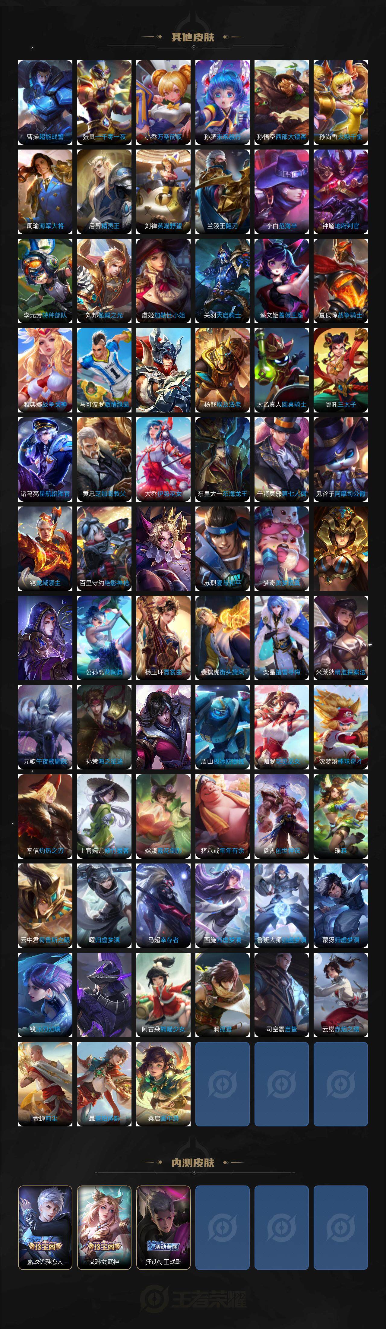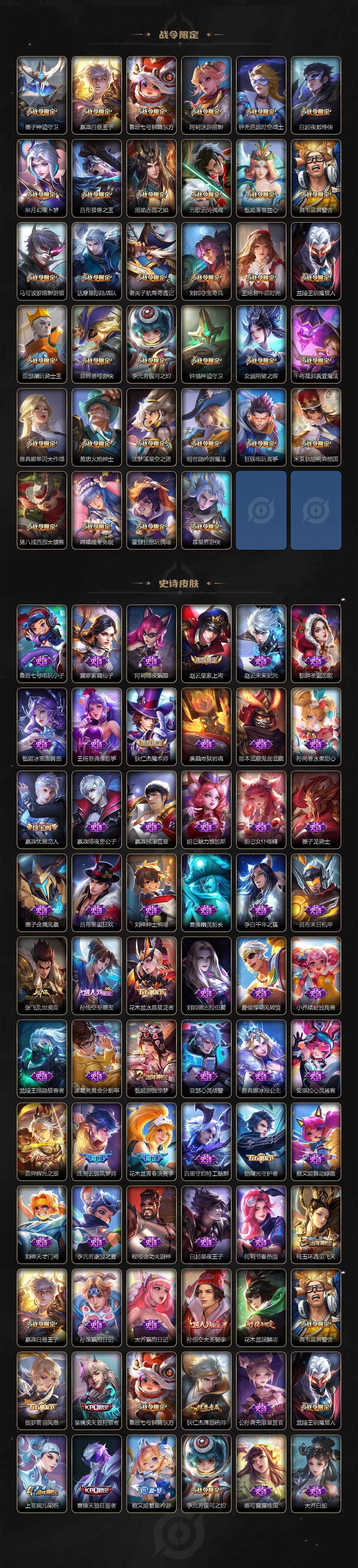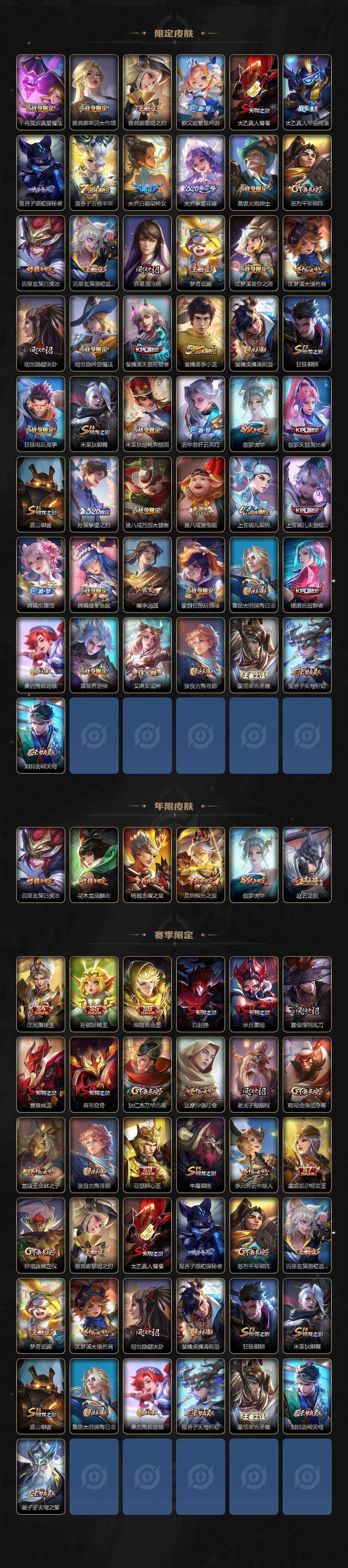 【限定皮肤】:白起狰,姜子牙天穹之誓,狄仁杰阴阳师,虞姬凯尔特女王,赵云皇家上将,赵云龙胆,墨子神迹守卫,嬴政优雅恋人,嬴政白昼王子,孙尚香异界灵契,鲁班七号狮舞东方,庄周蜃楼王,庄周云端筑梦师,庄周高山流水,高渐离死亡摇滚,阿轲迷踪丽影,钟无艳超时空战士,孙膑妖精王,孙膑天狼运算者,扁鹊炼金王,白起夜都怪侠,芈月重明,芈月白晶晶,芈月幻夜卜梦,吕布猎兽之王,周瑜赤莲之焰,元歌云间偶戏,元歌无心,夏侯惇朔风刀,甄姬女儿国国王,甄姬游园惊梦,甄姬落雪兰心,曹操烛龙,曹操天狼征服者,典韦穷奇,典韦蓝屏警告,马可波罗暗影游猎,狄仁杰魔术师,狄仁杰万华元夜,达摩星际陆战队,达摩沙漠行僧,项羽海滩派对,老夫子醍醐杖,老夫子航海奇遇记,程咬金演武夺筹,刘邦夺宝奇兵,韩信傲雪梅枪,王昭君午后时光,王昭君星穹之声,兰陵王默契交锋,兰陵王驯魔猎人,兰陵王金庭之子,花木兰青春决赛季,花木兰瑞麟志,花木兰默契交锋,不知火舞绯月行,亚瑟狮心王,亚瑟潮玩骑士王,孙悟空至尊宝,孙悟空大圣娶亲,孙悟空孙行者,牛魔御旌,后羿辉光之辰,后羿圣弓游侠,李元芳银河之约,李元芳云中旅人,虞姬启明星使,钟馗神迹守卫,钟馗驱傩正仪,杨玉环遇见飞天,杨戬永曜之星,女娲朔望之晖,干将莫邪真爱魔法,雅典娜单词大作战,雅典娜黎明之约,蔡文姬繁星吟游,太乙真人饕餮,太乙真人华丽摇滚,鬼谷子原初探秘者,鬼谷子五谷丰年,大乔白鹤梁神女,大乔挚爱花嫁,黄忠火炮绅士,苏烈千军破阵,百里玄策白虎志,百里玄策原初追逐者,弈星混沌棋,梦奇顽趣,沈梦溪星空之诺,沈梦溪大漠名商,明世隐疑决卦,明世隐吟游魔法,裴擒虎天狼狩猎者,裴擒虎李小龙,裴擒虎擒涛扼浪,狂铁御狮,狂铁电玩高手,米莱狄御霄,米莱狄胡桃异