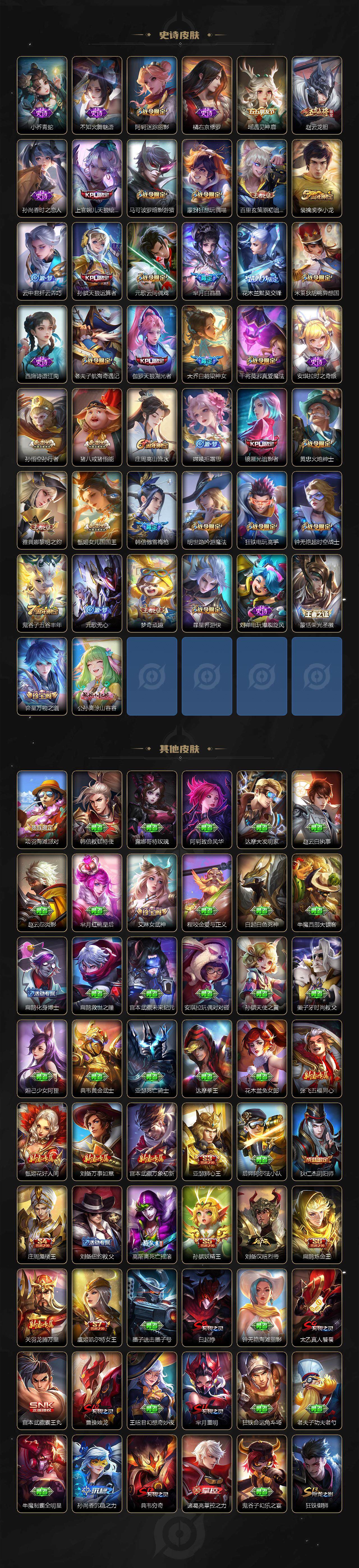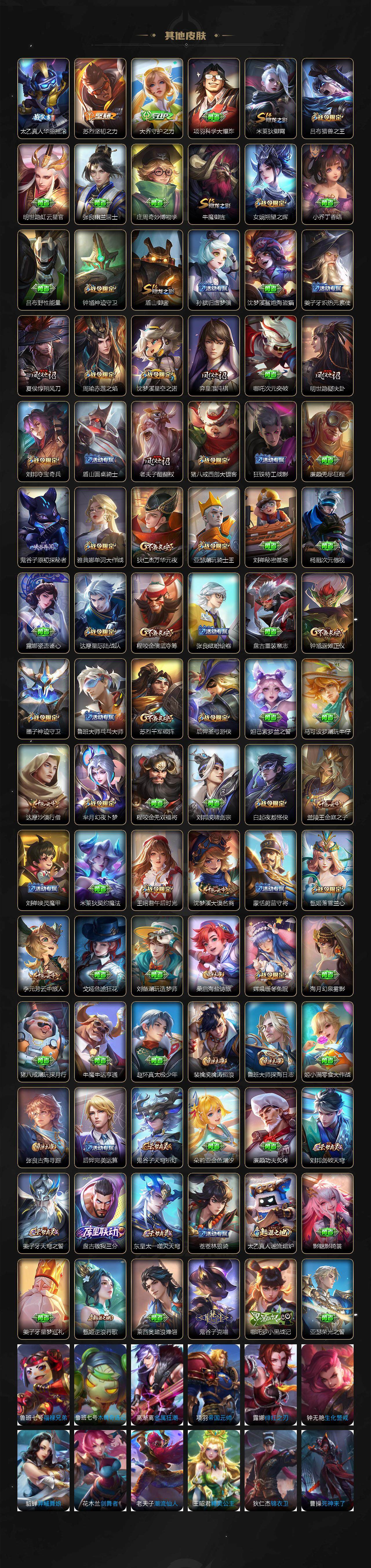 亚瑟狮心王,庄周蜃楼王,孙膑妖精王,扁鹊炼金王,虞姬凯尔特女王,白起狰,太乙真人饕餮,曹操烛龙,芈月重明,典韦穷奇,狂铁御狮,米莱狄御霄,牛魔御旌,盾山御銮,夏侯惇朔风刀,明世隐疑决卦,老夫子醍醐杖,鬼谷子原初探秘者,狄仁杰万华元夜,程咬金演武夺筹,钟馗驱傩正仪,苏烈千军破阵,吕布猎兽之王,嬴政白昼王子,女娲朔望之晖,典韦蓝屏警告,钟馗神迹守卫,鲁班七号狮舞东方,沈梦溪星空之诺,李元芳银河之约,刘邦夺宝奇兵,马可波罗暗影游猎,蒙犽狂想玩偶喵,元歌云间偶戏,弈星混沌棋,达摩沙漠行僧,兰陵王金庭之子,沈梦溪大漠名商,李元芳云中旅人,桑启海盐诗旅,裴擒虎擒涛扼浪,鲁班大师探海日志,张良古海寻踪
