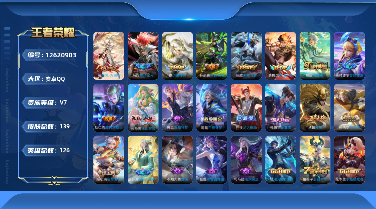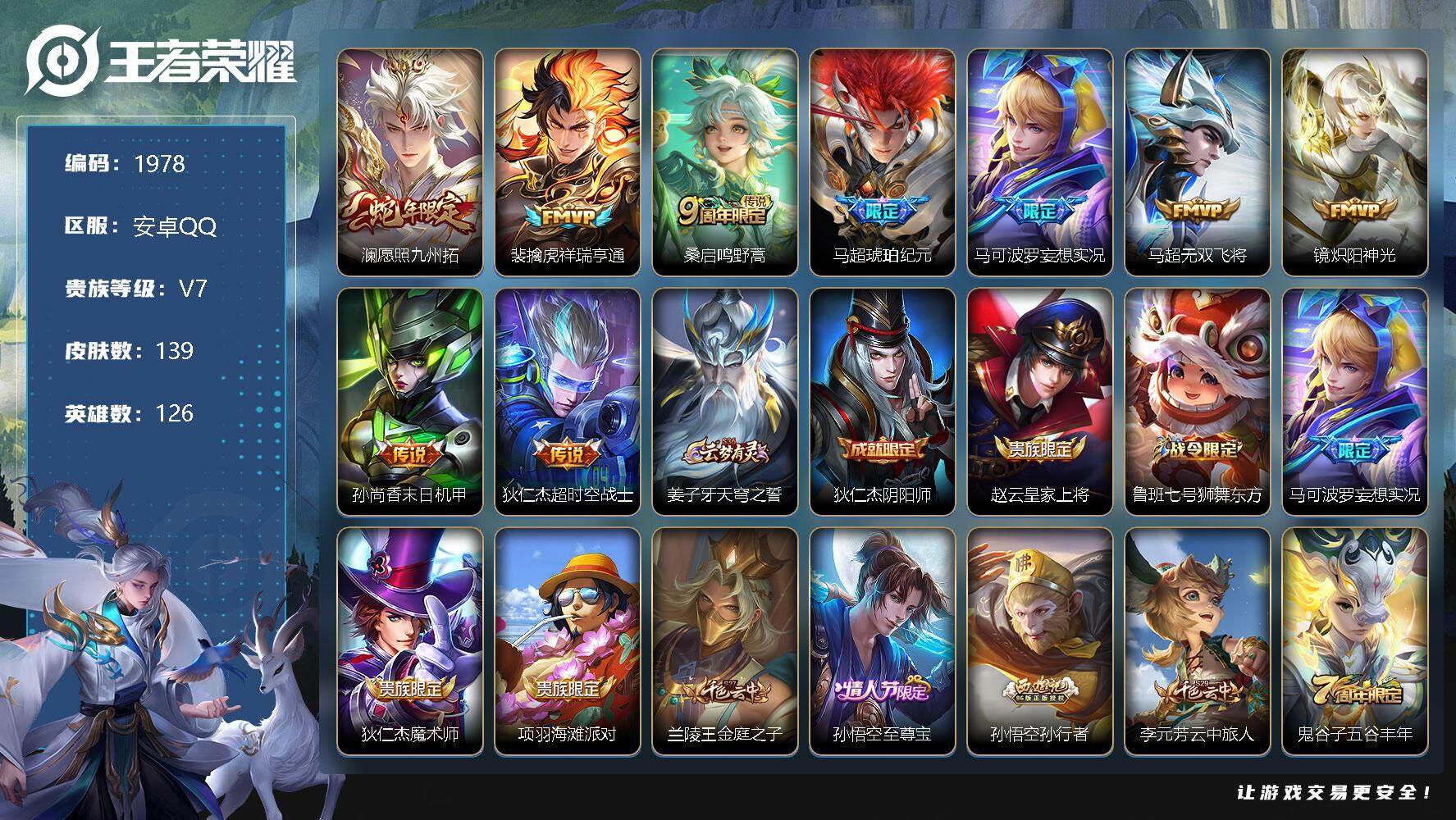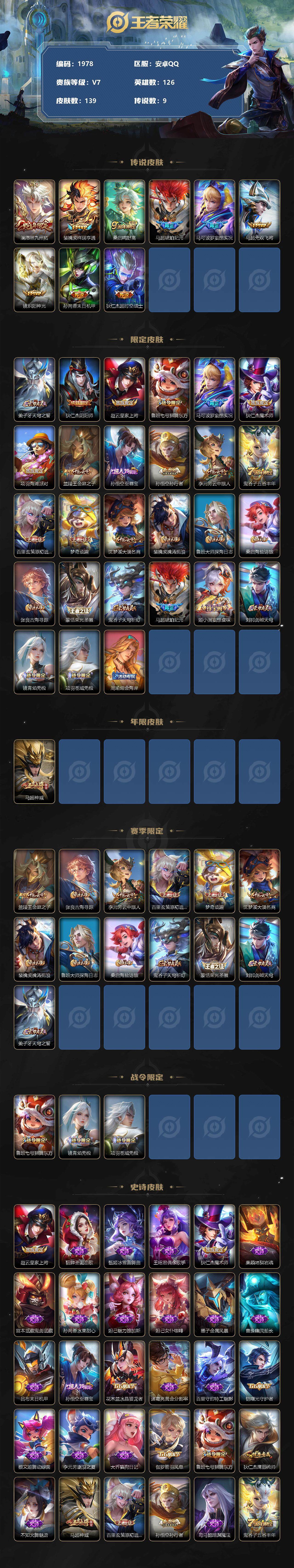 [12620903]安卓Q-V6-最强王者段位-126英雄-139皮肤-0典藏-0珍品无双-0无双-0珍品传说-9传说-42史诗