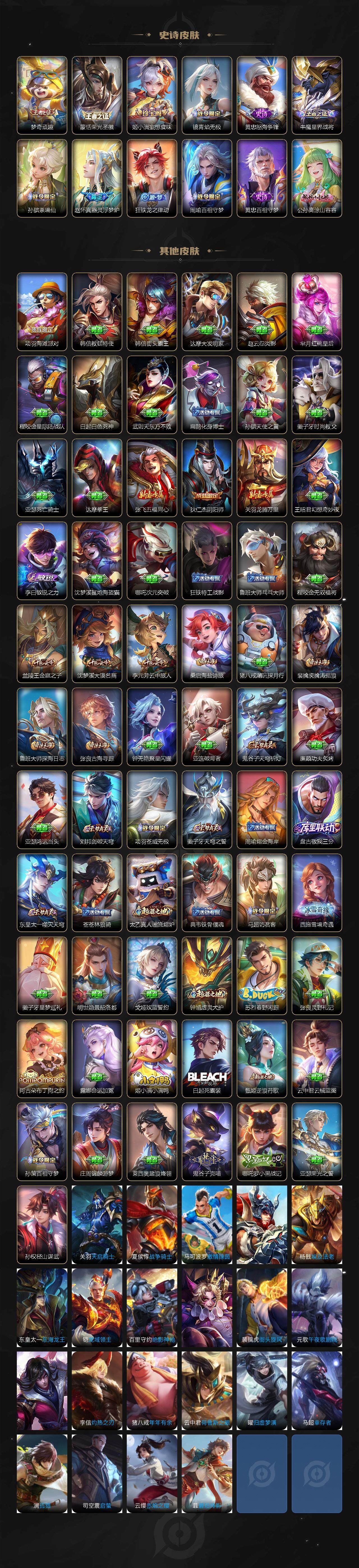 【史诗皮肤】:赵云皇家上将,貂蝉圣诞恋歌,甄姬冰雪圆舞曲,王昭君偶像歌手,狄仁杰魔术师,廉颇地狱岩魂,宫本武藏鬼剑武藏,孙尚香水果甜心,妲己魅力维加斯,妲己女仆咖啡,墨子金属风暴,曹操幽灵船长,吕布末日机甲,孙悟空至尊宝,花木兰水晶猎龙者,诸葛亮黄金分割率,百里守约特工魅影,铠曙光守护者,蔡文姬舞动绿茵,李元芳逐浪之夏,大乔猫狗日记,伽罗箭羽风息,鲁班七号狮舞东方,狄仁杰鹰眼统帅,不知火舞魅语,马超神威,百里玄策原初追逐者,孙悟空孙行者,司马懿暗渊魔法,鬼谷子五谷丰年,梦奇顽趣,蒙恬荣光圣徽,姬小满妄想食味,镜青焰无极,黄忠怒海争锋,牛魔星界战将,孙膑茶境仙,赵怀真器灵浮梦炉,狂铁龙之律动,周瑜百相守梦,黄忠百相守梦,公孙离涂山容容