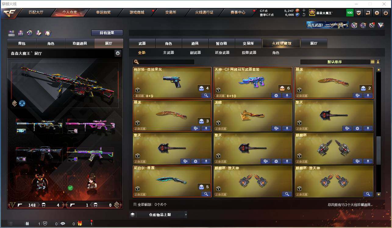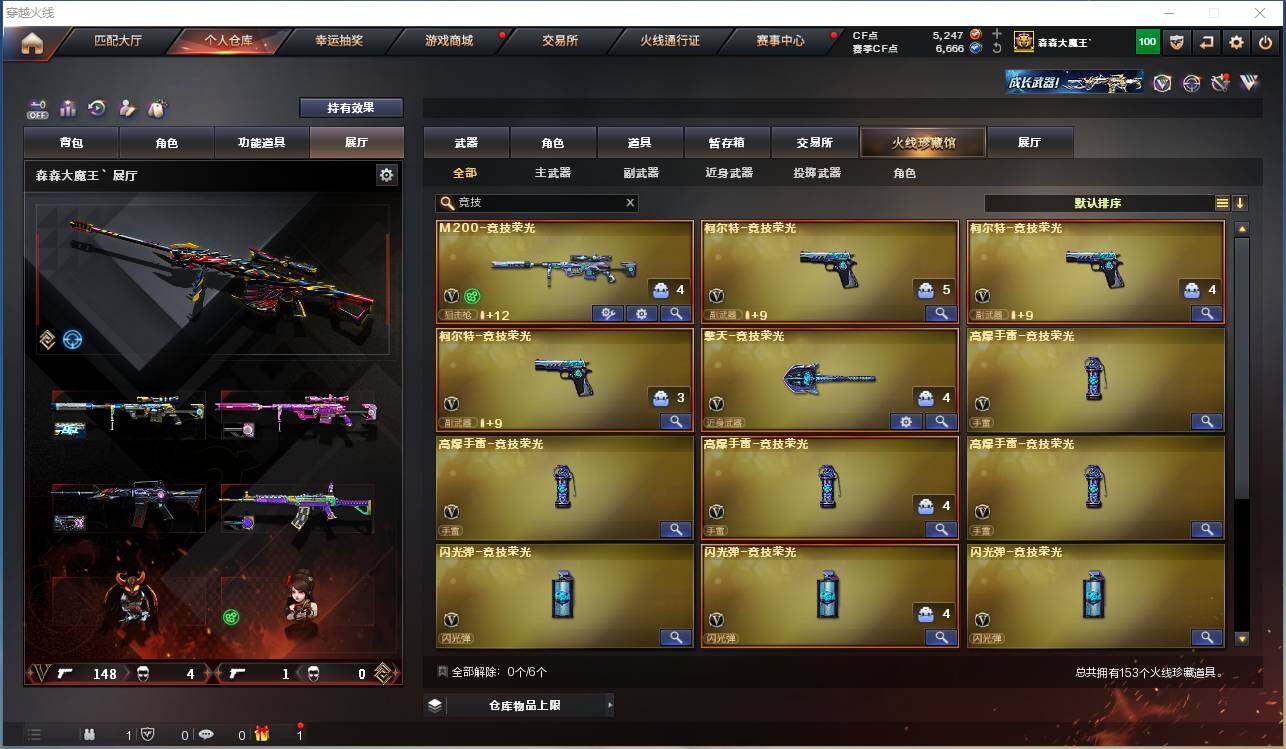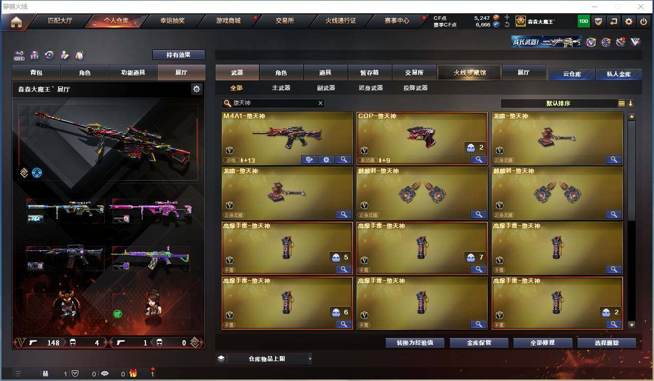 【热门武器】:传说梦魇,QBZ03-金色蔷薇,M200-幻神,M200-竞技荣光,死亡之眼,Kar98K-星神,炼狱-迷你小钢,M4A1-黑骑士*2,汤姆逊-烈龙*7,加特林-炼狱*8,斯泰尔-蝴蝶,羊驼玩偶,毁灭-孙三炮,USP-雷暴,COP-堕天神,沙鹰-修罗*4,Knife-冠军之刃