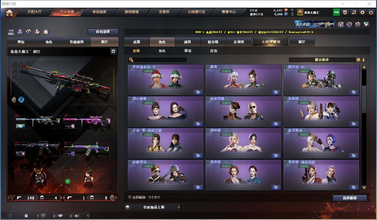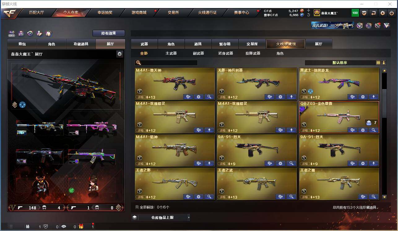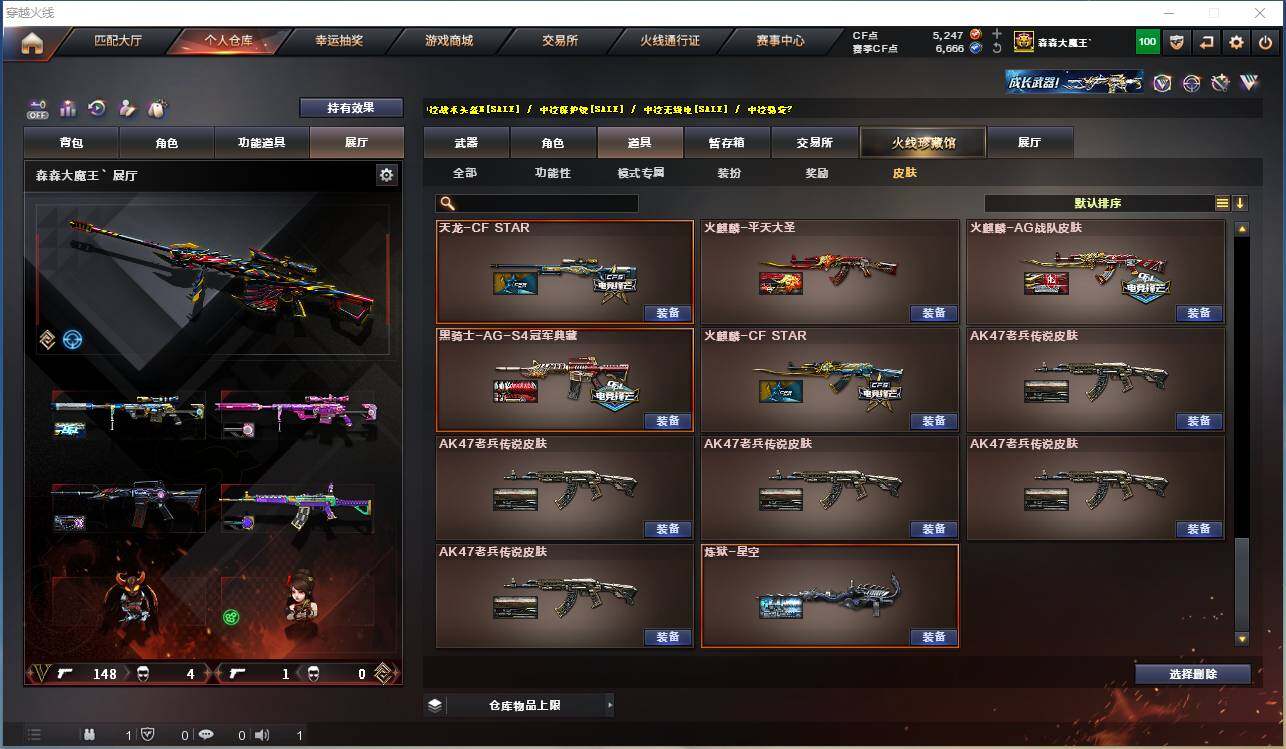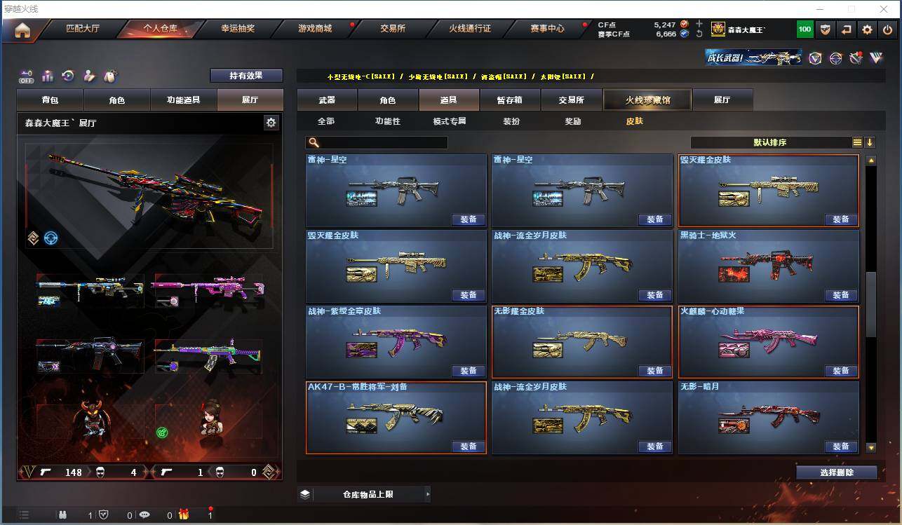 【热门武器】:传说梦魇,QBZ03-金色蔷薇,M200-幻神,M200-竞技荣光,死亡之眼,Kar98K-星神,炼狱-迷你小钢,M4A1-黑骑士*2,汤姆逊-烈龙*7,加特林-炼狱*8,斯泰尔-蝴蝶,羊驼玩偶,毁灭-孙三炮,USP-雷暴,COP-堕天神,沙鹰-修罗*4,Knife-冠军之刃