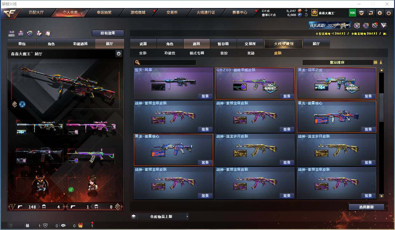 【稀有皮肤】:幻神-冠军之幻,幻神-宠儿-2021MVP,幻神-纸灯龙皮肤,QBZ03-巅峰荣耀皮肤,雷神-星空*2,雷神-R.LGD-CFPLS18冠军,火麒麟-平天大圣,火麒麟-心动糖果,黑骑士-地狱火,黑骑士-AG-S4冠军典藏,黑龙-冠军之武,炼狱-星空,毁灭-暗月,毁灭耀金皮肤*2,毁灭-风暴*2,无影耀金皮肤
