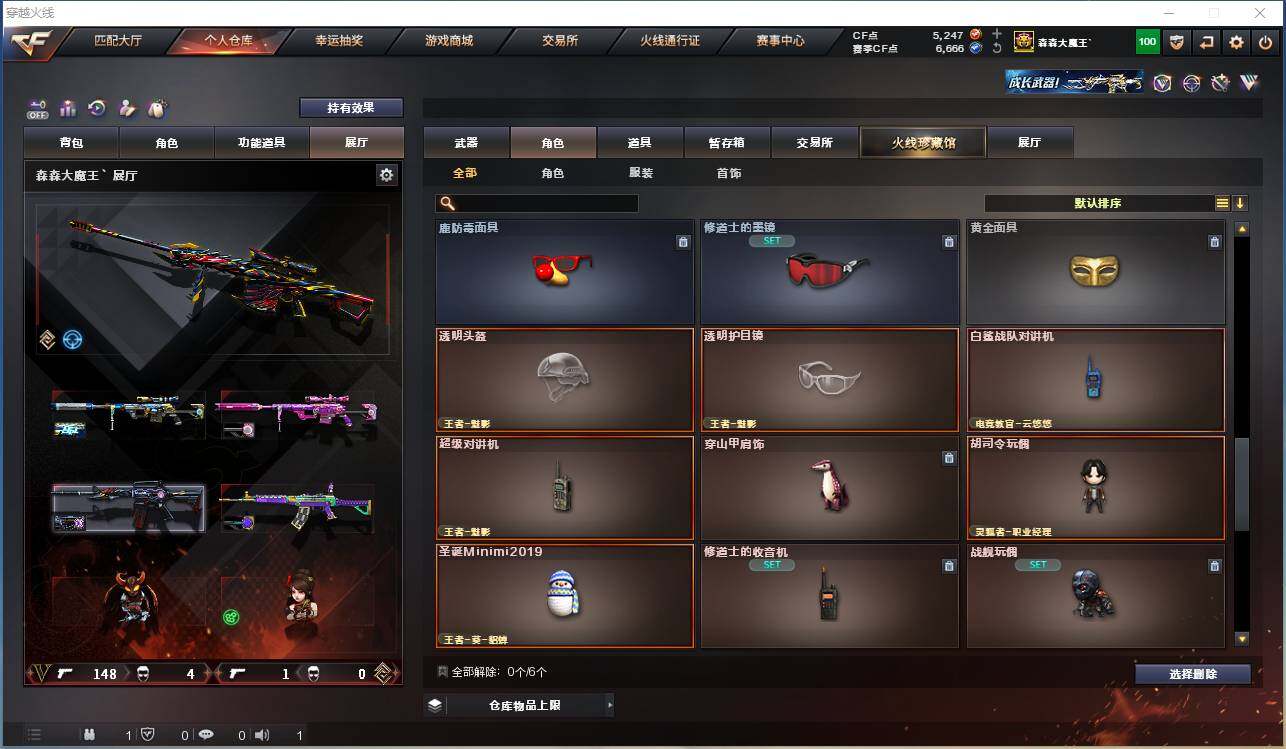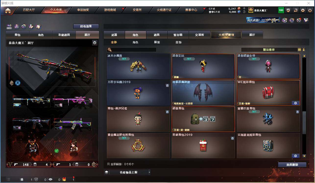 【人偶武器】:毁灭-孙三炮,斯泰尔-蝴蝶,巴雷特-零-水下丽影,AWM-灵狐-15周年嘉年华,M37-葵,炼狱-迷你小钢,迷你艾比,迷你超能女侍,夺魂*2,迷你牛牛,迷你生化手雷*2,灵狐娃娃手雷,生化手雷-机甲核心,深渊终结者手雷,闪光弹-小乔,闪光弹-貂蝉,高爆手雷-大乔