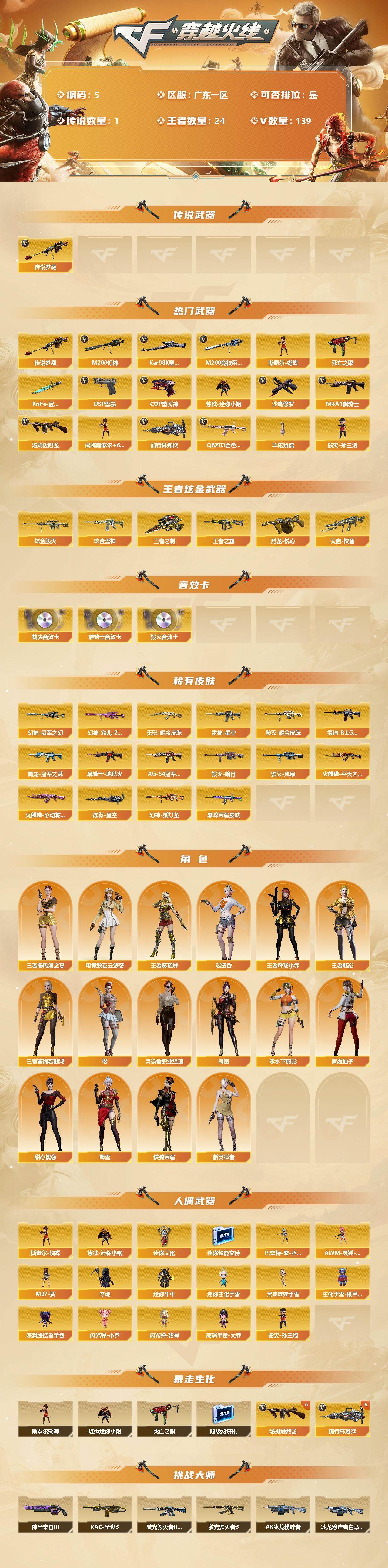 [12621705]广东一区-139V-24王者-2炫金 【传说武器】:传说梦魇 【热门武器】:传说梦魇,QBZ03-金色蔷薇,M200-幻神,M200-竞技荣光,死亡之眼,Kar98K-星神,炼狱-迷你小钢,M4A1-黑骑士*2,汤姆逊-烈龙*7,加特林-炼狱*8,斯泰尔-蝴蝶,羊驼玩偶,毁灭-孙三炮,USP-雷暴,COP-堕天神,沙鹰-修罗*4,Knife-冠军之刃 【王者炫金武器】:炫金毁灭,炫金雷神,烈龙-悦心,天启-悦智,王者之霆,王者之刺 【音效卡】:M4A1-黑骑士音效卡,Barrett-毁灭音效卡,AWM-裁决音效卡 【稀有皮肤】:幻神-冠军之幻,幻神-宠儿-2021MVP,幻神-纸灯龙皮肤,QBZ03-巅峰荣耀皮肤,雷神-星空*2,雷神-R.LGD-CFPLS18冠军,火麒麟-平天大圣,火麒麟-心动糖果,黑骑士-地狱火,黑骑士-AG-S4冠军典藏,黑龙-冠军之武,炼狱-星空,毁灭-暗月,毁灭耀金皮肤*2,毁灭-风暴*2,无影耀金皮肤 【角色】:王者樱-热浪之夏,王者-葵-貂蝉,王者葵-惊若翩鸿,王者-魅影,王者玲珑-小乔,零-水下丽影,灵狐者-职业经理,樱,迷迭香,电竞教官-云悠悠,司雨,蜀雪,新灵狐者,铁骑荣耀,青霞仙子,甜心偶像 【人偶武器】:毁灭-孙三炮,斯泰尔-蝴蝶,巴雷特-零-水下丽影,AWM-灵狐-15周年嘉年华,M37-葵,炼狱-迷你小钢,迷你艾比,迷你超能女侍,夺魂*2,迷你牛牛,迷你生化手雷*2,灵狐娃娃手雷,生化手雷-机甲核心,深渊终结者手雷,闪光弹-小乔,闪光弹-貂蝉,高爆手雷-大乔 【暴走生化】:斯泰尔-蝴蝶,炼狱-迷你小钢,死亡之眼,超级对讲机 【挑战大师】:神圣爆裂者-末日III,KAC-圣炎切割者III,激光毁灭者III,激光毁灭者III-白马银枪,AK47-冰龙粉碎者,冰龙粉碎者-白马银枪 【英雄级武器】:M200-竞技荣光,柯尔特-竞技荣光*3,擎天-竞技荣光,高爆手雷-竞技荣光*4,烟雾弹-竞技荣光*3,闪光弹-竞技荣光*4,M4A1-堕天神,COP-堕天神,麒麟刺-堕天神*2,龙啸-堕天神*2,USP-雷暴,M4A1-武圣,Glock18-武圣,QBZ03-金色蔷薇,无影-神兵利器,M4A1-雷神*4,M4A1-黑龙*2,M4A1-玫瑰精灵*2,M4A1-黑骑士*2,M4A1-死神,加特林-炼狱*8,汤姆逊-烈龙*7,AK47-