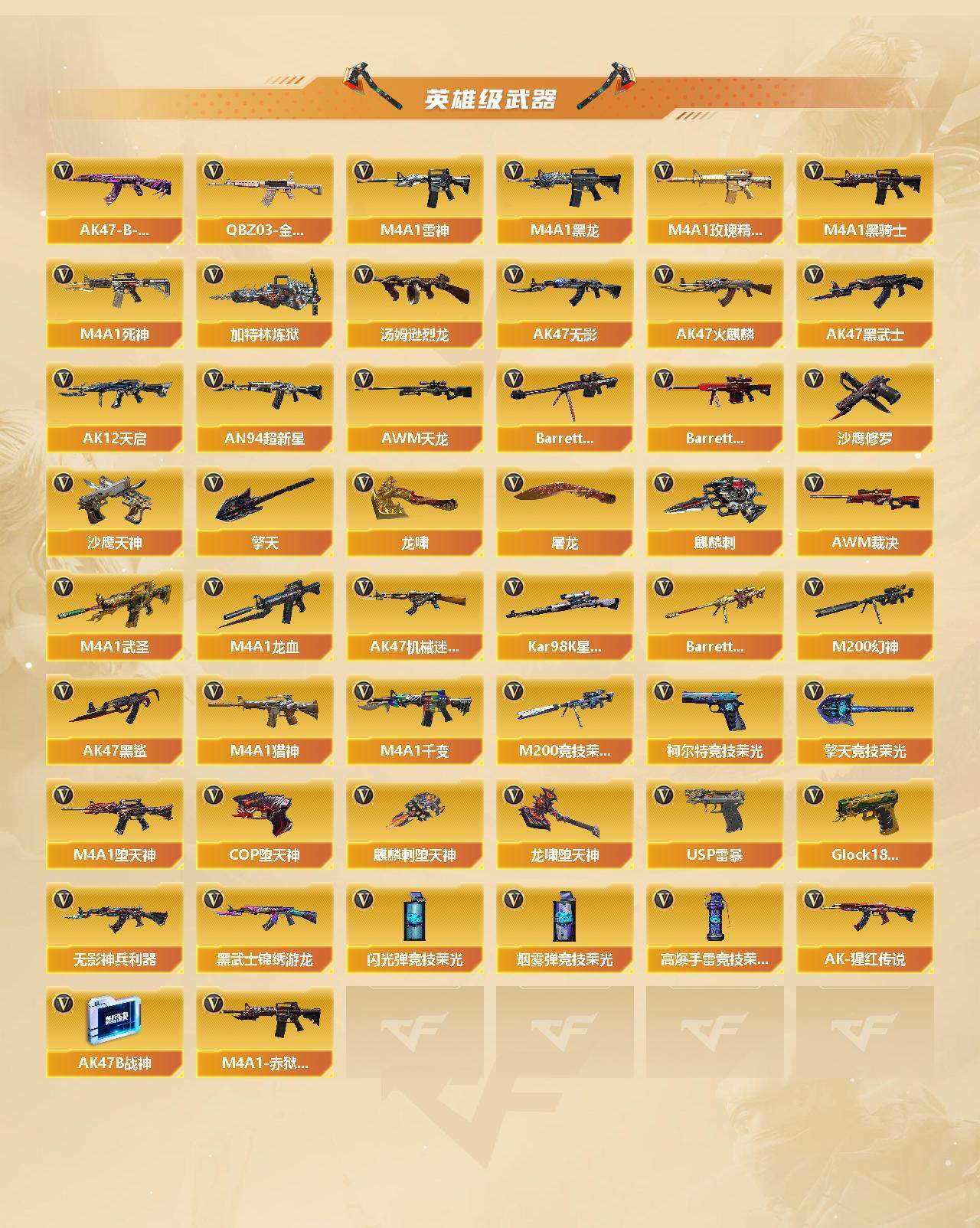 【英雄级武器】:M200-竞技荣光,柯尔特-竞技荣光*3,擎天-竞技荣光,高爆手雷-竞技荣光*4,烟雾弹-竞技荣光*3,闪光弹-竞技荣光*4,M4A1-堕天神,COP-堕天神,麒麟刺-堕天神*2,龙啸-堕天神*2,USP-雷暴,M4A1-武圣,Glock18-武圣,QBZ03-金色蔷薇,无影-神兵利器,M4A1-雷神*4,M4A1-黑龙*2,M4A1-玫瑰精灵*2,M4A1-黑骑士*2,M4A1-死神,加特林-炼狱*8,汤姆逊-烈龙*7,AK47-