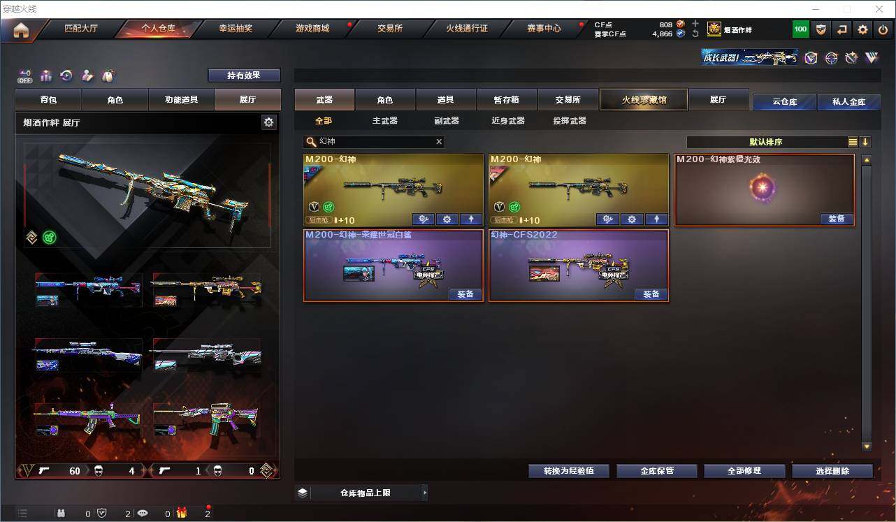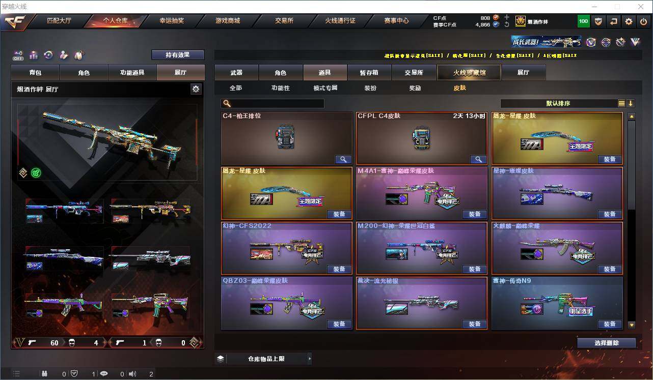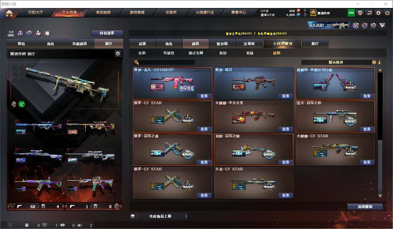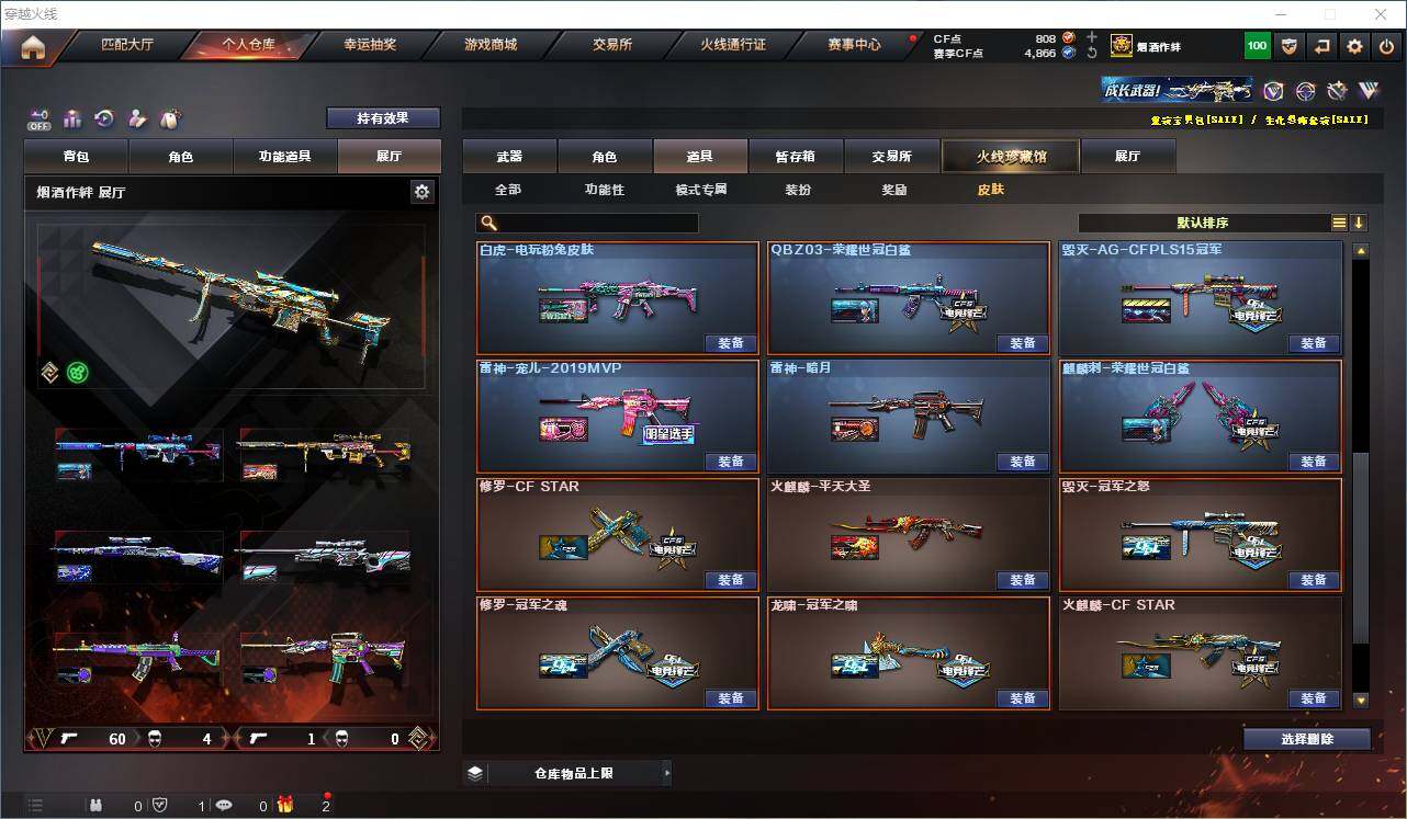 【稀有皮肤】:幻神-CFS2022,M200-幻神-荣耀世冠白鲨,星神-璀璨皮肤,白虎-电玩粉兔皮肤,QBZ03-荣耀世冠白鲨,QBZ03-巅峰荣耀皮肤,雷神-传奇N9,雷神-宠儿-2019MVP,火麒麟-平天大圣,火麒麟-巅峰荣耀,毁灭-冠军之怒,修罗-冠军之魂,龙啸-冠军之啸