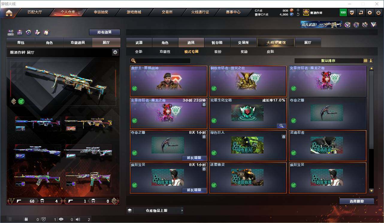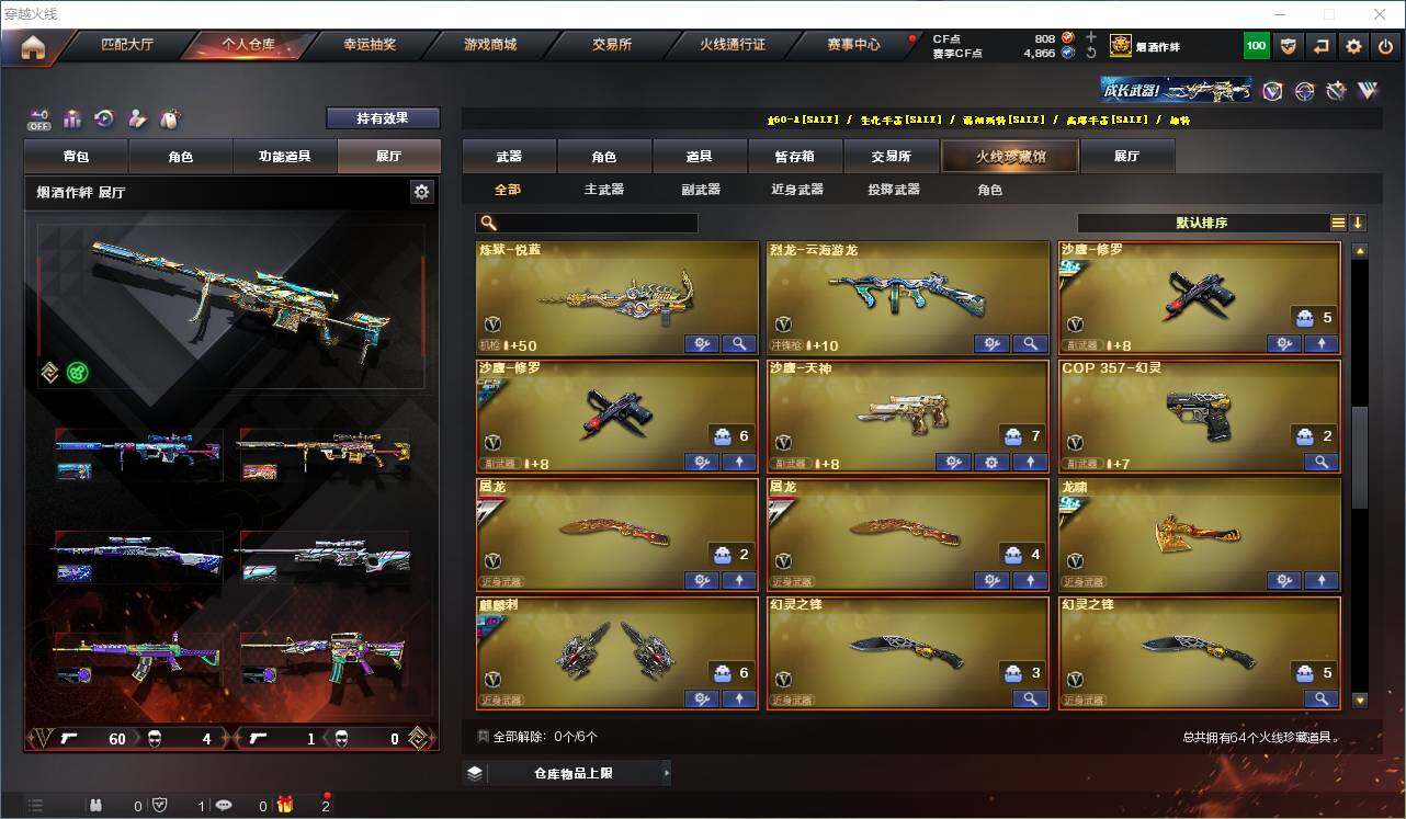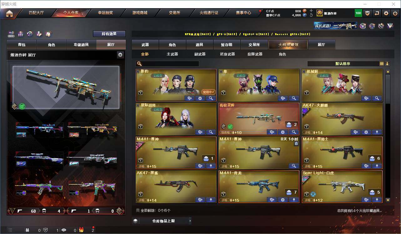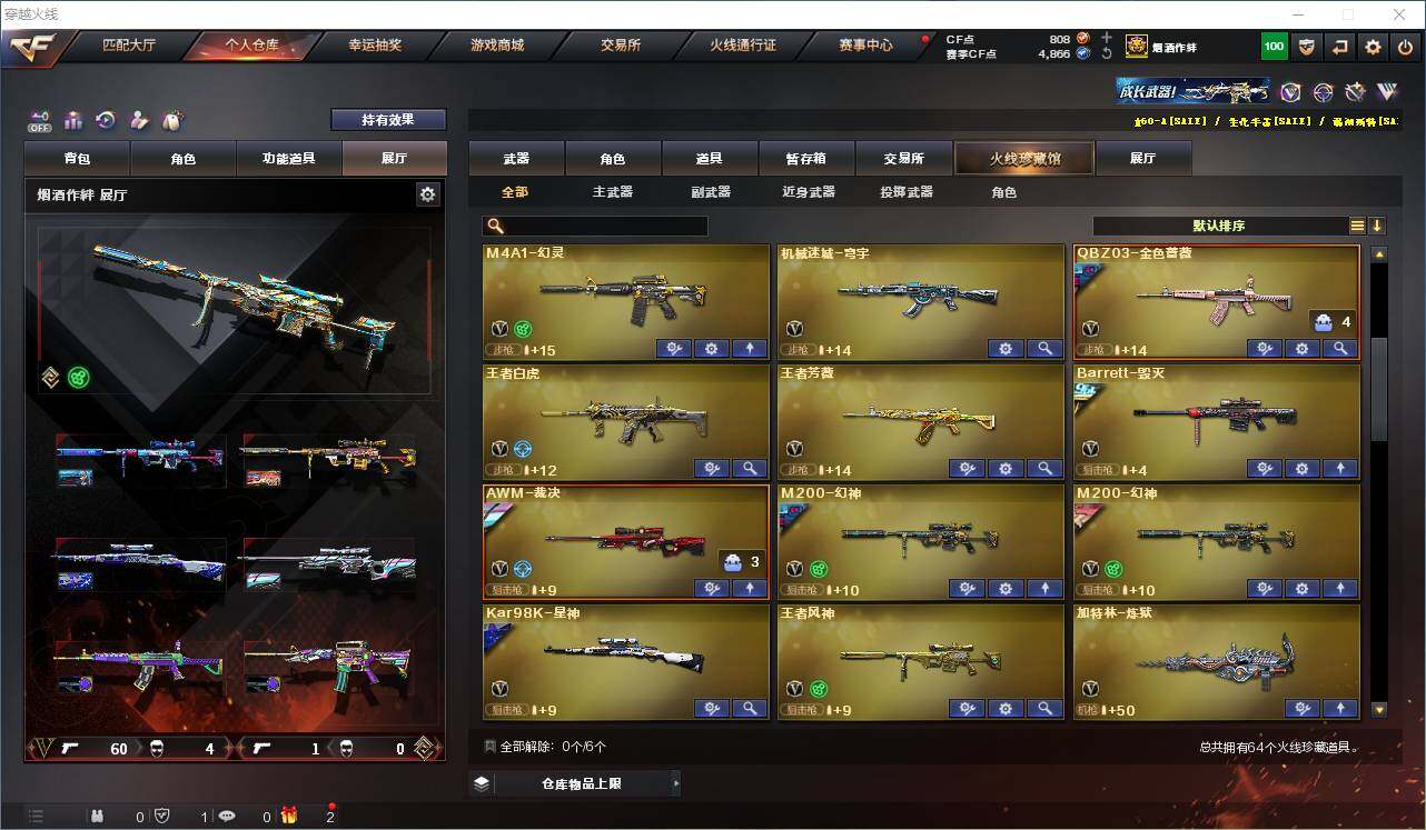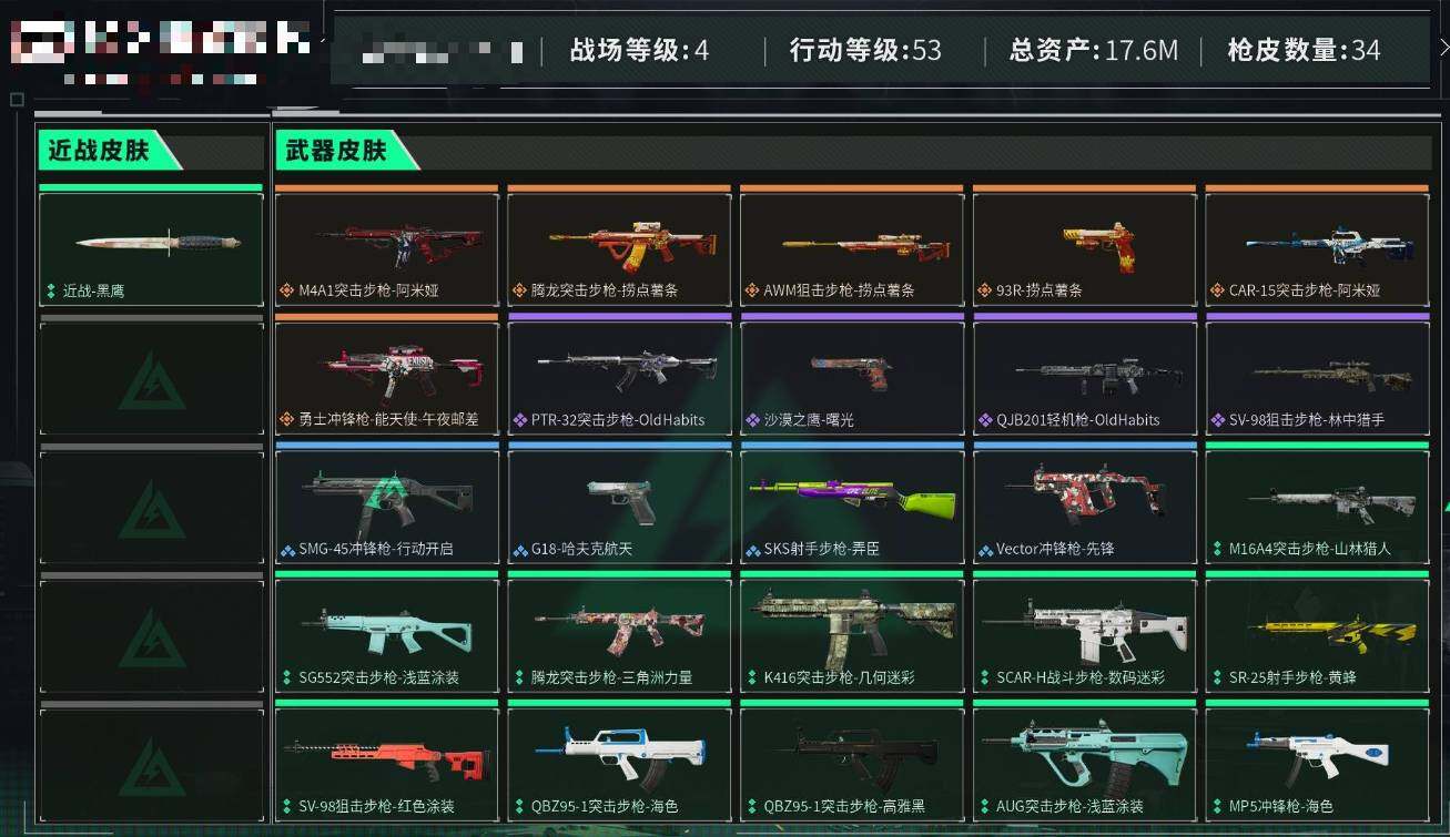 【热门武器】:传说灵眸,QBZ03-金色蔷薇,Scar Light-白虎,M4A1-青龙,M200-幻神*2,Kar98K-星神,C.A.T,M4A1-黑骑士,加特林-炼狱,M4A1-小神龙,COP-白鲨*2,COP 357-幻灵,沙鹰-修罗*2,柯尔特-赛博朋克,Knife-冠军之刃,黄金猫猫手套-白鲨