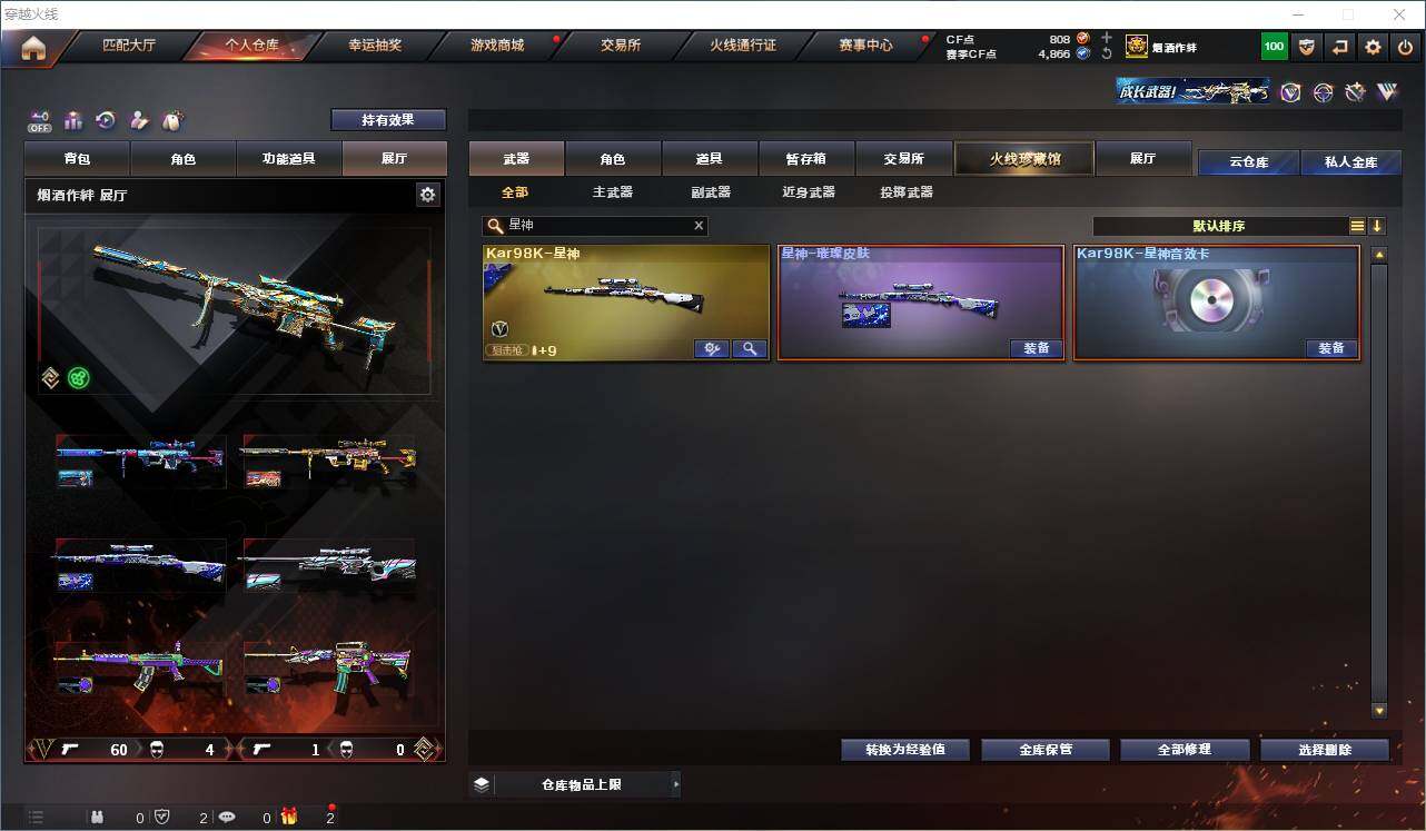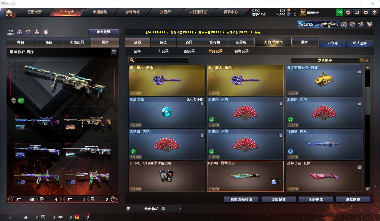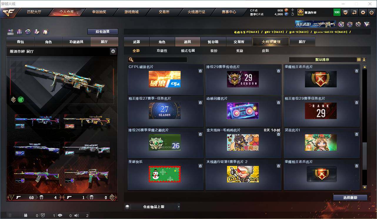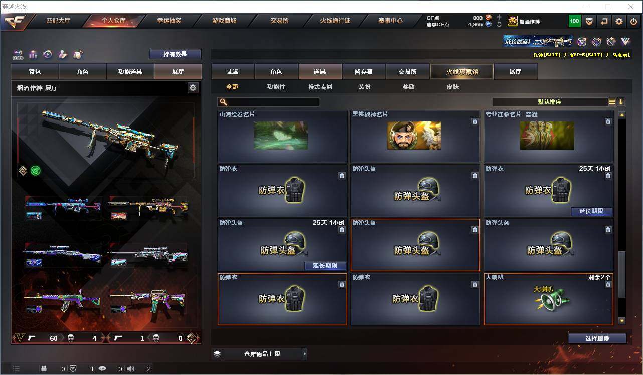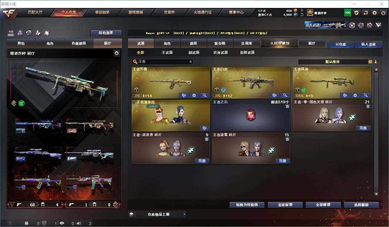 【热门武器】:传说灵眸,QBZ03-金色蔷薇,Scar Light-白虎,M4A1-青龙,M200-幻神*2,Kar98K-星神,C.A.T,M4A1-黑骑士,加特林-炼狱,M4A1-小神龙,COP-白鲨*2,COP 357-幻灵,沙鹰-修罗*2,柯尔特-赛博朋克,Knife-冠军之刃,黄金猫猫手套-白鲨