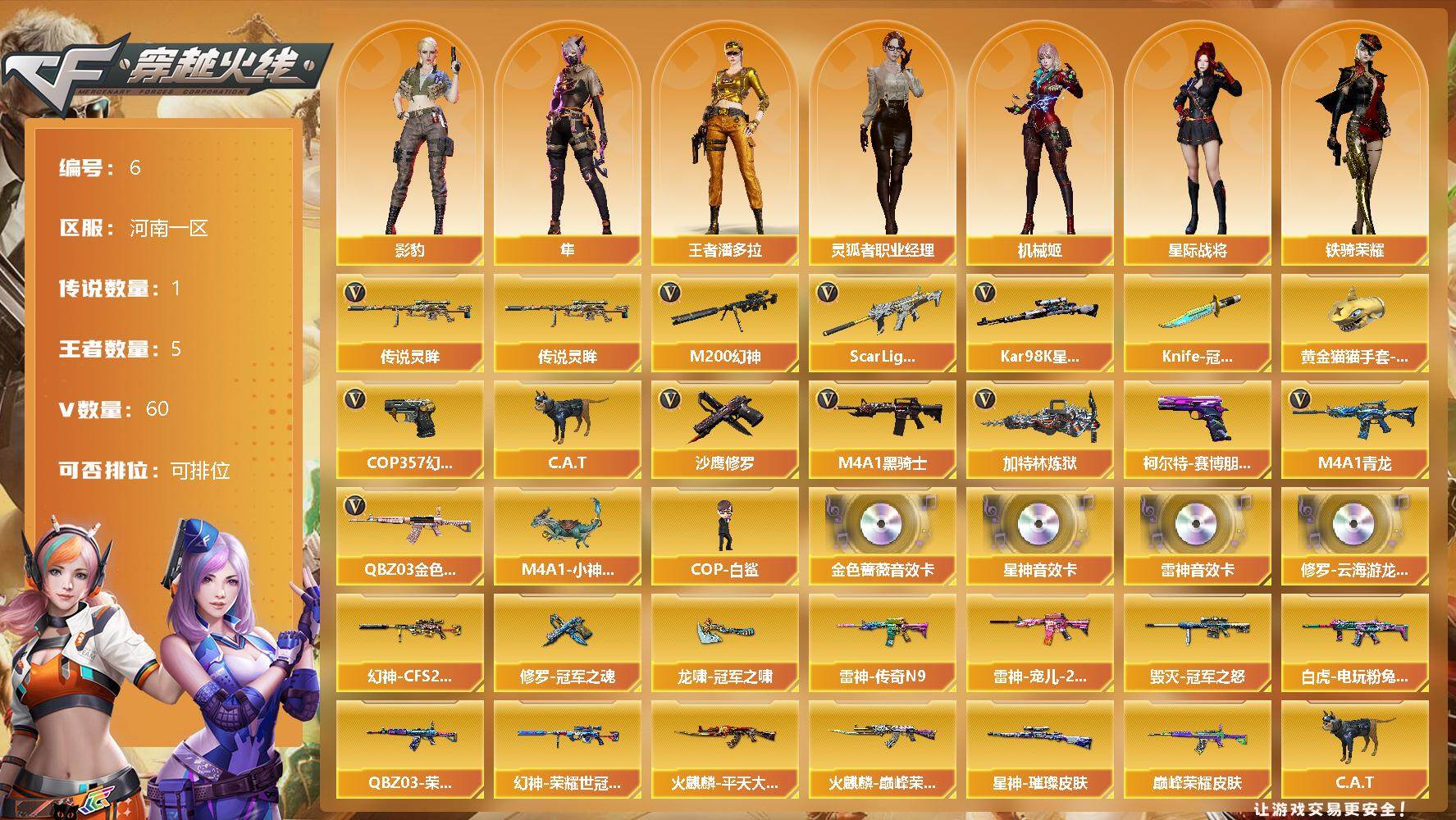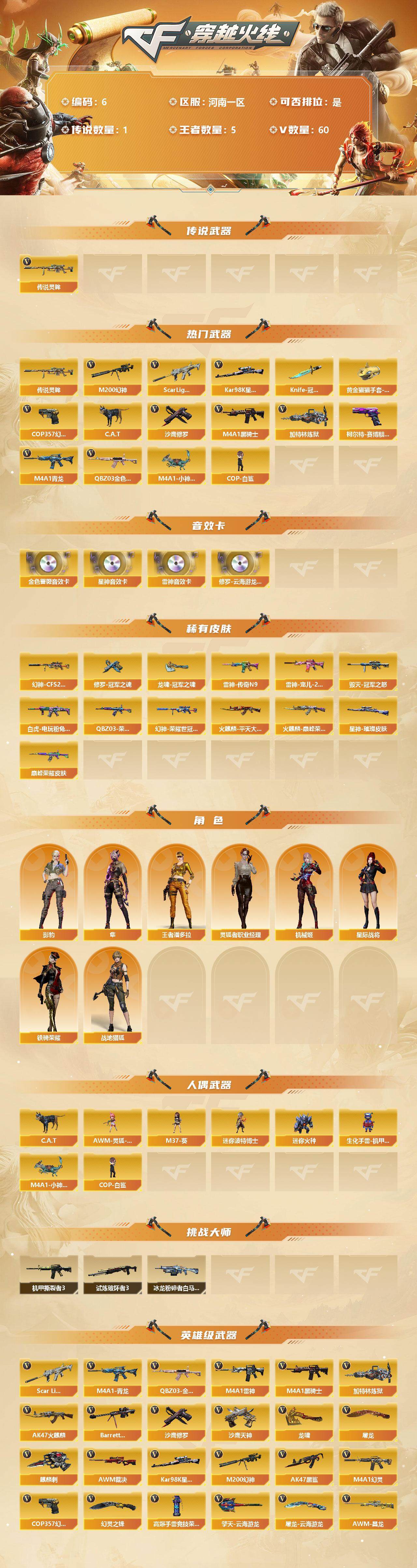 [12621731]河南一区-60V-5王者-0炫金 【传说武器】:传说灵眸 【热门武器】:传说灵眸,QBZ03-金色蔷薇,Scar Light-白虎,M4A1-青龙,M200-幻神*2,Kar98K-星神,C.A.T,M4A1-黑骑士,加特林-炼狱,M4A1-小神龙,COP-白鲨*2,COP 357-幻灵,沙鹰-修罗*2,柯尔特-赛博朋克,Knife-冠军之刃,黄金猫猫手套-白鲨 【音效卡】:修罗-云海游龙音效卡,M4A1-雷神音效卡,QBZ03-金色蔷薇音效卡,Kar98K-星神音效卡 【稀有皮肤】:幻神-CFS2022,M200-幻神-荣耀世冠白鲨,星神-璀璨皮肤,白虎-电玩粉兔皮肤,QBZ03-荣耀世冠白鲨,QBZ03-巅峰荣耀皮肤,雷神-传奇N9,雷神-宠儿-2019MVP,火麒麟-平天大圣,火麒麟-巅峰荣耀,毁灭-冠军之怒,修罗-冠军之魂,龙啸-冠军之啸 【角色】:王者潘多拉,灵狐者-职业经理,影豹,隼,星际战将,机械姬,战地猎狐,铁骑荣耀 【人偶武器】:M4A1-小神龙,COP-白鲨*2,AWM-灵狐-15周年嘉年华,M37-葵,C.A.T,迷你波特博士*2,迷你火种,生化手雷-机甲核心 【挑战大师】:机甲撕裂者III,试炼破坏者III,冰龙粉碎者-白马银枪 【英雄级武器】:高爆手雷-竞技荣光*4,M4A1-幻灵,COP 357-幻灵,幻灵之锋*2,QBZ03-金色蔷薇,Scar Light-白虎,M4A1-青龙,M4A1-雷神,M4A1-黑骑士,加特林-炼狱,AK47-火麒麟,Barrett-毁灭,AWM-裁决,Kar98K-星神,M200-幻神*2,AK47-黑鲨,AWM-昌龙,沙鹰-天神,沙鹰-修罗*2,麒麟刺,龙啸,屠龙*2,擎天-云海游龙,屠龙-云海游龙 【特殊枪械】:1白虎,1黑骑士,1炼狱