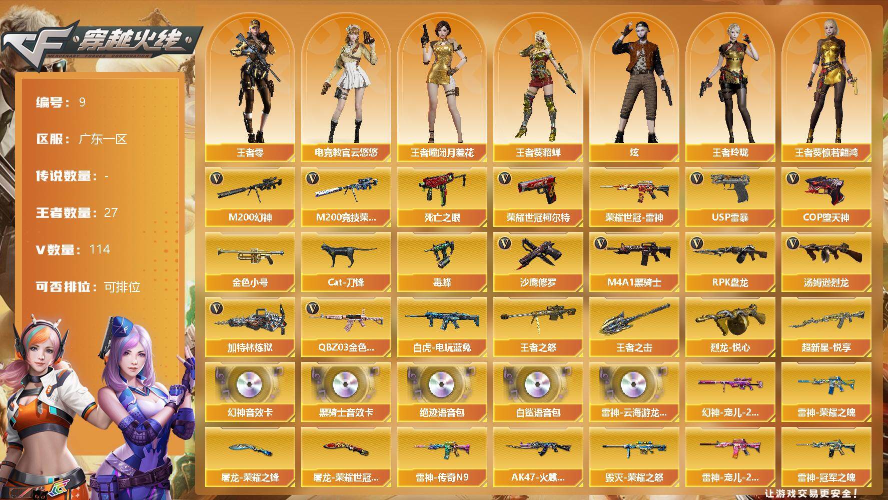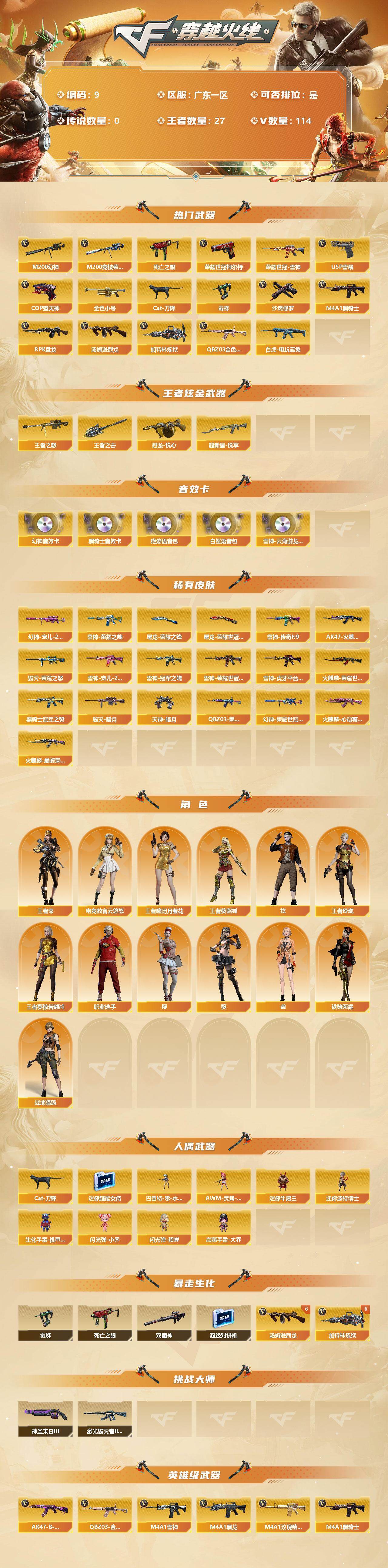 [12621774]广东一区-114V-27王者-0炫金 【热门武器】:QBZ03-金色蔷薇,M200-幻神,M200-竞技荣光,死亡之眼,荣耀世冠-雷神,白虎-电玩蓝兔,荣耀世冠-柯尔特,金色小号,Cat-刀锋,毒蜂,M4A1-黑骑士,汤姆逊-烈龙*6,RPK-盘龙,加特林-炼狱*7,USP-雷暴,COP-堕天神,沙鹰-修罗*5 【王者炫金武器】:烈龙-悦心,超新星-悦享,王者之怒,王者之击 【音效卡】:M200-幻神音效卡,M4A1-雷神-云海游龙音效卡,M4A1-黑骑士音效卡,绝迹语音包,白鲨语音包 【稀有皮肤】:幻神-宠儿-2021MVP,M200-幻神-荣耀世冠白鲨,QBZ03-荣耀世冠白鲨,雷神-荣耀之魄,雷神-冠军之魄,雷神-传奇N9,雷神-宠儿-2019MVP,雷神-虎牙平台皮肤,雷神-荣耀世冠AG,AK47-火麒麟-传奇EVEN,火麒麟-荣耀世冠AG,火麒麟-巅峰荣耀,火麒麟-心动糖果,黑骑士-冠军之势,毁灭-暗月,毁灭-荣耀之怒,天神-暗月,屠龙-荣耀之锋,屠龙-荣耀世冠AG 【角色】:王者-瞳-闭月羞花,王者-葵-貂蝉,王者葵-惊若翩鸿,王者-零,王者玲珑,葵,樱,炫,幽,电竞教官-云悠悠,战地猎狐,铁骑荣耀,职业选手 【人偶武器】:巴雷特-零-水下丽影,AWM-灵狐-15周年嘉年华*2,Cat-刀锋,迷你超能女侍,迷你牛魔王,迷你波特博士,生化手雷-机甲核心*2,闪光弹-小乔,闪光弹-貂蝉,高爆手雷-大乔 【暴走生化】:毒蜂,死亡之眼,双面神,超级对讲机 【挑战大师】:神圣爆裂者-末日III,激光毁灭者III-白马银枪 【英雄级武器】:M200-竞技荣光,柯尔特-竞技荣光,擎天-竞技荣光,高爆手雷-竞技荣光,烟雾弹-竞技荣光,闪光弹-竞技荣光,M4A1-堕天神*2,COP-堕天神,麒麟刺-堕天神*2,龙啸-堕天神*2,USP-雷暴,荣耀世冠-雷神,荣耀世冠-柯尔特,烈火-动感闪耀,天神-动感闪耀,屠龙-动感闪耀,手雷-动感闪耀,QBZ03-金色蔷薇,白虎-电玩蓝兔,无影-神兵利器,M4A1-雷神*3,M4A1-黑龙,M4A1-玫瑰精灵*2,M4A1-黑骑士,M4A1-死神,RPK-盘龙,加特林-炼狱*7,汤姆逊-烈龙*6,AK47-无影,AK47-火麒麟*3,AK47-黑武士,AWM-天龙,Barrett-毁灭,Barrett-极光,M200-幻神,M4A1-