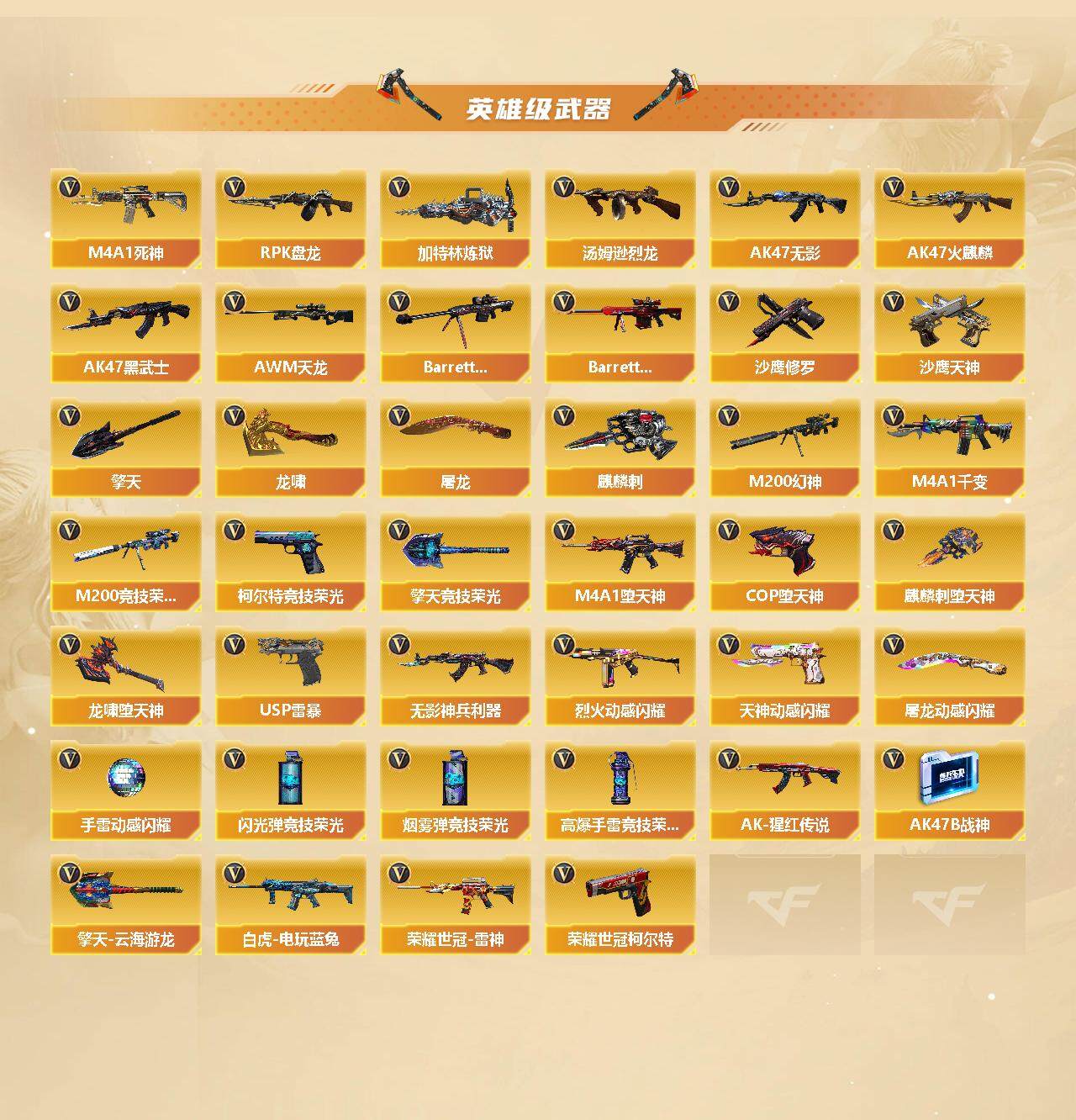 【英雄级武器】:M200-竞技荣光,柯尔特-竞技荣光,擎天-竞技荣光,高爆手雷-竞技荣光,烟雾弹-竞技荣光,闪光弹-竞技荣光,M4A1-堕天神*2,COP-堕天神,麒麟刺-堕天神*2,龙啸-堕天神*2,USP-雷暴,荣耀世冠-雷神,荣耀世冠-柯尔特,烈火-动感闪耀,天神-动感闪耀,屠龙-动感闪耀,手雷-动感闪耀,QBZ03-金色蔷薇,白虎-电玩蓝兔,无影-神兵利器,M4A1-雷神*3,M4A1-黑龙,M4A1-玫瑰精灵*2,M4A1-黑骑士,M4A1-死神,RPK-盘龙,加特林-炼狱*7,汤姆逊-烈龙*6,AK47-无影,AK47-火麒麟*3,AK47-黑武士,AWM-天龙,Barrett-毁灭,Barrett-极光,M200-幻神,M4A1-