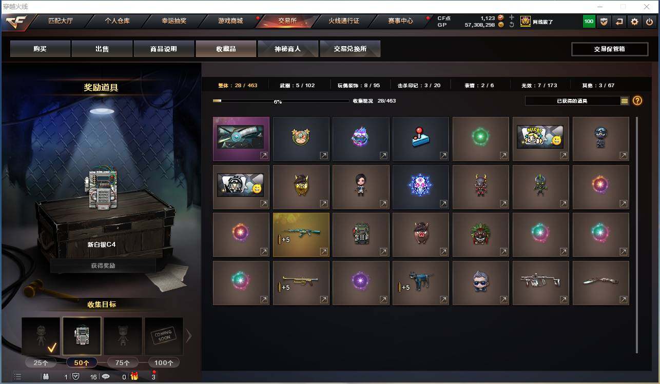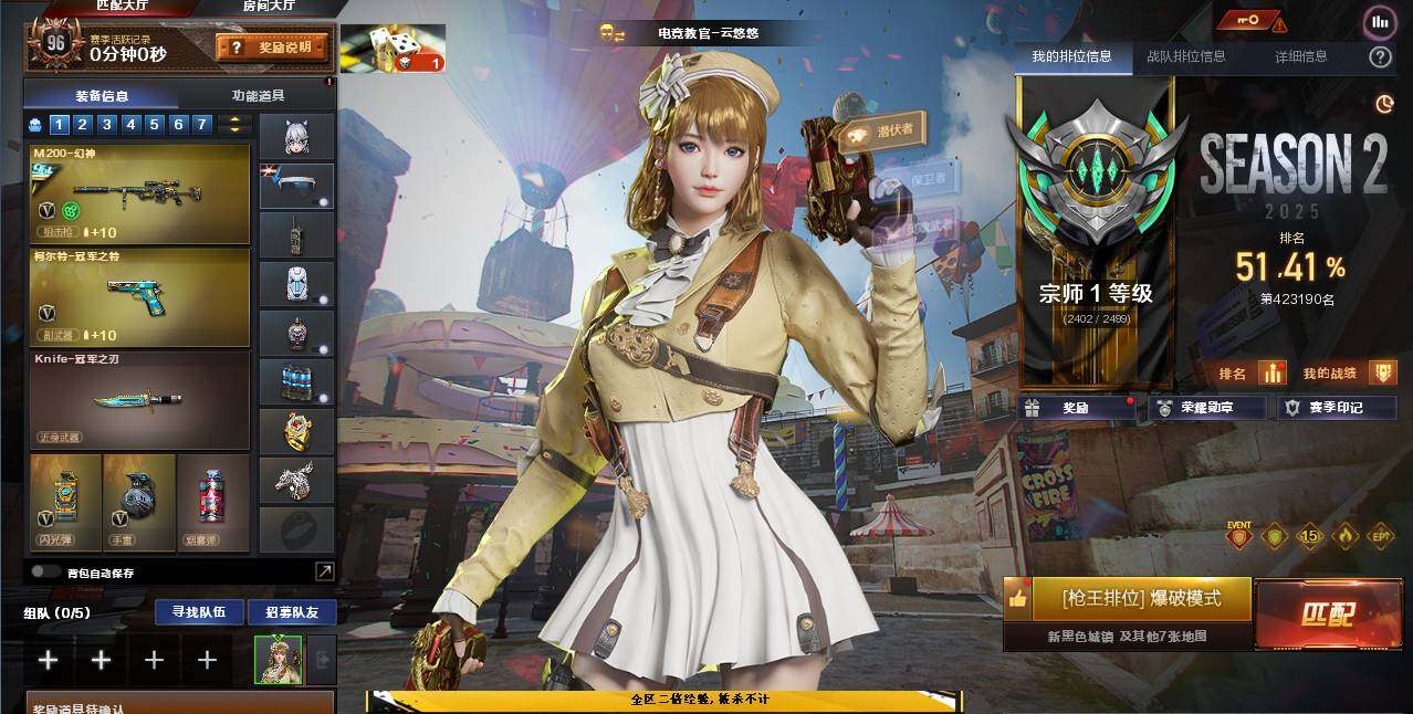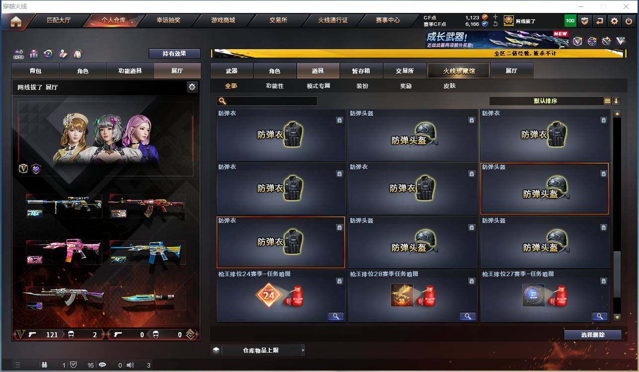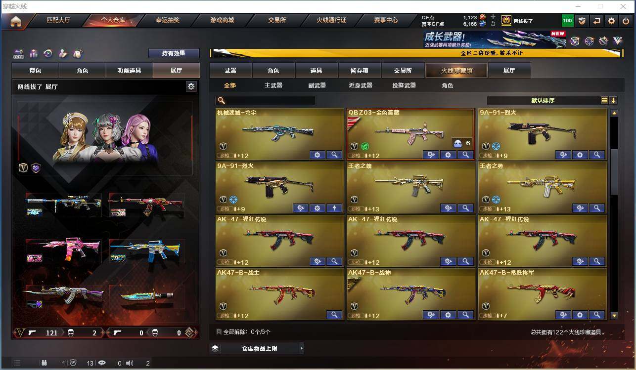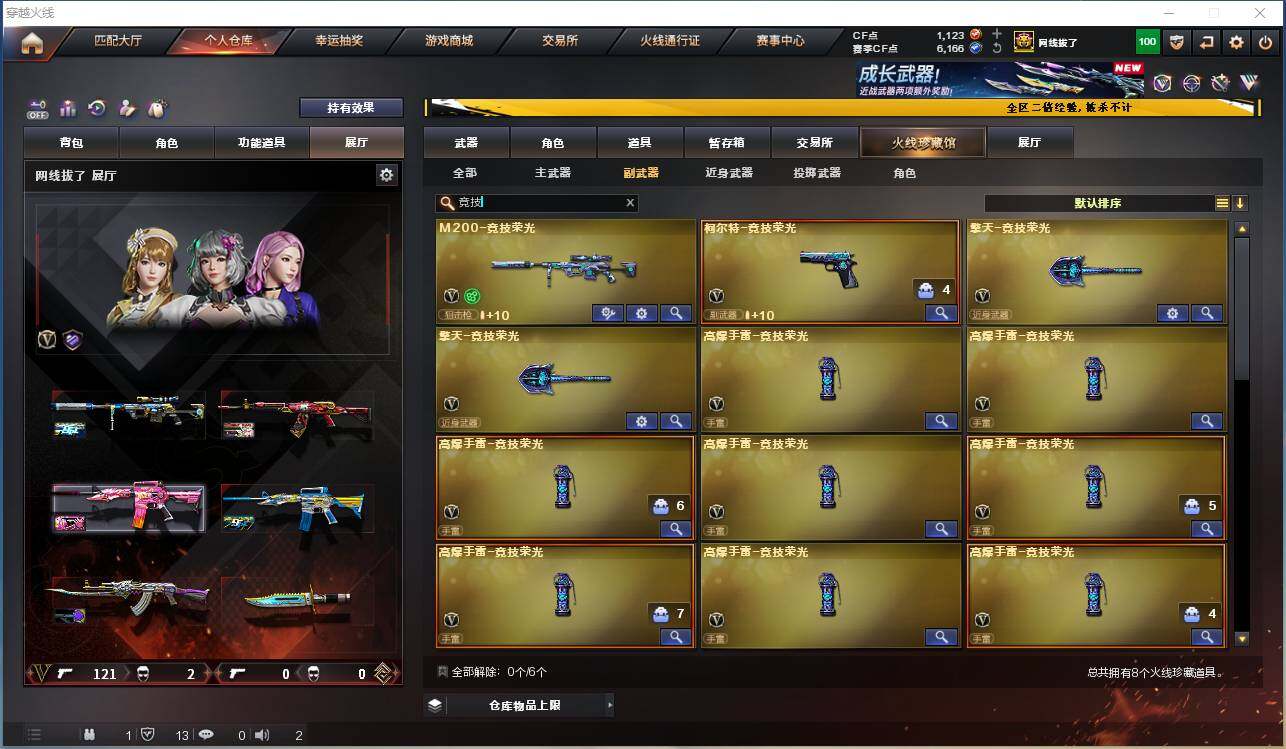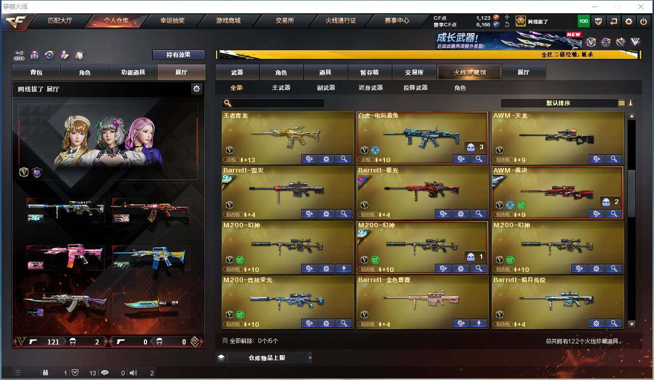 【热门武器】:QBZ03-金色蔷薇,HK417-朱雀,M200-幻神*3,M200-竞技荣光,死亡之眼,白虎-电玩蓝兔,柯尔特-冠军之特,金色小号,Cat-刀锋,M4A1-黑骑士*2,汤姆逊-烈龙*8,加特林-炼狱,羊驼玩偶,降世魔童,裁决-雪莉杨,COP 357-幻灵,沙鹰-修罗*3,Knife-冠军之刃