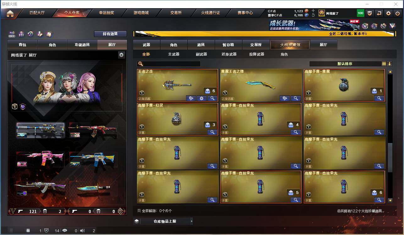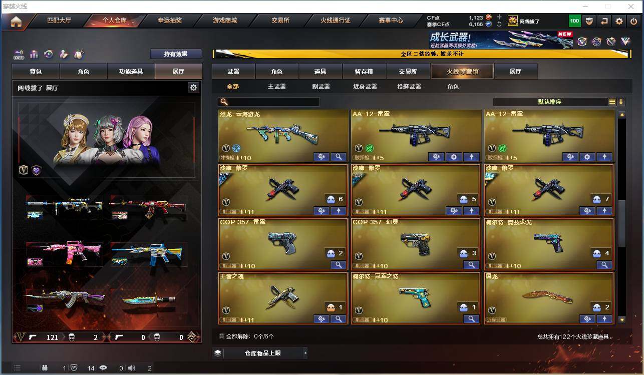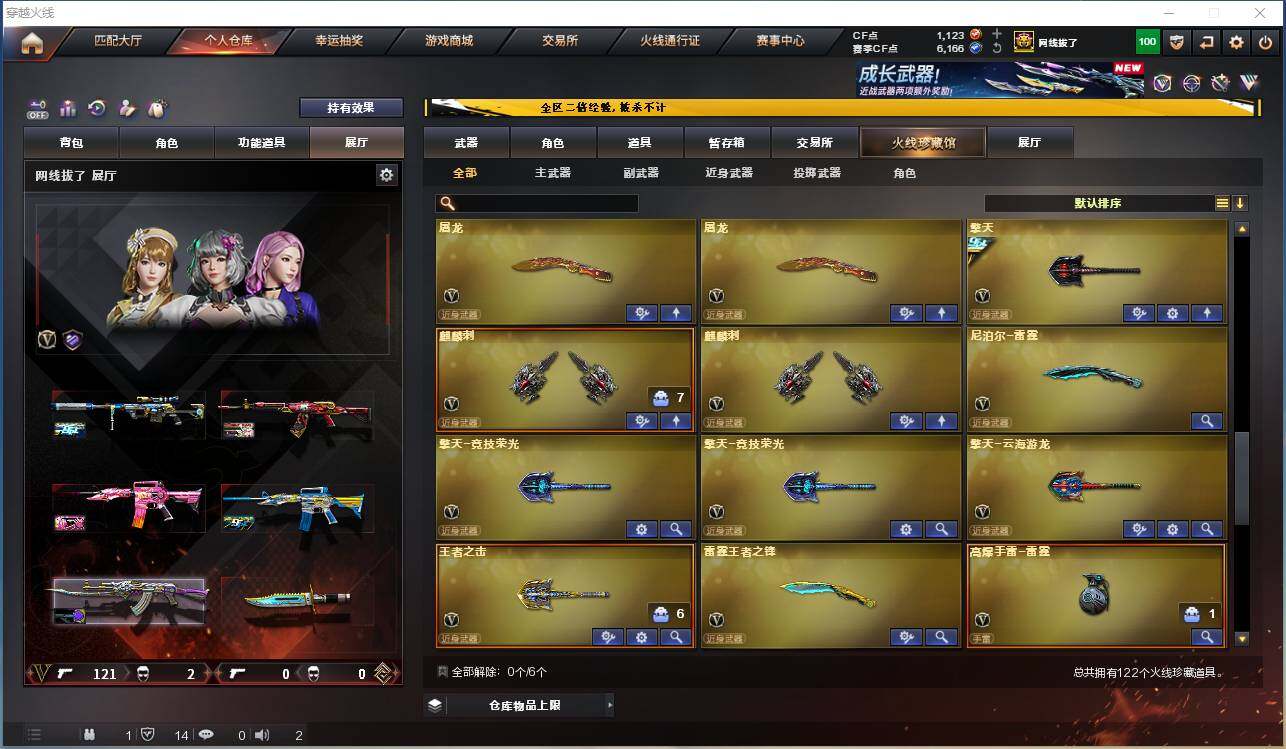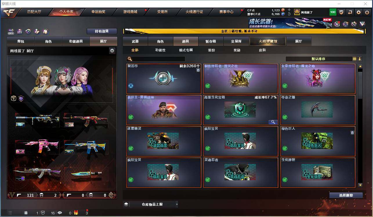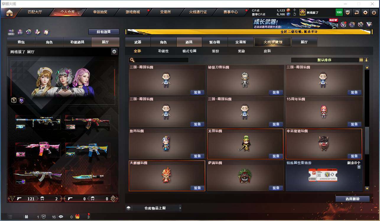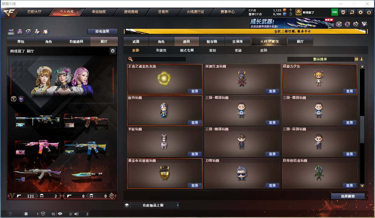 【人偶武器】:降世魔童,裁决-雪莉杨,天龙-曼陀罗,火麒麟-灵狐,AWM-灵狐-15周年嘉年华,M4A1-雷神-精英刀锋,COP-旗袍,Cat-刀锋,迷你超能女侍,闪光弹-小乔