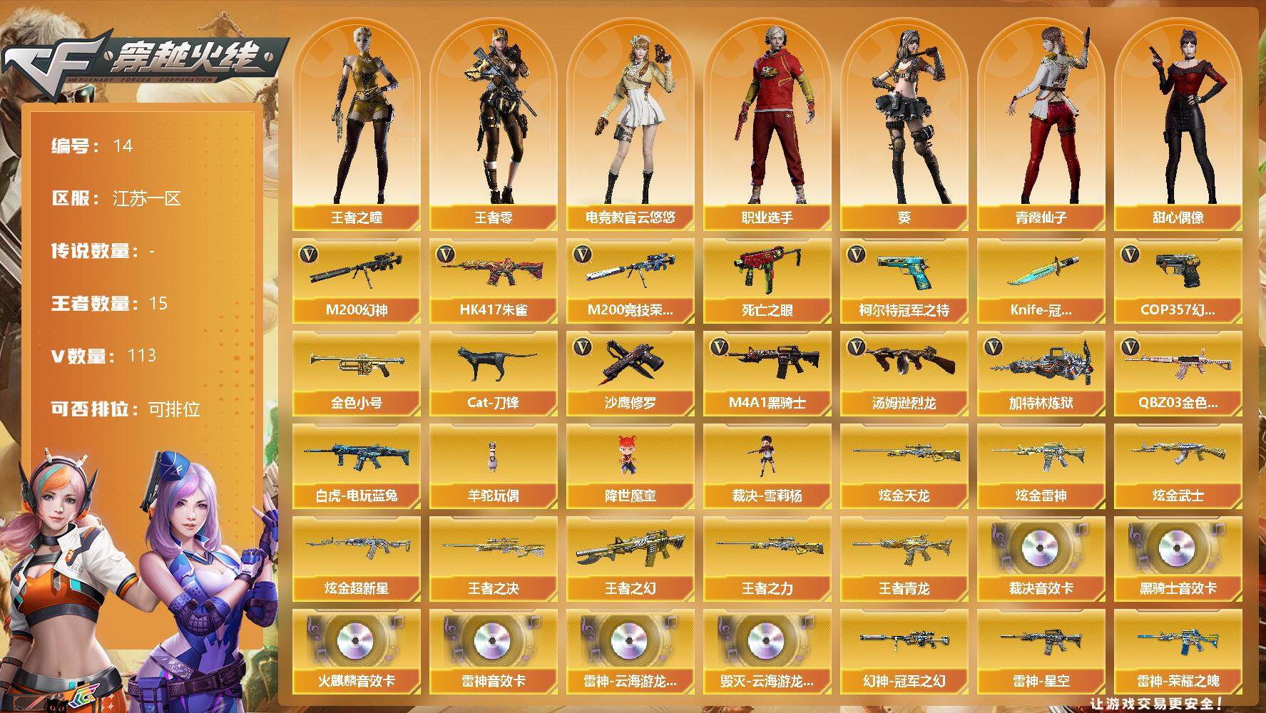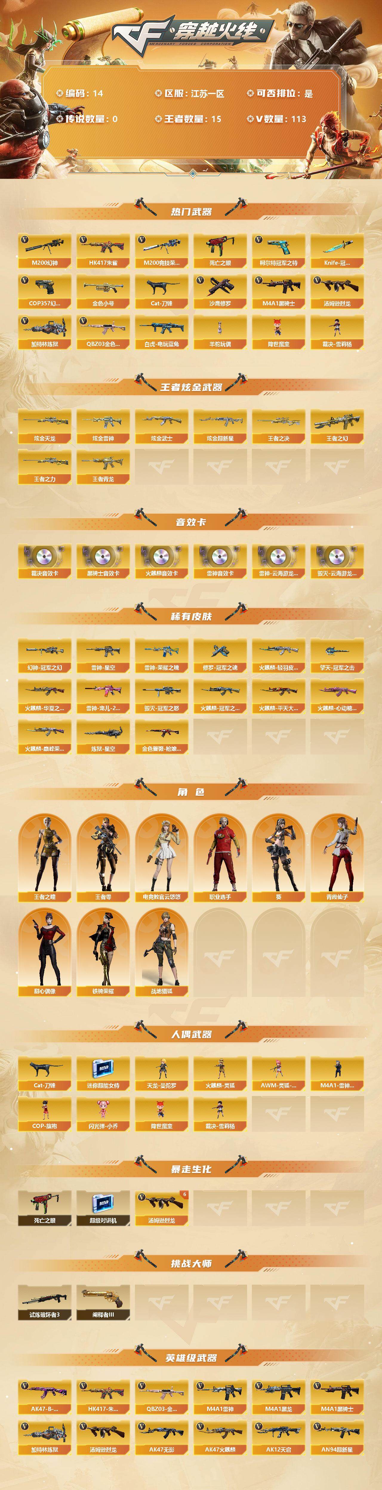 [12621863]江苏一区-113V-15王者-5炫金 【热门武器】:QBZ03-金色蔷薇,HK417-朱雀,M200-幻神*3,M200-竞技荣光,死亡之眼,白虎-电玩蓝兔,柯尔特-冠军之特,金色小号,Cat-刀锋,M4A1-黑骑士*2,汤姆逊-烈龙*8,加特林-炼狱,羊驼玩偶,降世魔童,裁决-雪莉杨,COP 357-幻灵,沙鹰-修罗*3,Knife-冠军之刃 【王者炫金武器】:炫金天龙,炫金雷神,炫金武士*2,炫金超新星,王者之决,王者之幻,王者之力,王者青龙 【音效卡】:AK47-火麒麟音效卡,M4A1-雷神音效卡,M4A1-雷神-云海游龙音效卡,M4A1-黑骑士音效卡,Barrett-毁灭-云海游龙音效卡,AWM-裁决音效卡 【稀有皮肤】:幻神-冠军之幻,金色蔷薇-枪娘阿敏 皮肤,雷神-荣耀之魄,雷神-星空,雷神-宠儿-2019MVP,火麒麟-冠军之心,火麒麟-华夏之心,火麒麟-轻羽皮肤,火麒麟-平天大圣,火麒麟-巅峰荣耀,火麒麟-心动糖果,炼狱-星空,毁灭-冠军之怒,修罗-冠军之魂,擎天-冠军之击 【角色】:王者-零,王者之瞳,葵,电竞教官-云悠悠,战地猎狐,铁骑荣耀,职业选手,青霞仙子,甜心偶像 【人偶武器】:降世魔童,裁决-雪莉杨,天龙-曼陀罗,火麒麟-灵狐,AWM-灵狐-15周年嘉年华,M4A1-雷神-精英刀锋,COP-旗袍,Cat-刀锋,迷你超能女侍,闪光弹-小乔 【暴走生化】:死亡之眼,超级对讲机 【挑战大师】:阐释者III,试炼破坏者III 【英雄级武器】:M200-竞技荣光,柯尔特-竞技荣光,擎天-竞技荣光*2,高爆手雷-竞技荣光*9,烟雾弹-竞技荣光*9,闪光弹-竞技荣光*10,COP 357-幻灵,QBZ03-金色蔷薇,HK417-朱雀,白虎-电玩蓝兔,无影-神兵利器,M4A1-雷神*2,M4A1-黑龙,M4A1-黑骑士*2,加特林-炼狱,汤姆逊-烈龙*8,AK47-无影*2,AK47-火麒麟*8,AK12-天启,AN94-超新星,AWM-天龙,Barrett-毁灭,Barrett-极光,AWM-裁决,AK47-机械迷城,AA-12-雷霆*2,M200-幻神*3,AK47-黑鲨*2,AK-47-猩红传说*3,AK47-B-战神,AK47-B-常胜将军,M4A1-赤狱骑士,柯尔特-冠军之特,沙鹰-修罗*3,麒麟刺*2,擎天,屠龙*3,擎天-云海游龙 【特殊