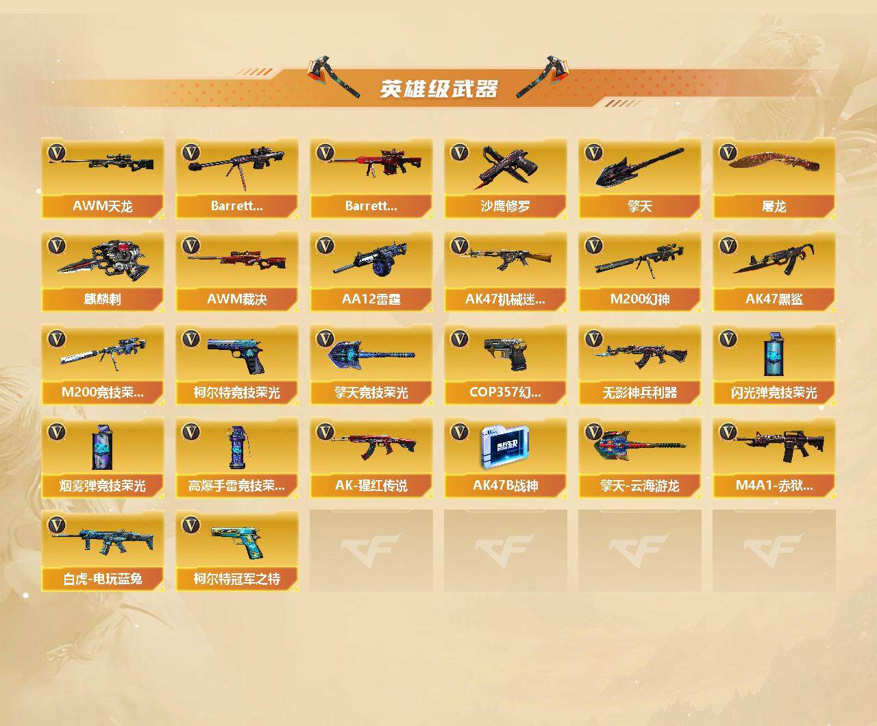 【英雄级武器】:M200-竞技荣光,柯尔特-竞技荣光,擎天-竞技荣光*2,高爆手雷-竞技荣光*9,烟雾弹-竞技荣光*9,闪光弹-竞技荣光*10,COP 357-幻灵,QBZ03-金色蔷薇,HK417-朱雀,白虎-电玩蓝兔,无影-神兵利器,M4A1-雷神*2,M4A1-黑龙,M4A1-黑骑士*2,加特林-炼狱,汤姆逊-烈龙*8,AK47-无影*2,AK47-火麒麟*8,AK12-天启,AN94-超新星,AWM-天龙,Barrett-毁灭,Barrett-极光,AWM-裁决,AK47-机械迷城,AA-12-雷霆*2,M200-幻神*3,AK47-黑鲨*2,AK-47-猩红传说*3,AK47-B-战神,AK47-B-常胜将军,M4A1-赤狱骑士,柯尔特-冠军之特,沙鹰-修罗*3,麒麟刺*2,擎天,屠龙*3,擎天-云海游龙