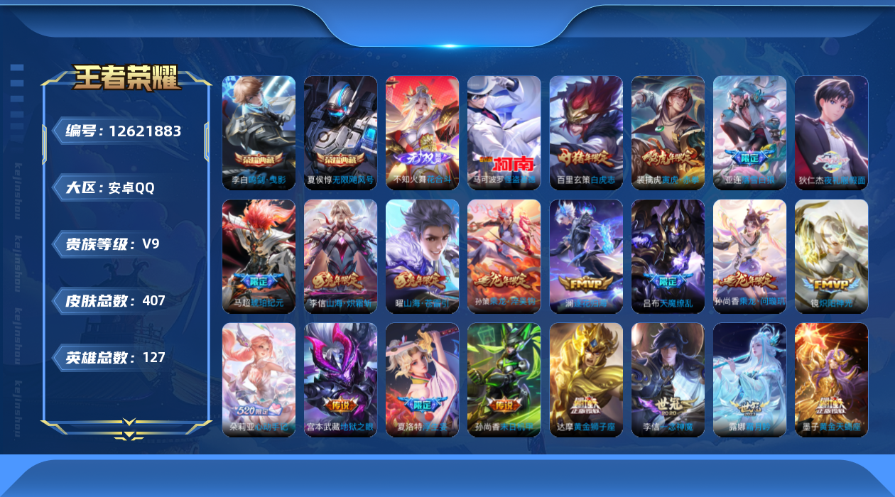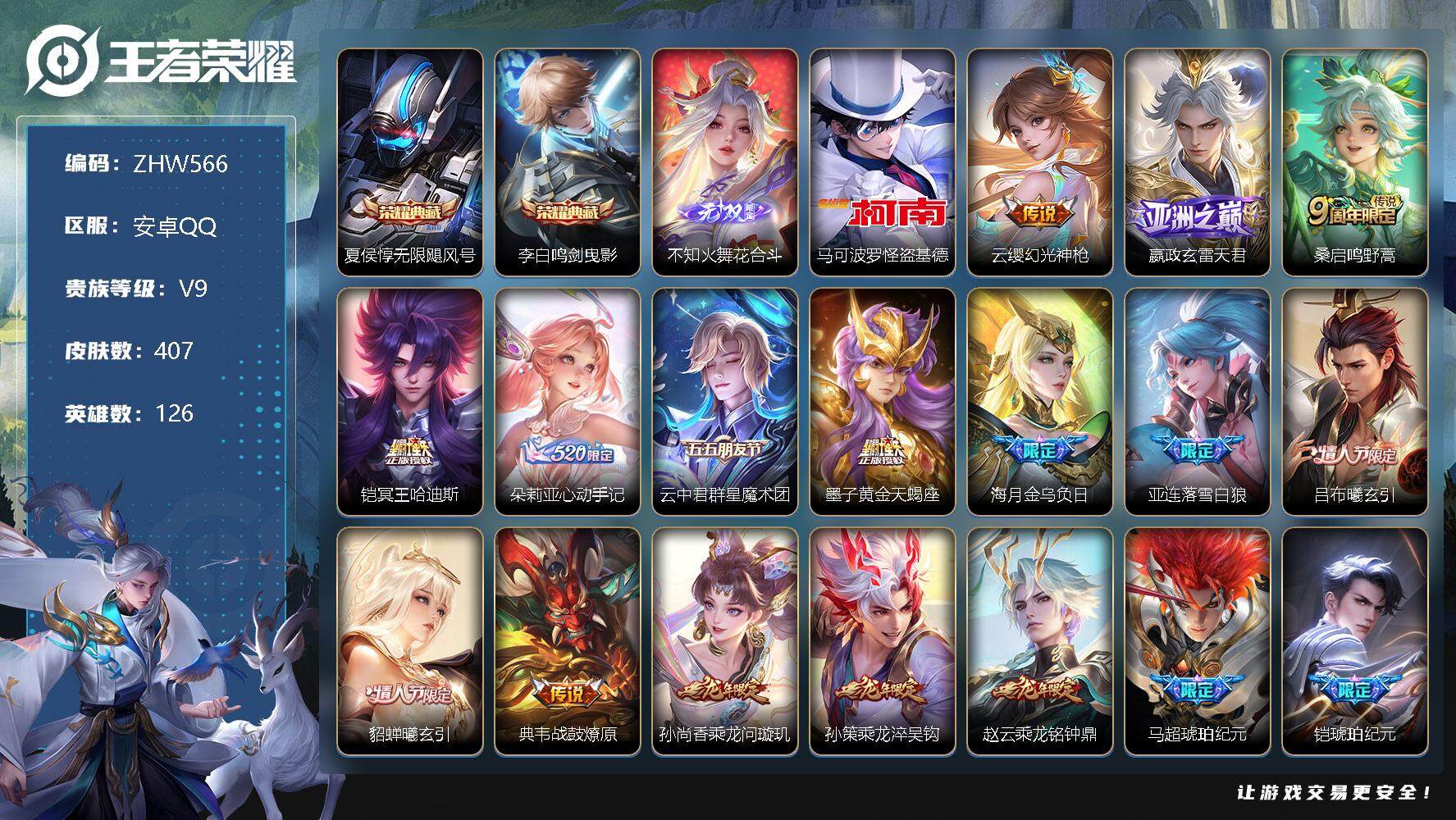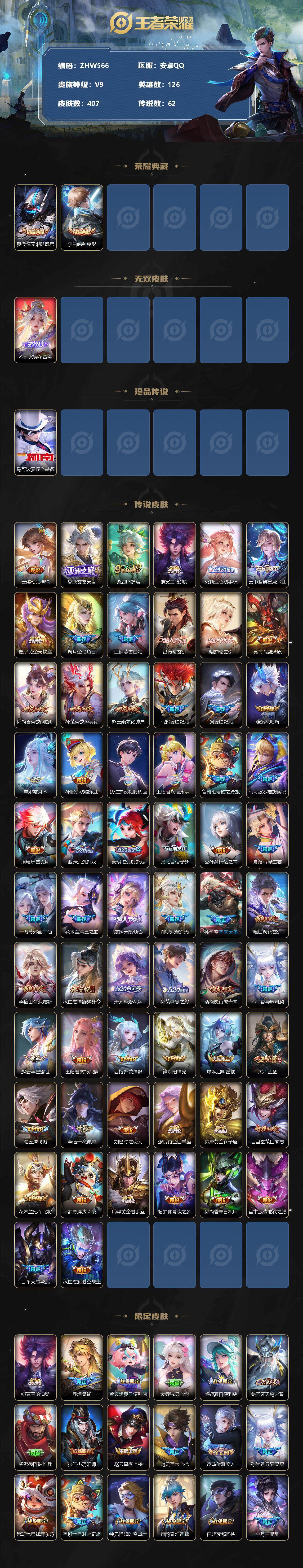 [12621883]【特价急出/详情看图】安卓Q-V9-永恒钻石II段位-126英雄-407皮肤-2典藏-1无双-1珍品传说-62传说-123史诗 英雄全皮:刘邦全皮,李信全皮,蒙恬全皮,桑启全皮,金蝉全皮,影全皮,海诺全皮,姬小满全皮,少司缘全皮 【荣耀典藏】:夏侯惇无限飓风号,李白鸣剑曳影 【无双皮肤】:不知火舞花合斗 【珍品传说】:马可波罗怪盗基德 【传说皮肤】:云缨幻光神枪,嬴政玄雷天君,桑启鸣野蒿,铠冥王哈迪斯,朵莉亚心动手记,云中君群星魔术团,墨子黄金天蝎座,海月金乌负日,亚连落雪白狼,吕布曦玄引,貂蝉曦玄引,典韦战鼓燎原,孙尚香乘龙问璇玑,孙策乘龙淬吴钩,赵云乘龙铭钟鼎,马超琥珀纪元,铠琥珀纪元,澜逐花归海,露娜霜月吟,孙膑小动物乐团,狄仁杰夜礼服假面,王昭君永恒水手月亮,鲁班七号时之奇旅,马可波罗妄想实况,澜电玩雷克斯,亚瑟追逃游戏,安琪拉追逃游戏,张飞百相守梦,公孙离记忆之芯,夏洛特浮生妄,干将莫邪画中仙,花木兰燃星之曲,虞姬无限倾心,伽罗炽翼辉光,孙悟空齐天大圣,曜山海苍雷引,李信山海炽霜斩,狄仁杰神器狴犴令,大乔挚爱花嫁,孙策挚爱之约,裴擒虎寅虎赤拳,孙尚香异界灵契,赵云淬星耀世,王昭君乞巧织情,西施游龙清影,镜炽阳神光,虞姬启明星使,关羽武圣,曜云鹰飞将,李信一念神魔,刘备时之恋人,张良黄金白羊座,达摩黄金狮子座,百里玄策白虎志,花木兰冠军飞将,梦奇胖达荣荣,后羿黄金射手座,貂蝉仲夏夜之梦,孙尚香末日机甲,宫本武藏地狱之眼,吕布天魔缭乱,狄仁杰超时空战士 【限定皮肤】:铠冥王哈迪斯,暃埋骨钱,蔡文姬夏日便利店,大乔绒语心约,虞姬夏日便利店,姜子牙天穹之誓,杨戬破阵退雄兵,狄仁杰阴阳师,赵云皇家上将,赵云百木心枪,嬴政优雅恋人,孙尚香异界灵契,鲁班七号狮舞东方,鲁班七号时之奇旅,钟无艳超时空战士,扁鹊奇幻香踪,白起夜都怪侠,芈月白晶晶,吕布天魔缭乱,甄姬女儿国国王,甄姬落雪兰心,典韦蓝屏警告,马可波罗暗影游猎,马可波罗山海玄木吟,马可波罗妄想实况,狄仁杰魔术师,狄仁杰万华元夜,狄仁杰神器狴犴令,达摩沙漠行僧,项羽海滩派对,老夫子醍醐杖,老夫子航海奇遇记,关羽武圣,关羽百相守梦,安琪拉魔法小厨娘,安琪拉追逃游戏,程咬金演武夺筹,刘邦夺宝奇兵,兰陵王驯魔猎人,兰陵王金庭之子,花木兰燃星之曲,亚瑟追逃游戏,孙悟空至尊宝,孙悟空孙行者,孙悟空齐天大圣,后羿如梦令,刘备百