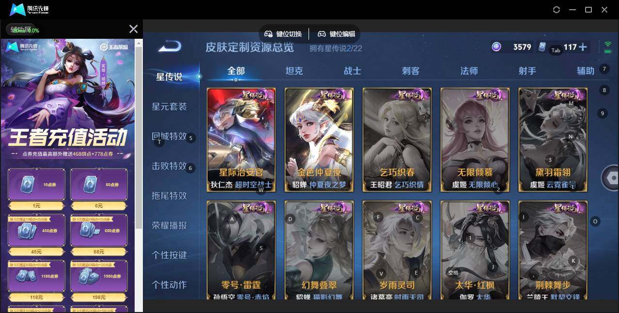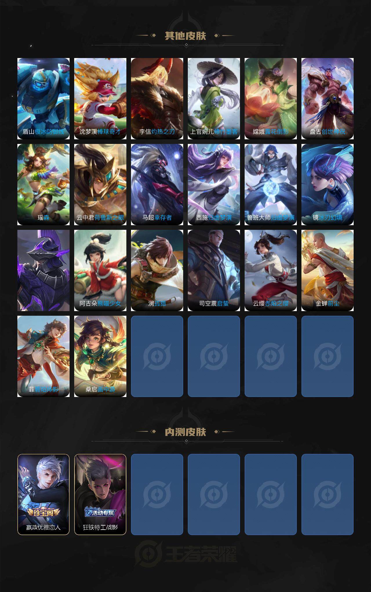 裴擒虎李小龙,关羽武圣,张飞虎魄,铠青龙志,百里玄策白虎志,后羿如梦令,孙悟空至尊宝,芈月白晶晶,安琪拉魔法小厨娘,猪八戒猪悟能,孙尚香异界灵契,孙悟空孙行者,甄姬女儿国国王,裴擒虎寅虎·赤拳,赵云百木心枪,公孙离玉兔公主,金蝉唐三藏,马可波罗山海·玄木吟,桑启鸣野蒿,艾琳陌上桑