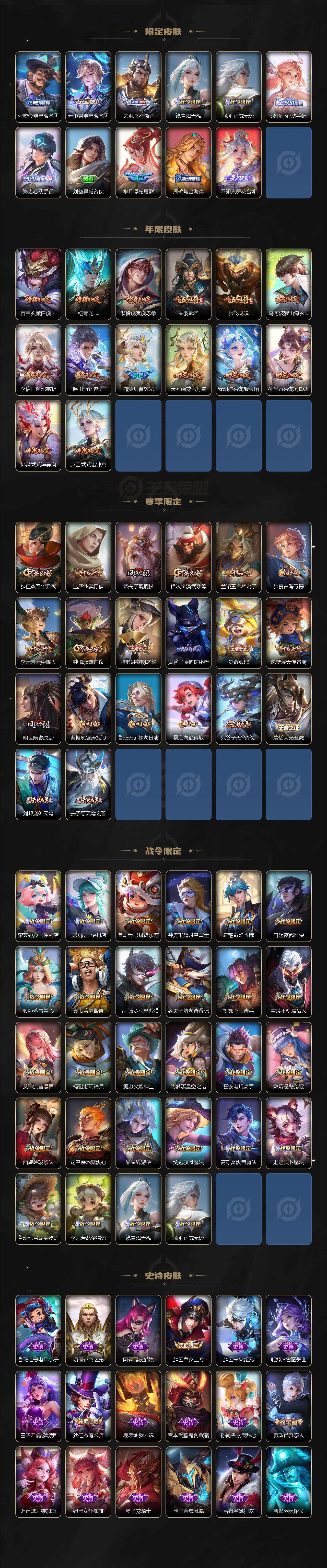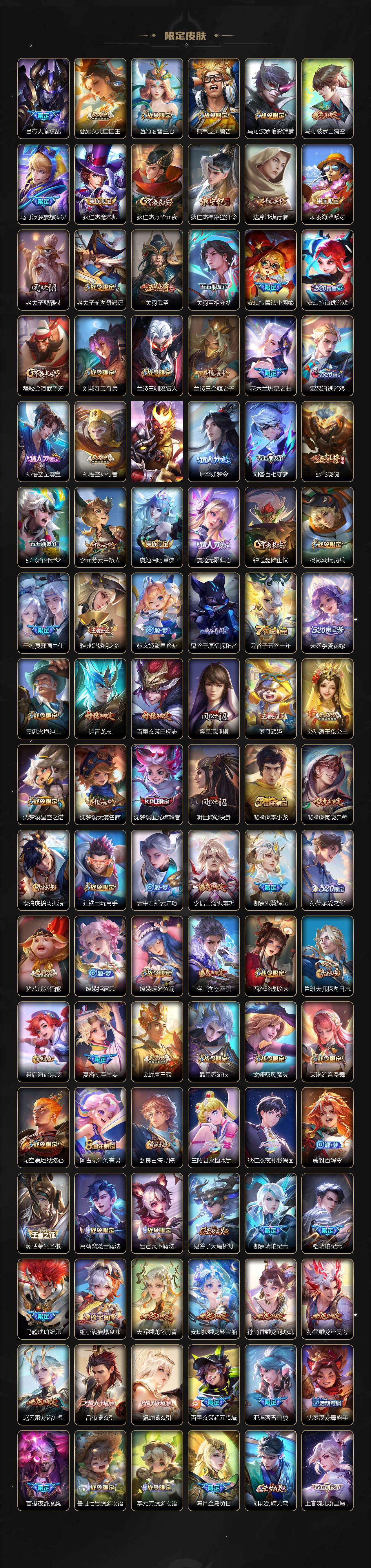 【限定皮肤】:铠冥王哈迪斯,暃埋骨钱,蔡文姬夏日便利店,大乔绒语心约,虞姬夏日便利店,姜子牙天穹之誓,杨戬破阵退雄兵,狄仁杰阴阳师,赵云皇家上将,赵云百木心枪,嬴政优雅恋人,孙尚香异界灵契,鲁班七号狮舞东方,鲁班七号时之奇旅,钟无艳超时空战士,扁鹊奇幻香踪,白起夜都怪侠,芈月白晶晶,吕布天魔缭乱,甄姬女儿国国王,甄姬落雪兰心,典韦蓝屏警告,马可波罗暗影游猎,马可波罗山海玄木吟,马可波罗妄想实况,狄仁杰魔术师,狄仁杰万华元夜,狄仁杰神器狴犴令,达摩沙漠行僧,项羽海滩派对,老夫子醍醐杖,老夫子航海奇遇记,关羽武圣,关羽百相守梦,安琪拉魔法小厨娘,安琪拉追逃游戏,程咬金演武夺筹,刘邦夺宝奇兵,兰陵王驯魔猎人,兰陵王金庭之子,花木兰燃星之曲,亚瑟追逃游戏,孙悟空至尊宝,孙悟空孙行者,孙悟空齐天大圣,后羿如梦令,刘备百