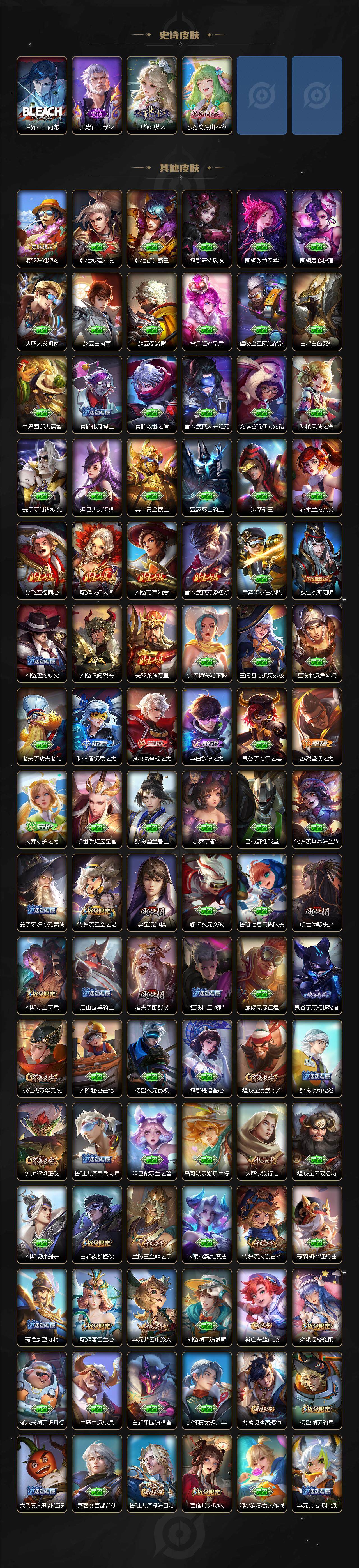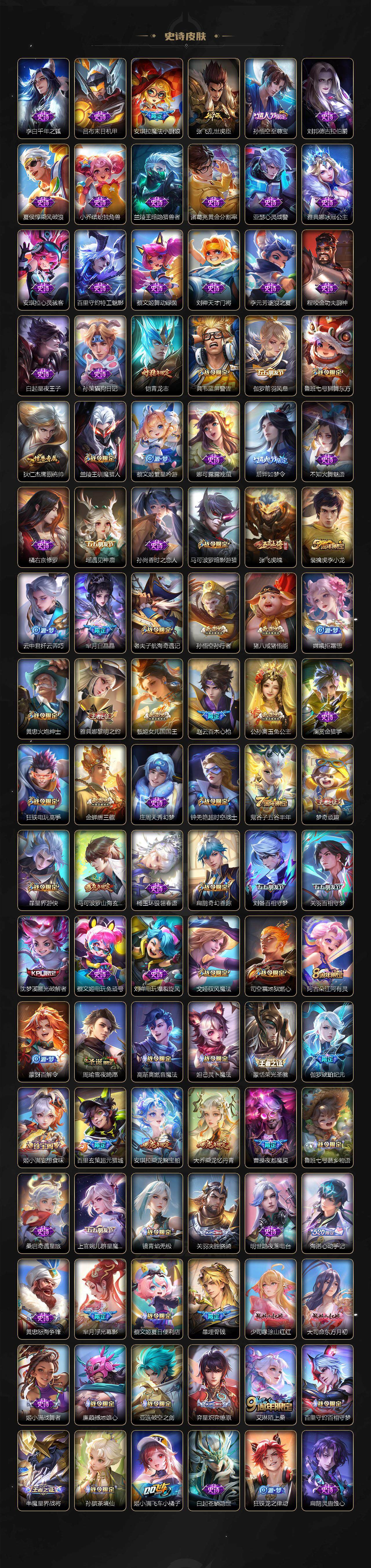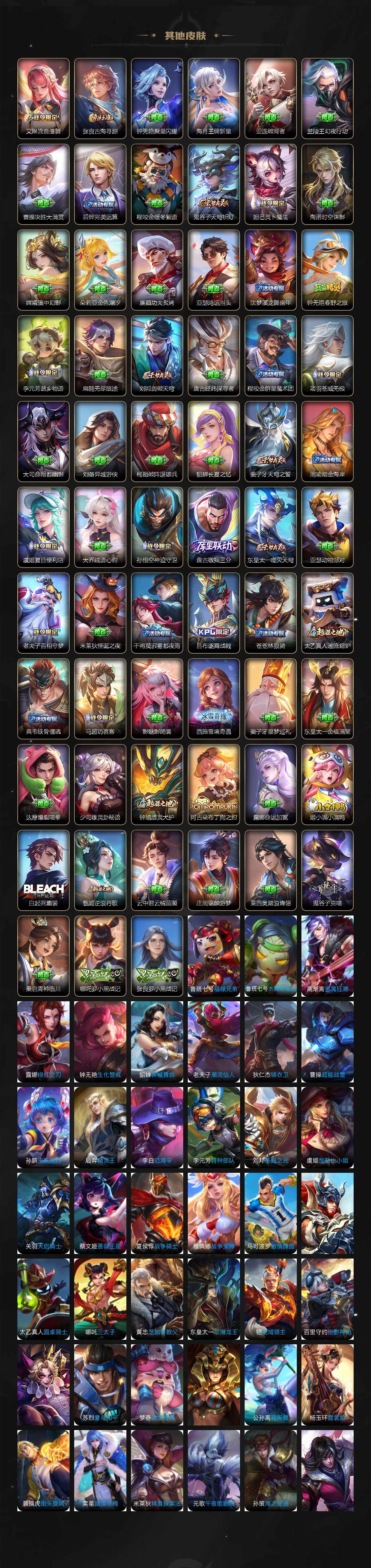 瑶遇见神鹿,娜可露露晚萤,伽罗箭羽风息,李元芳逐浪之夏,不知火舞魅语,孙策猫狗日记,诸葛亮黄金分割率,王昭君偶像歌手,项羽苍穹之光,孙尚香时之恋人,阿轲暗夜猫娘,雅典娜冰冠公主,吕布末日机甲,鲁班七号电玩小子,橘右京修罗,墨子龙骑士,刘禅天才门将,白起星夜王子,安琪拉心灵骇客,程咬金功夫厨神,刘邦德古拉伯爵,兰陵王暗隐猎兽者,曹操幽灵船长,宫本武藏鬼剑武藏,亚瑟心灵战警,蔡文姬舞动绿茵,廉颇地狱岩魂,小乔缤纷独角兽,夏侯惇乘风破浪,墨子金属风暴,吕布圣诞狂欢,百里守约特工魅影,嫦娥拒霜思,雅典娜黎明之约,李白千年之狐,澜赏金猎手,庄周天秀·幻梦,杨玉环银翎春语,刘备百相守梦,关羽百相守梦,沈梦溪匿光破解者,蔡文姬电玩·兔顽号,刘禅电玩·爆裂旋风,蒙犽百解令,周瑜雪夜绮愿,高渐离燃音魔法,伽罗琥珀纪元,大乔乘龙·忆丹青,安琪拉乘龙·聚宝船,曹操夜都魔契,桑启奇遇星旅,上官婉儿群星魔术团,关羽决胜骁骑,明世隐夜落电台,海诺心动手记,姬小满飞车小橘子,白起苍鳞隐世