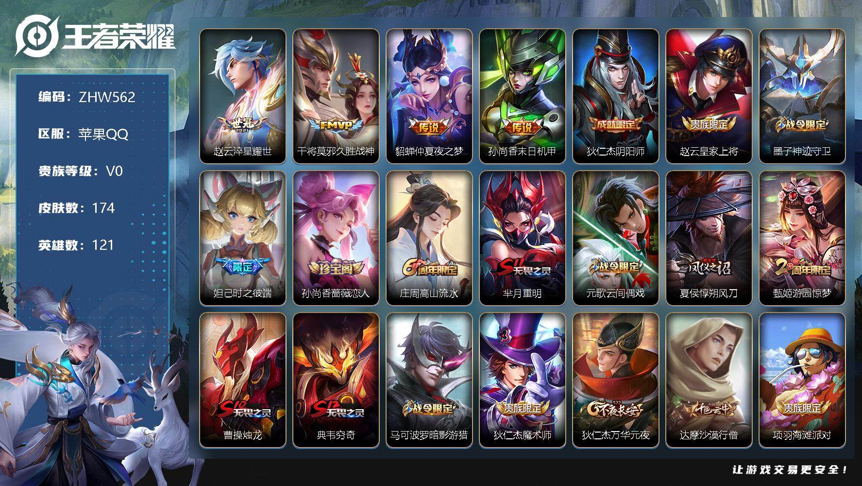 [12622512]【特价急出/详情看图】苹果Q-V0-尊贵铂金II段位-121英雄-174皮肤-4传说-47史诗 【传说皮肤】:赵云淬星耀世,干将莫邪久胜战神,貂蝉仲夏夜之梦,孙尚香末日机甲 【限定皮肤】:狄仁杰阴阳师,赵云皇家上将,墨子神迹守卫,妲己时之彼端,孙尚香蔷薇恋人,庄周高山流水,芈月重明,元歌云间偶戏,夏侯惇朔风刀,甄姬游园惊梦,曹操烛龙,典韦穷奇,马可波罗暗影游猎,狄仁杰魔术师,狄仁杰万华元夜,达摩沙漠行僧,项羽海滩派对,老夫子醍醐杖,老夫子航海奇遇记,关羽冰锋战神,程咬金演武夺筹,韩信逐梦之影,兰陵王金庭之子,亚瑟潮玩骑士王,孙悟空大圣娶亲,孙悟空孙行者,牛魔御旌,李元芳银河之约,李元芳云中旅人,虞姬霸王别姬,钟馗驱傩正仪,杨玉环遇见飞天,雅典娜单词大作战,雅典娜黎明之约,蔡文姬繁星吟游,太乙真人饕餮,鬼谷子原初探秘者,鬼谷子五谷丰年,苏烈千军破阵,百里玄策原初追逐者,弈星混沌棋,梦奇顽趣,沈梦溪星空之诺,沈梦溪大漠名商,明世隐疑决卦,裴擒虎李小龙,裴擒虎擒涛扼浪,狂铁御狮,米莱狄御霄,云中君纤云弄巧,盾山御銮,猪八戒西部大镖客,上官婉儿梁祝,蒙犽狂想玩偶喵,鲁班大师探海日志,桑启海盐诗旅 【赛季限定】:芈月重明,夏侯惇朔风刀,曹操烛龙,典韦穷奇,狄仁杰万华元夜,达摩沙漠行僧,老夫子醍醐杖,程咬金演武夺筹,兰陵王金庭之子,牛魔御旌,李元芳云中旅人,钟馗驱傩正仪,雅典娜黎明之约,太乙真人饕餮,鬼谷子原初探秘者,苏烈千军破阵,百里玄策原初追逐者,弈星混沌棋,梦奇顽趣,沈梦溪大漠名商,明世隐疑决卦,裴擒虎擒涛扼浪,狂铁御狮,米莱狄御霄,盾山御銮,鲁班大师探海日志,桑启海盐诗旅 【战令限定】:墨子神迹守卫,元歌云间偶戏,马可波罗暗影游猎,老夫子航海奇遇记,亚瑟潮玩骑士王,李元芳银河之约,雅典娜单词大作战,沈梦溪星空之诺,猪八戒西部大镖客,蒙犽狂想玩偶喵 【史诗皮肤】:赵云皇家上将,貂蝉圣诞恋歌,甄姬冰雪圆舞曲,狄仁杰魔术师,廉颇地狱岩魂,宫本武藏鬼剑武藏,孙尚香蔷薇恋人,孙尚香水果甜心,妲己魅力维加斯,墨子金属风暴,吕布圣诞狂欢,曹操幽灵船长,李白千年之狐,虞姬霸王别姬,关羽冰锋战神,花木兰水晶猎龙者,刘邦德古拉伯爵,韩信逐梦之影,兰陵王暗隐猎兽者,诸葛亮黄金分割率,甄姬游园惊梦,百里守约特工魅影,蔡文姬舞动绿茵,程咬金功夫厨神,白起星夜王子,杨玉环遇见飞天,孙策猫狗日记,