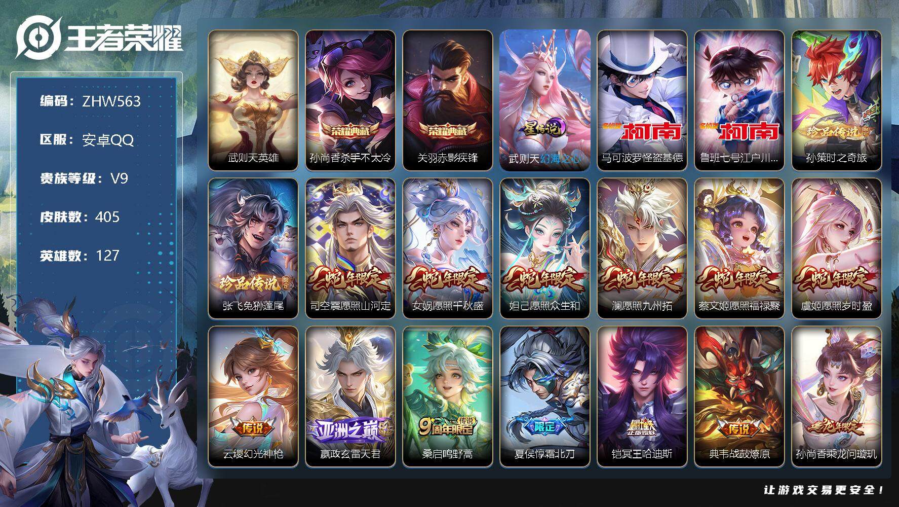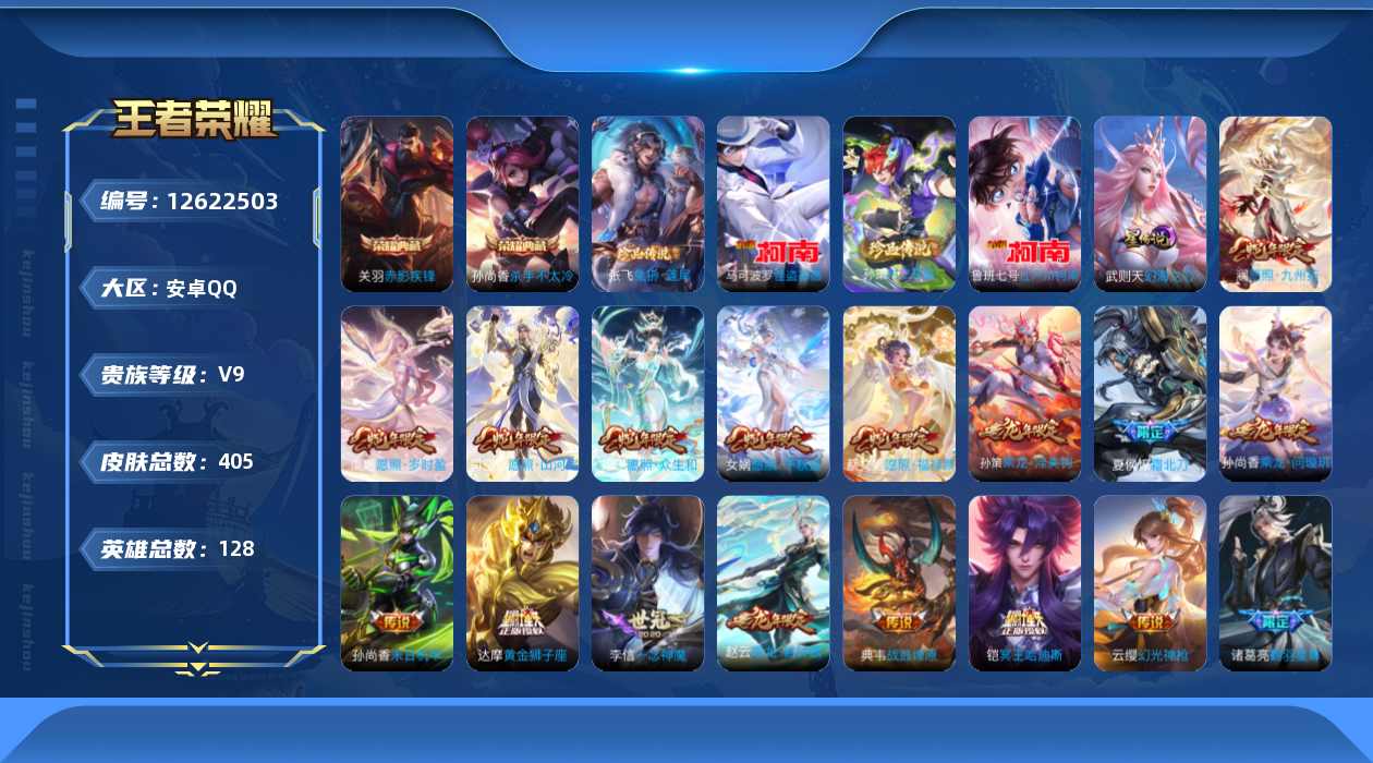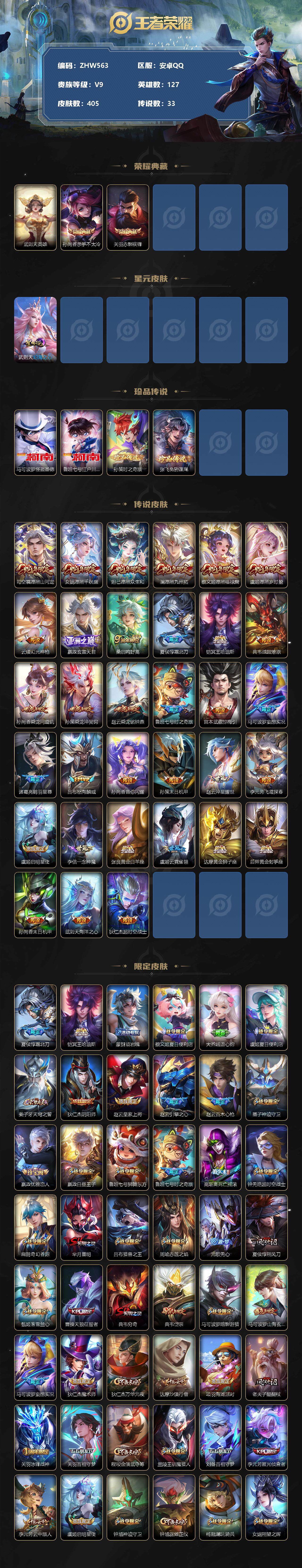 [12622503]【特价急出/详情看图】安卓Q-V9-至尊星耀II段位-127英雄-405皮肤-2典藏-4珍品传说-33传说-121史诗 【英雄全皮】:嬴政全皮,钟馗全皮,苍全皮,哪吒全皮,蒙犽全皮,蒙恬全皮,空空儿全皮,影全皮 【荣耀典藏】:武则天英雄,孙尚香杀手不太冷,关羽赤影疾锋 【珍品传说】:马可波罗怪盗基德,鲁班七号江户川柯南,孙策时之奇旅,张飞兔狲蓬尾 【传说皮肤】:司空震愿照山河定,女娲愿照千秋盛,妲己愿照众生和,澜愿照九州拓,蔡文姬愿照福禄聚,虞姬愿照岁时盈,云缨幻光神枪,嬴政玄雷天君,桑启鸣野蒿,夏侯惇霜北刀,铠冥王哈迪斯,典韦战鼓燎原,孙尚香乘龙问璇玑,孙策乘龙淬吴钩,赵云乘龙铭钟鼎,鲁班七号时之奇旅,宫本武藏惊梅引,马可波罗妄想实况,诸葛亮鹤羽星尊,吕布怒海麟威,孙尚香音你闪耀,孙策末日机甲,赵云淬星耀世,李元芳飞鸢探春,虞姬启明星使,李信一念神魔,张良黄金白羊座,虞姬云霓雀翎,达摩黄金狮子座,后羿黄金射手座,孙尚香末日机甲,武则天海洋之心,狄仁杰超时空战士 【限定皮肤】:夏侯惇霜北刀,铠冥王哈迪斯,蒙犽顽岩魄,蔡文姬夏日便利店,大乔绒语心约,虞姬夏日便利店,姜子牙天穹之誓,狄仁杰阴阳师,赵云皇家上将,赵云引擎之心,赵云百木心枪,墨子神迹守卫,嬴政优雅恋人,嬴政白昼王子,鲁班七号狮舞东方,鲁班七号时之奇旅,高渐离死亡摇滚,钟无艳超时空战士,扁鹊奇幻香踪,芈月重明,吕布猎兽之王,周瑜赤莲之焰,元歌无心,夏侯惇朔风刀,甄姬落雪兰心,曹操天狼征服者,典韦穷奇,典韦岱宗,马可波罗暗影游猎,马可波罗山海玄木吟,马可波罗妄想实况,狄仁杰魔术师,狄仁杰万华元夜,达摩沙漠行僧,项羽海滩派对,老夫子醍醐杖,关羽冰锋战神,关羽百相守梦,程咬金演武夺筹,兰陵王驯魔猎人,刘备百相守梦,李元芳匿光侦查者,李元芳云中旅人,虞姬启明星使,钟馗神迹守卫,钟馗驱傩正仪,杨戬潮玩骑兵,女娲朔望之晖,哪吒逐梦之翼,雅典娜黎明之约,蔡文姬繁星吟游,鬼谷子原初探秘者,鬼谷子五谷丰年,诸葛亮鹤羽星尊,黄忠烈魂,苏烈玄武志,百里玄策原初追逐者,弈星混沌棋,梦奇顽趣,沈梦溪星空之诺,沈梦溪大漠名商,明世隐疑决卦,裴擒虎李小龙,裴擒虎擒涛扼浪,狂铁御狮,米莱狄御霄,云中君纤云弄巧,伽罗天狼溯光者,盾山御銮,猪八戒西部大镖客,上官婉儿梁祝,上官婉儿神器万象笔,蒙犽狂想玩偶喵,鲁班大师探海日志,桑启海盐诗旅,艾琳