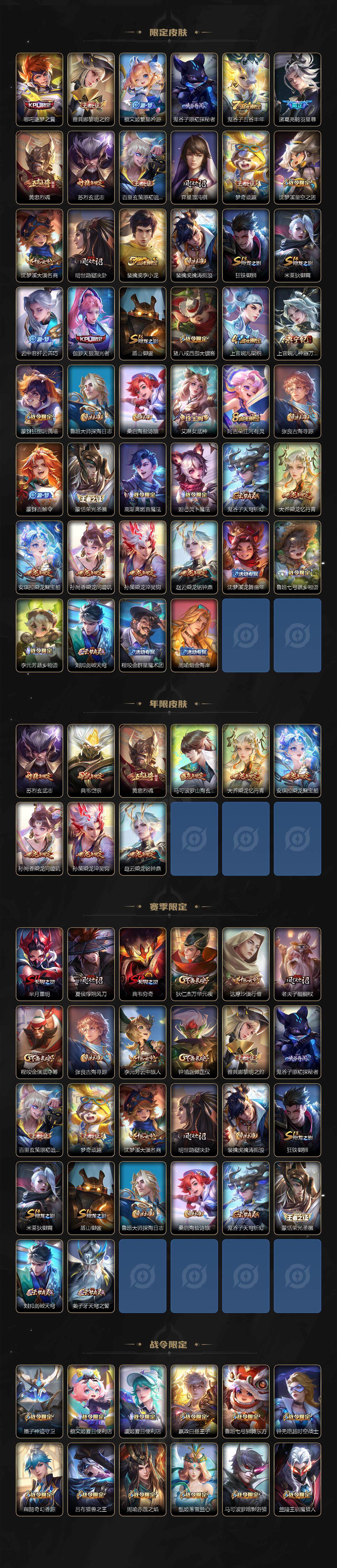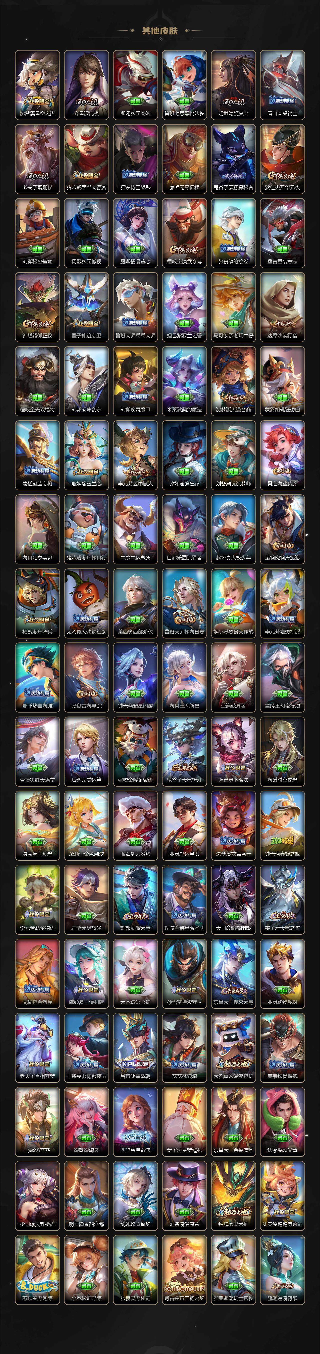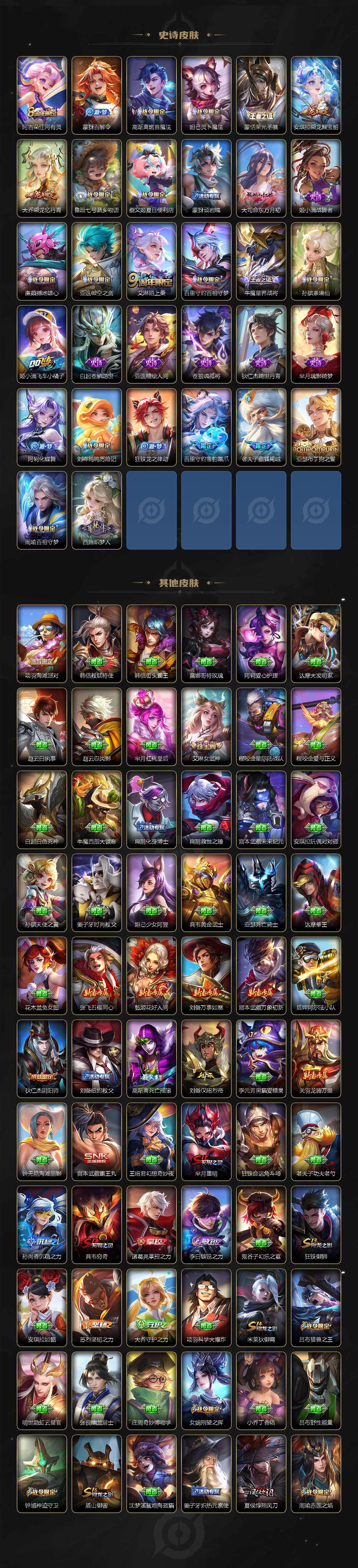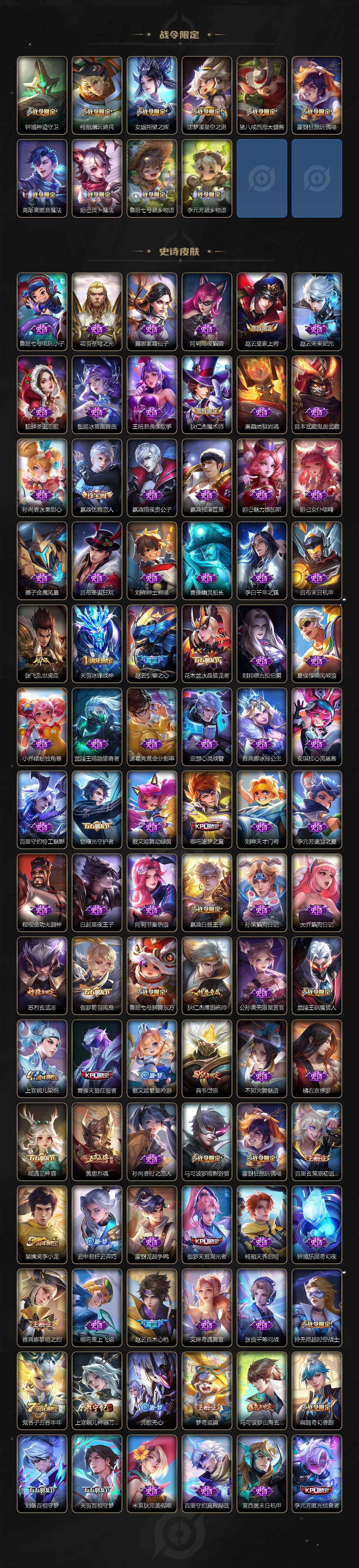 【限定皮肤】:夏侯惇霜北刀,铠冥王哈迪斯,蒙犽顽岩魄,蔡文姬夏日便利店,大乔绒语心约,虞姬夏日便利店,姜子牙天穹之誓,狄仁杰阴阳师,赵云皇家上将,赵云引擎之心,赵云百木心枪,墨子神迹守卫,嬴政优雅恋人,嬴政白昼王子,鲁班七号狮舞东方,鲁班七号时之奇旅,高渐离死亡摇滚,钟无艳超时空战士,扁鹊奇幻香踪,芈月重明,吕布猎兽之王,周瑜赤莲之焰,元歌无心,夏侯惇朔风刀,甄姬落雪兰心,曹操天狼征服者,典韦穷奇,典韦岱宗,马可波罗暗影游猎,马可波罗山海玄木吟,马可波罗妄想实况,狄仁杰魔术师,狄仁杰万华元夜,达摩沙漠行僧,项羽海滩派对,老夫子醍醐杖,关羽冰锋战神,关羽百相守梦,程咬金演武夺筹,兰陵王驯魔猎人,刘备百相守梦,李元芳匿光侦查者,李元芳云中旅人,虞姬启明星使,钟馗神迹守卫,钟馗驱傩正仪,杨戬潮玩骑兵,女娲朔望之晖,哪吒逐梦之翼,雅典娜黎明之约,蔡文姬繁星吟游,鬼谷子原初探秘者,鬼谷子五谷丰年,诸葛亮鹤羽星尊,黄忠烈魂,苏烈玄武志,百里玄策原初追逐者,弈星混沌棋,梦奇顽趣,沈梦溪星空之诺,沈梦溪大漠名商,明世隐疑决卦,裴擒虎李小龙,裴擒虎擒涛扼浪,狂铁御狮,米莱狄御霄,云中君纤云弄巧,伽罗天狼溯光者,盾山御銮,猪八戒西部大镖客,上官婉儿梁祝,上官婉儿神器万象笔,蒙犽狂想玩偶喵,鲁班大师探海日志,桑启海盐诗旅,艾琳