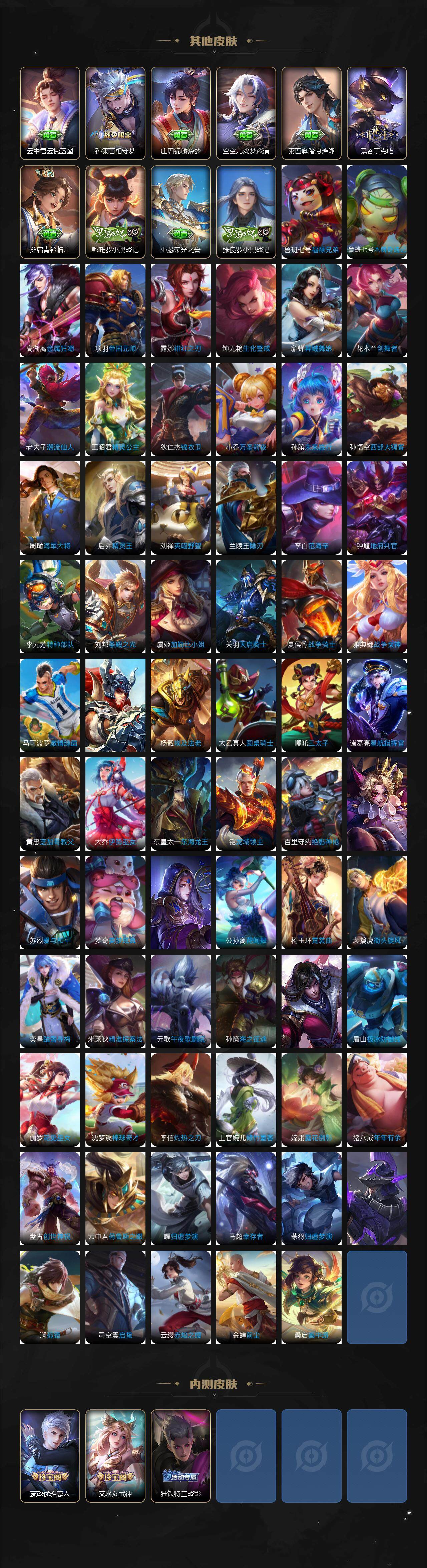 瑶遇见神鹿,伽罗箭羽风息,李元芳逐浪之夏,不知火舞魅语,公孙离无限星赏官,大乔猫狗日记,孙策猫狗日记,阿轲节奏热浪,露娜紫霞仙子,诸葛亮黄金分割率,王昭君偶像歌手,项羽苍穹之光,孙尚香时之恋人,阿轲暗夜猫娘,雅典娜冰冠公主,吕布末日机甲,鲁班七号电玩小子,蒙犽龙鼓争鸣,橘右京修罗,嬴政摇滚巨星,刘禅绅士熊喵,刘禅天才门将,白起星夜王子,安琪拉心灵骇客,程咬金功夫厨神,刘邦德古拉伯爵,兰陵王暗隐猎兽者,曹操幽灵船长,宫本武藏鬼剑武藏,亚瑟心灵战警,钟馗乐园奇幻夜,杨戬天秀·启明,蔡文姬舞动绿茵,廉颇地狱岩魂,小乔缤纷独角兽,夏侯惇乘风破浪,花木兰水晶猎龙者,铠曙光守护者,墨子金属风暴,百里玄策原初追逐者,吕布圣诞狂欢,貂蝉圣诞恋歌,百里守约特工魅影,嬴政暗夜贵公子,雅典娜黎明之约,李白千年之狐,哪吒雪上飞焰,艾琳奇遇舞章,张良千筹问战,刘备百相守梦,关羽百相守梦,百里守约真我赫兹,莱西奥末日机甲,李元芳匿光侦查者,蒙犽百解令,高渐离燃音魔法,大乔乘龙·忆丹青,安琪拉乘龙·聚宝船,姬小满飞车小橘子,白起苍鳞隐世,亚连糖绘人间,苍狼魂孤将,狄仁杰绮世丹青