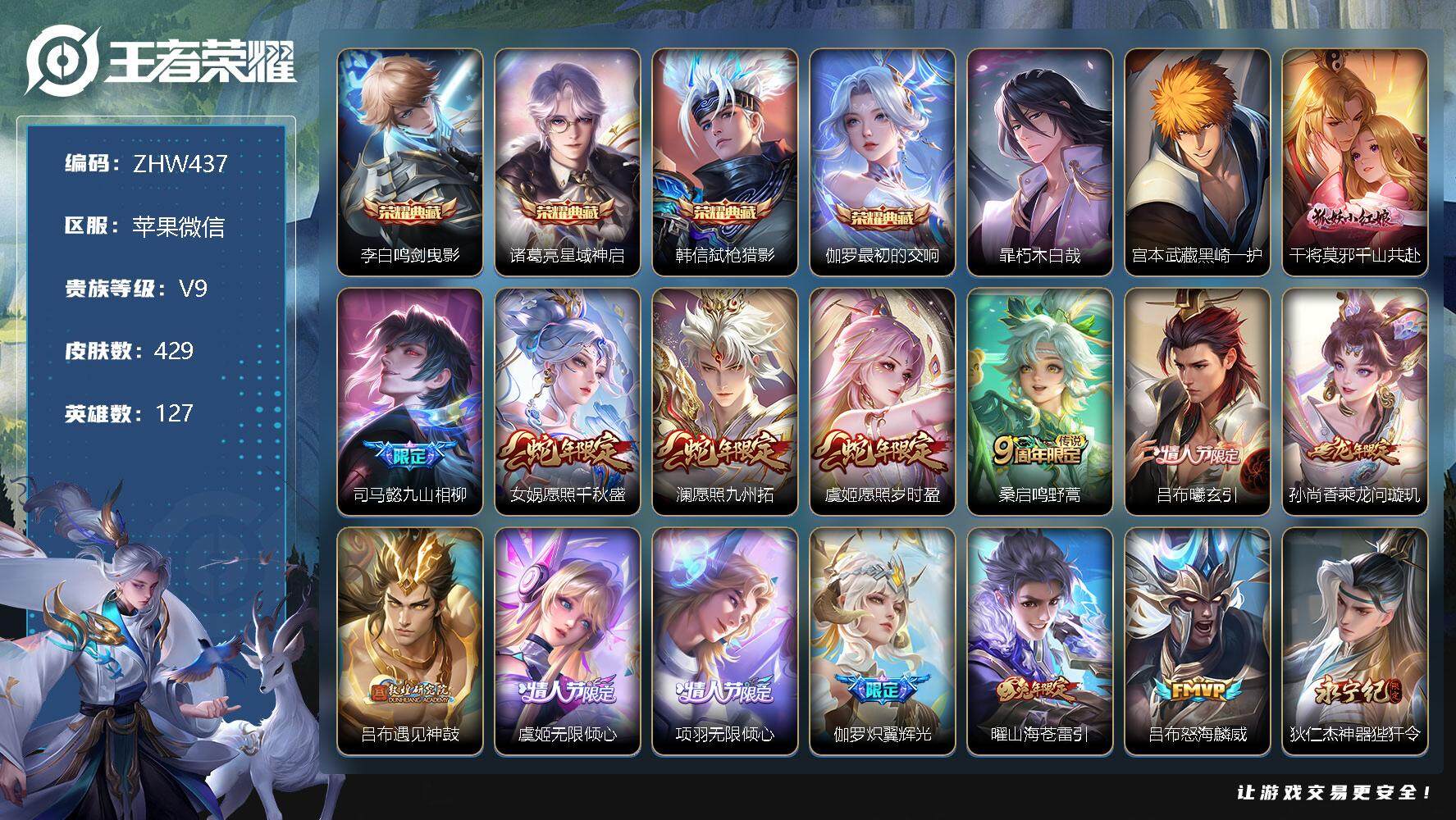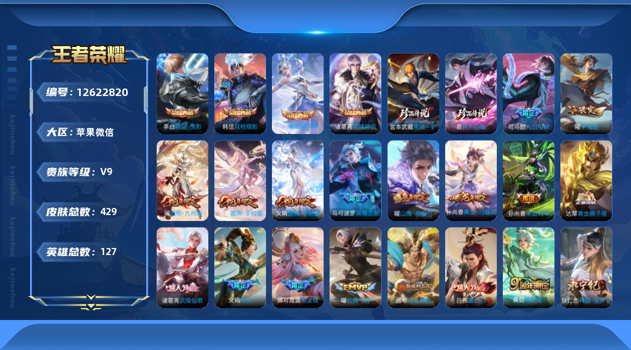 [12622820]苹果WX-V9-至尊星耀IV段位-127英雄-429皮肤-4典藏-2珍品传说-33传说-137史诗 【英雄全皮】:司马懿全皮,女娲全皮,鬼谷子全皮,沈梦溪全皮,狂铁全皮,鲁班大师全皮,金蝉全皮,莱西奥全皮,空空儿全皮,影全皮,少司缘全皮 【荣耀典藏】:李白鸣剑曳影,诸葛亮星域神启,韩信弑枪猎影,伽罗最初的交响 【珍品传说】:暃朽木白哉,宫本武藏黑崎一护 【传说皮肤】:干将莫邪千山共赴,司马懿九山相柳,女娲愿照千秋盛,澜愿照九州拓,虞姬愿照岁时盈,桑启鸣野蒿,吕布曦玄引,孙尚香乘龙问璇玑,吕布遇见神鼓,虞姬无限倾心,项羽无限倾心,伽罗炽翼辉光,曜山海苍雷引,吕布怒海麟威,狄仁杰神器狴犴令,娜可露露前尘镜,孙尚香音你闪耀,马可波罗深海之息,后羿无尽星芒,孙策挚爱之约,露娜启示之音,女娲补天,曜李逍遥 ,李元芳飞鸢探春,虞姬启明星使,曜云鹰飞将,张良黄金白羊座,达摩黄金狮子座,梦奇胖达荣荣,后羿黄金射手座,诸葛亮武陵仙君,孙尚香末日机甲,狄仁杰超时空战士 【限定皮肤】:白起狰,大乔绒语心约,姜子牙天穹之誓,狄仁杰阴阳师,廉颇寅虎御盾,赵云皇家上将,赵云引擎之心,赵云龙胆,赵云百木心枪,墨子神迹守卫,孙尚香蔷薇恋人,鲁班七号狮舞东方,鲁班七号乒乒小将,庄周高山流水,钟无艳超时空战士,白起夜都怪侠,芈月重明,芈月幻夜卜梦,吕布御风骁将,吕布遇见神鼓,周瑜赤莲之焰,元歌云间偶戏,元歌无心,夏侯惇朔风刀,夏侯惇匿光决锋者,甄姬女儿国国王,甄姬游园惊梦,甄姬落雪兰心,典韦穷奇,马可波罗暗影游猎,马可波罗深海之息,马可波罗山海玄木吟,狄仁杰魔术师,狄仁杰万华元夜,狄仁杰神器狴犴令,达摩沙漠行僧,项羽海滩派对,项羽无限倾心,老夫子航海奇遇记,程咬金演武夺筹,露娜启示之音,韩信逐梦之影,韩信傲雪梅枪,王昭君午后时光,兰陵王驯魔猎人,兰陵王金庭之子,娜可露露前尘镜,孙悟空至尊宝,孙悟空孙行者,牛魔奔雷神使,后羿圣弓游侠,后羿无尽星芒,李元芳云中旅人,虞姬霸王别姬,虞姬启明星使,虞姬无限倾心,钟馗驱傩正仪,杨玉环遇见飞天,女娲朔望之晖,女娲补天,干将莫邪真爱魔法,雅典娜单词大作战,雅典娜黎明之约,太乙真人饕餮,太乙真人华丽摇滚,鬼谷子原初探秘者,鬼谷子五谷丰年,诸葛亮武陵仙君,大乔白鹤梁神女,黄忠烈魂,黄忠火炮绅士,苏烈千军破阵,百里玄策原初追逐者,梦奇顽趣,公孙离玉兔公主,沈梦溪星空之诺