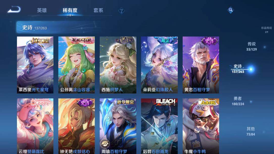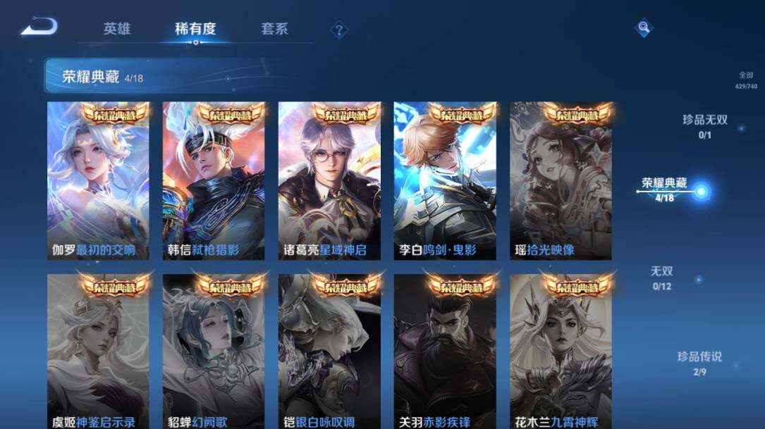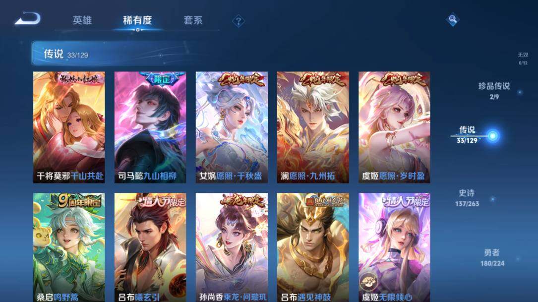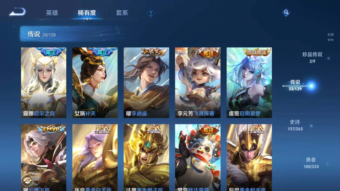 - PX_2104954-Q/最强王者/336皮肤/126英雄/9典藏/0珍品无双/3无双/0珍品传说/48传说/90史诗/10稀有英雄 【9 典藏皮肤】鸣剑·曳影 李白,全息碎影 孙悟空,天鹅之梦 小乔,倪克斯神谕 武则天,星空梦想 鲁班七号,无限飓风号 夏侯惇,九霄神辉 花木兰,大秦宣太后 芈月,星域神启 诸葛亮, 【3 无双皮肤】离恨烟 公孙离,花合斗 不知火舞,群星魔术团 韩信, 【48 传说